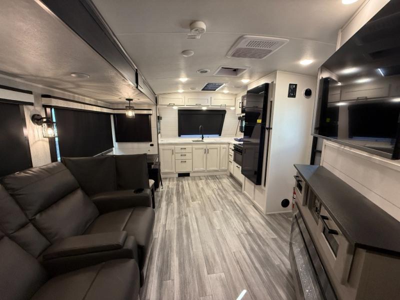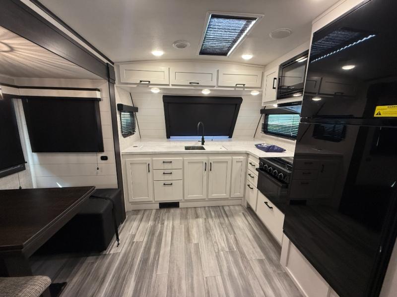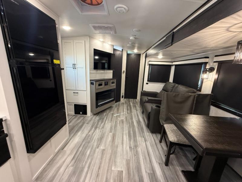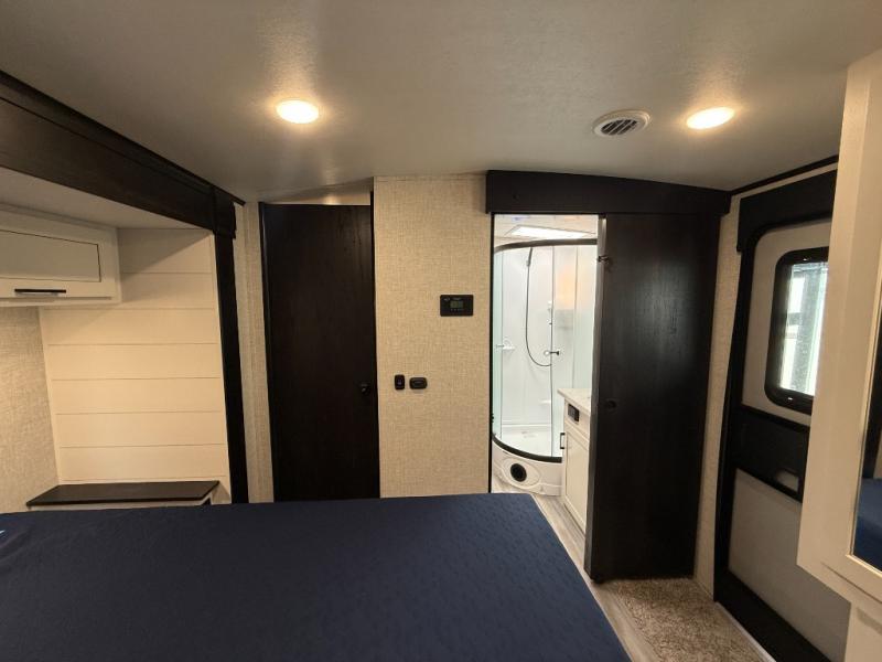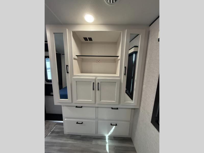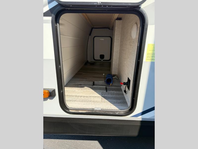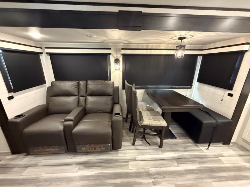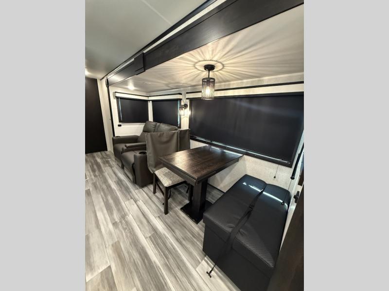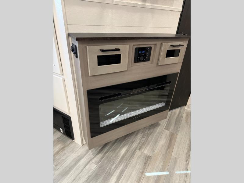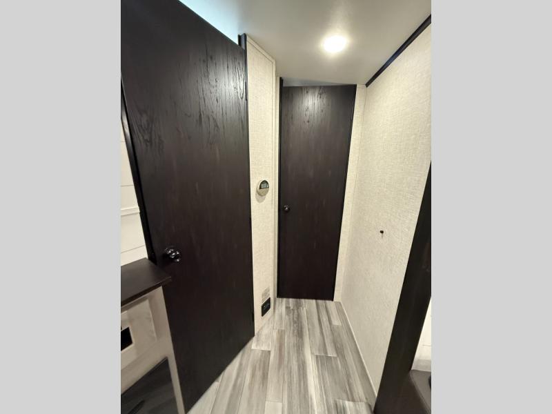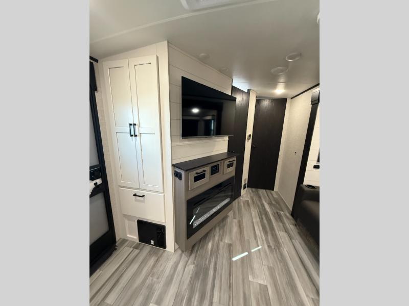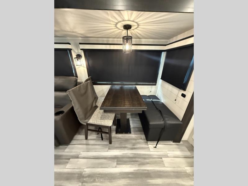 You will experience a smooth flow of traffic in and out of this travel trailer with dual entry doors! The rear private bedroom has one of the entrance/exit doors so you can sneak out for an early morning fishing trip, a queen bed slide for more space, and a wardrobe for your clothes. The full bathroom has a radius shower to clean up in and handy storage areas like a linen closet, a medicine cabinet, and a shelf. Grab a snack from one of the two pantries and head to the theater seating with swivel tables across from the entertainment center for a relaxing movie night. The chef will love cooking in the front kitchen with all of the countertop space and three burner cooktop. It comes standard with a booth dinette, but you can switch it out for the optional table and two chairs with ottoman or the optional table and four chairs.