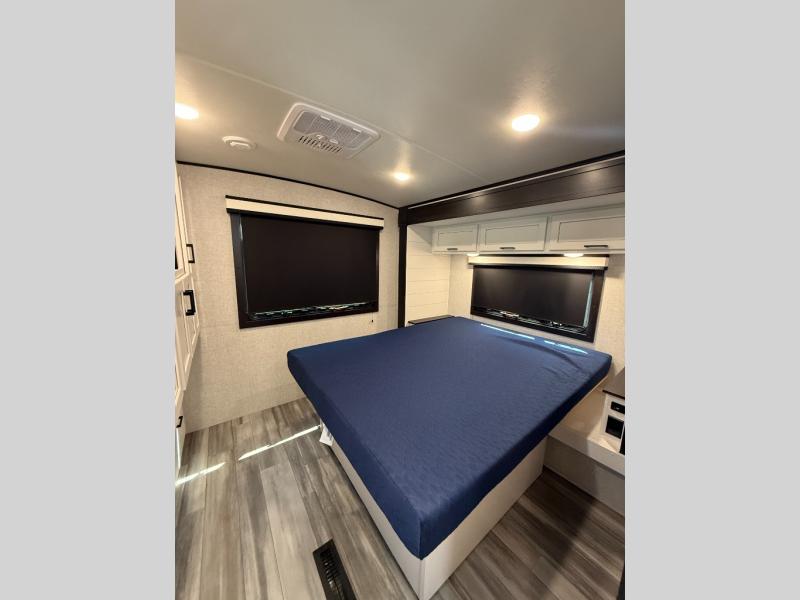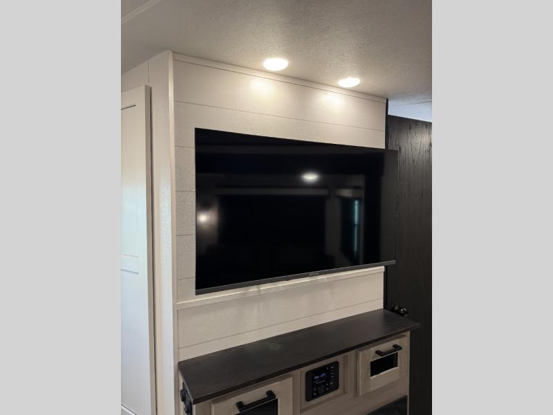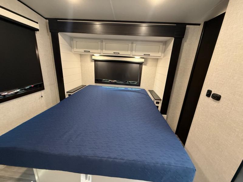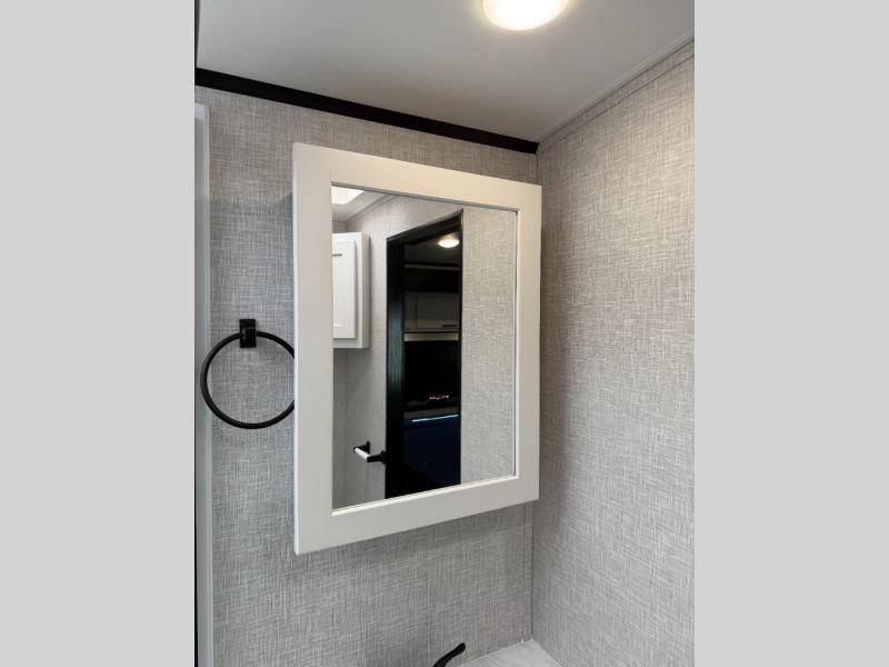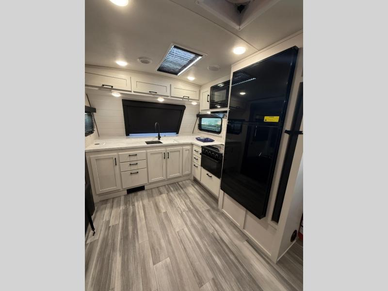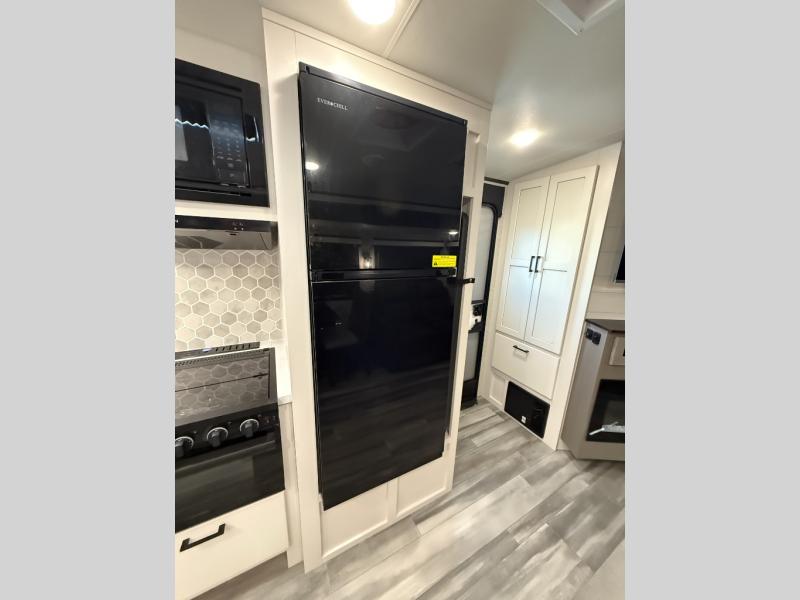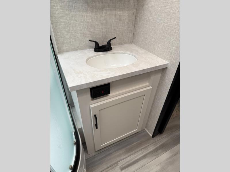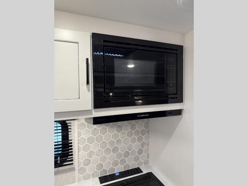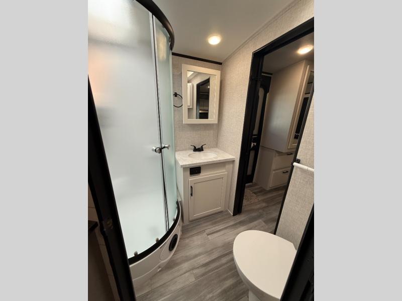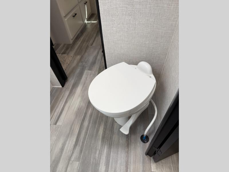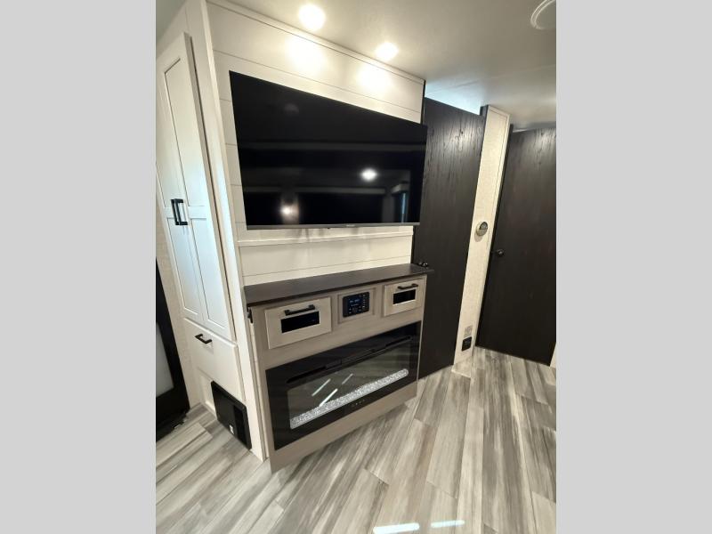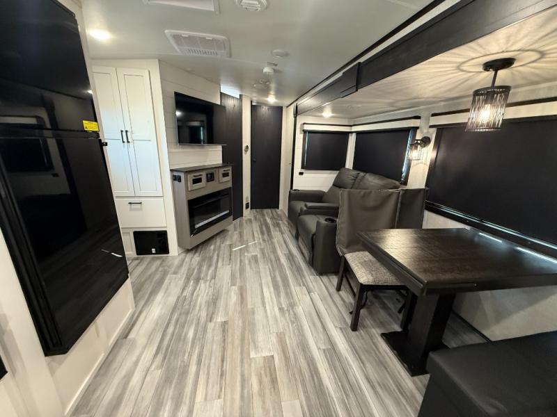You will experience a smooth flow of traffic in and out of this travel trailer with dual entry doors! The rear private bedroom has one of the entrance/exit doors so you can sneak out for an early morning fishing trip, a queen bed slide for more space, and a wardrobe for your clothes. The full bathroom has a radius shower to clean up in and handy storage areas like a linen closet, a medicine cabinet, and a shelf. Grab a snack from one of the two pantries and head to the theater seating with swivel tables across from the entertainment center for a relaxing movie night. The chef will love cooking in the front kitchen with all of the countertop space and three burner cooktop. It comes standard with a booth dinette, but you can switch it out for the optional table and two chairs with ottoman or the optional table and four chairs.