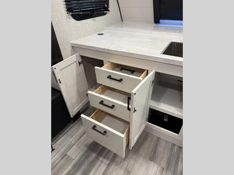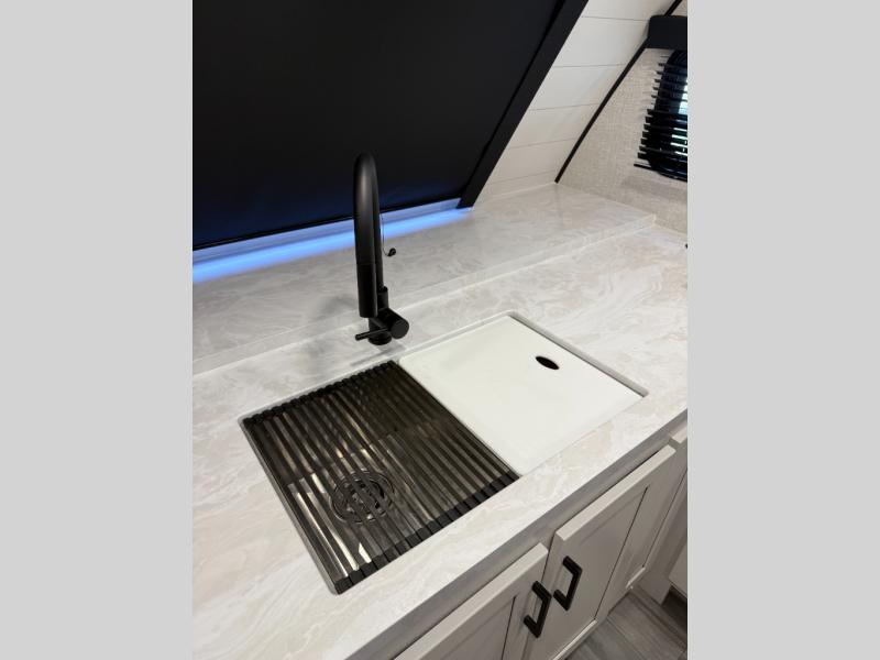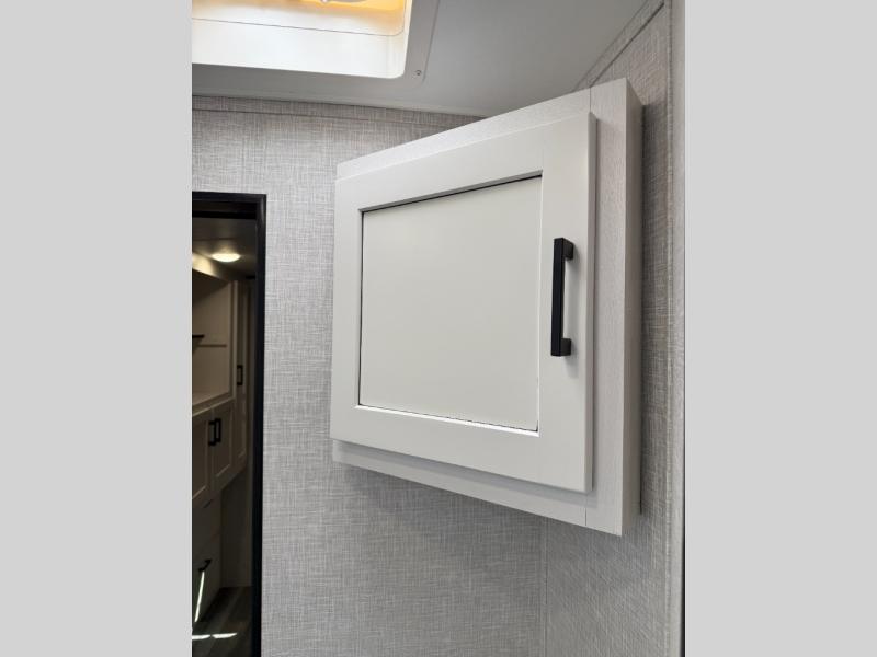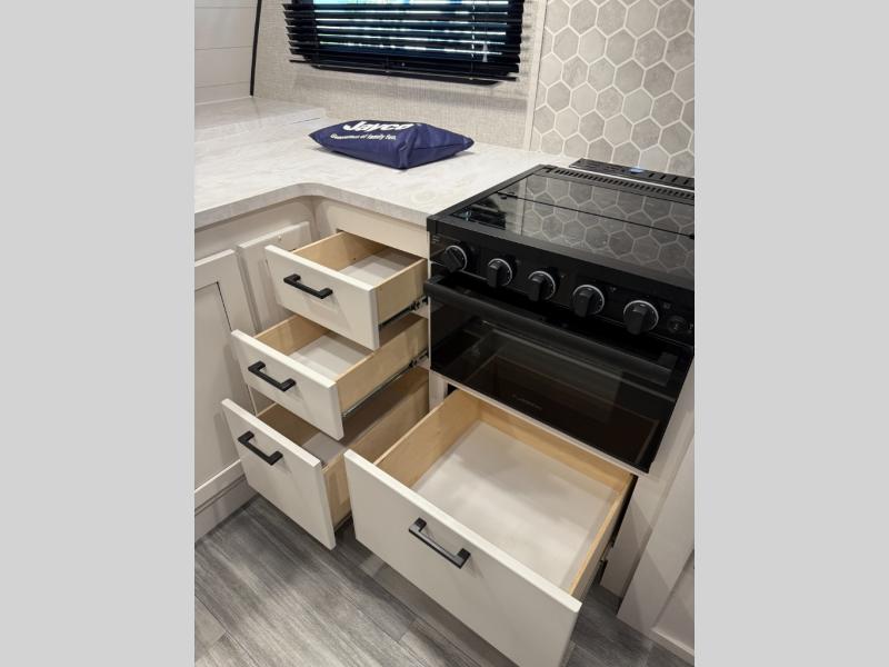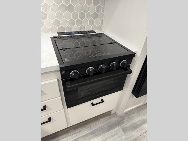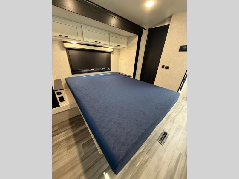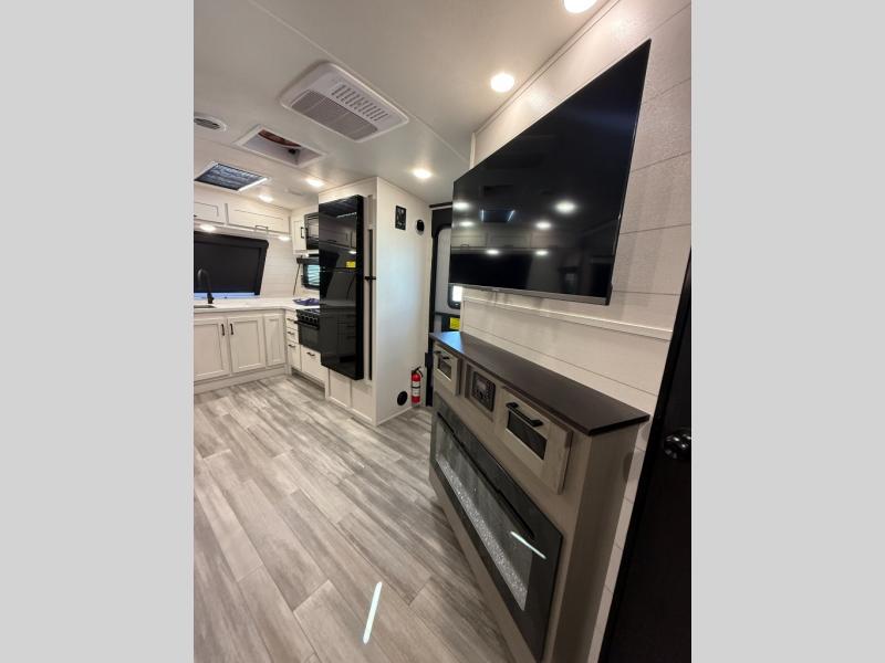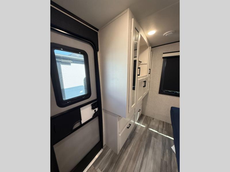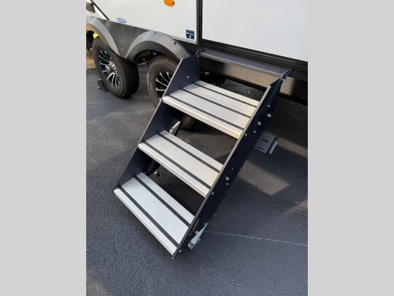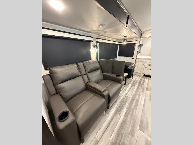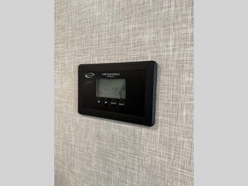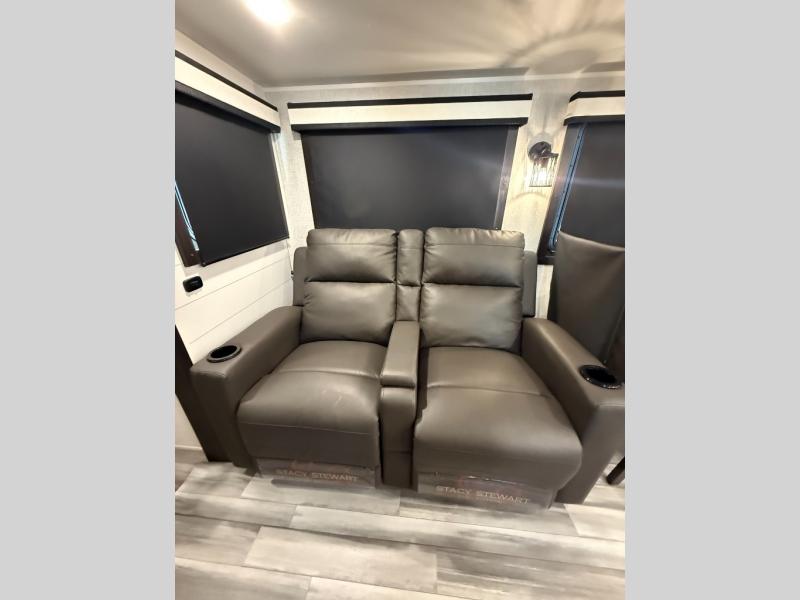 You will experience a smooth flow of traffic in and out of this travel trailer with dual entry doors! The rear private bedroom has one of the entrance/exit doors so you can sneak out for an early morning fishing trip, a queen bed slide for more space, and a wardrobe for your clothes. The full bathroom has a radius shower to clean up in and handy storage areas like a linen closet, a medicine cabinet, and a shelf. Grab a snack from one of the two pantries and head to the theater seating with swivel tables across from the entertainment center for a relaxing movie night. The chef will love cooking in the front kitchen with all of the countertop space and three burner cooktop. It comes standard with a booth dinette, but you can switch it out for the optional table and two chairs with ottoman or the optional table and four chairs.