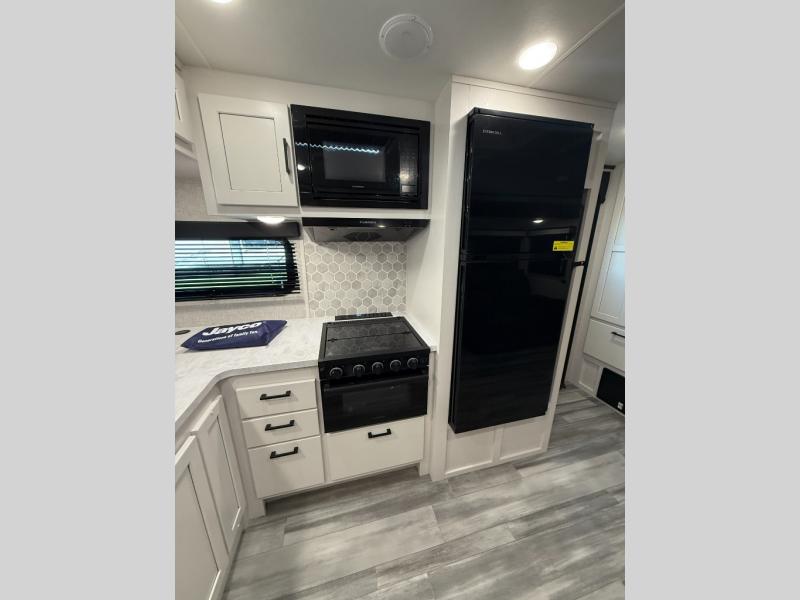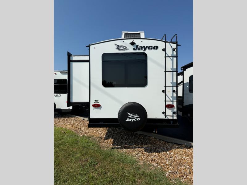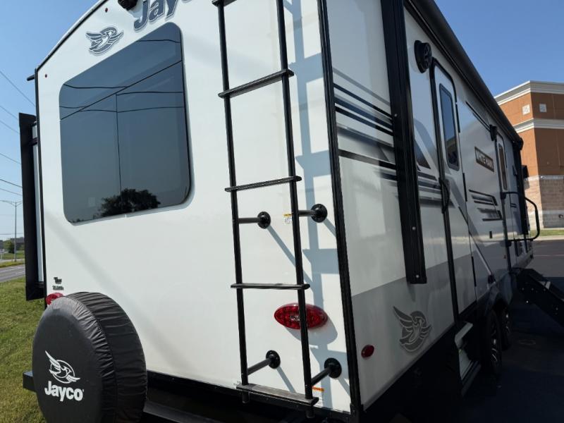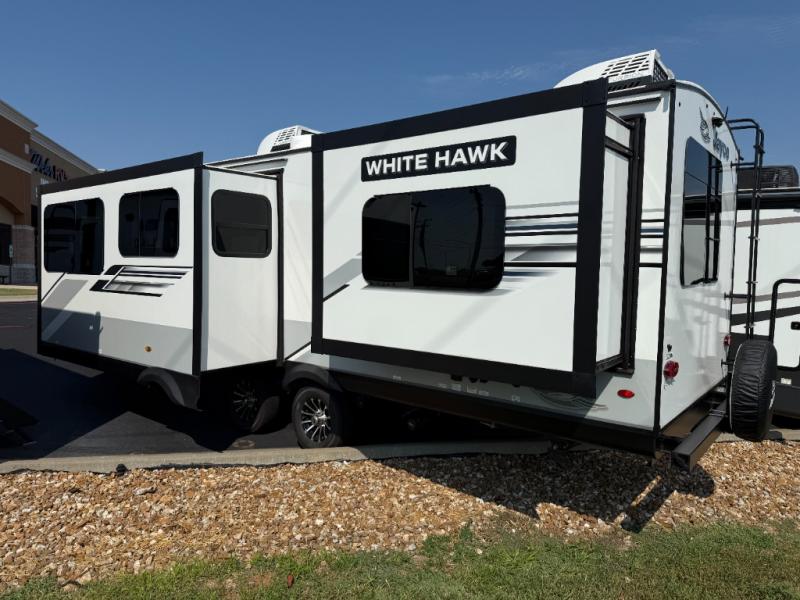The lightweight White Hawk travel trailers by Jayco will blow you away with their roomy interiors, luxurious amenities, and durable construction. The Magnum Truss Roof System can withstand 50% more weight than the competition, and the Stronghold VBL lamination is the lightest, yet strongest in the industry. Each model includes American-made Goodyear tires with self-adjusting brakes, dark tinted, frameless safety glass windows, and modern graphics package with dual-colored sidewalls for a sleek look. The White Hawk travel trailers also include a barreled interior ceiling with up to 81" of interior height, an electric fireplace, decorative kitchen backsplash, plus many more interior comforts!