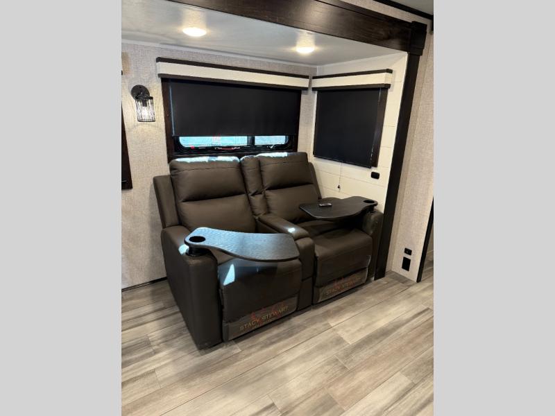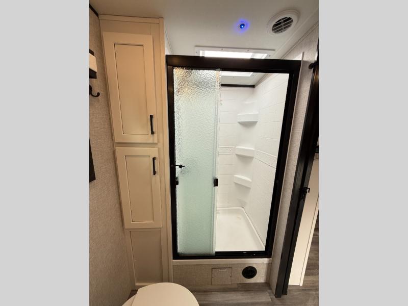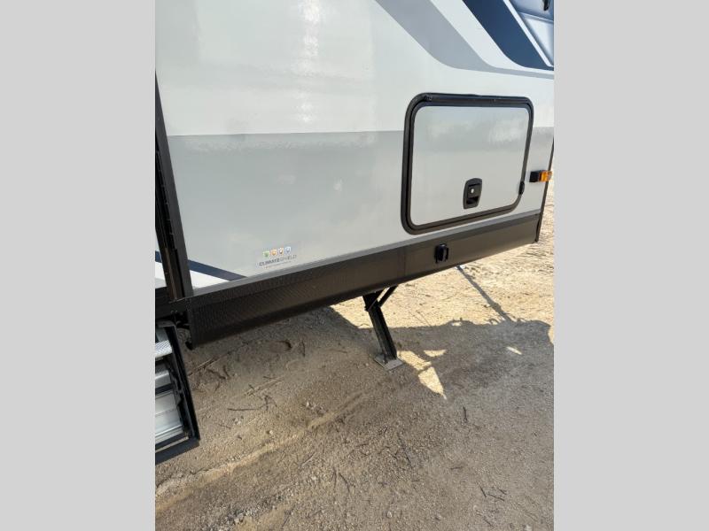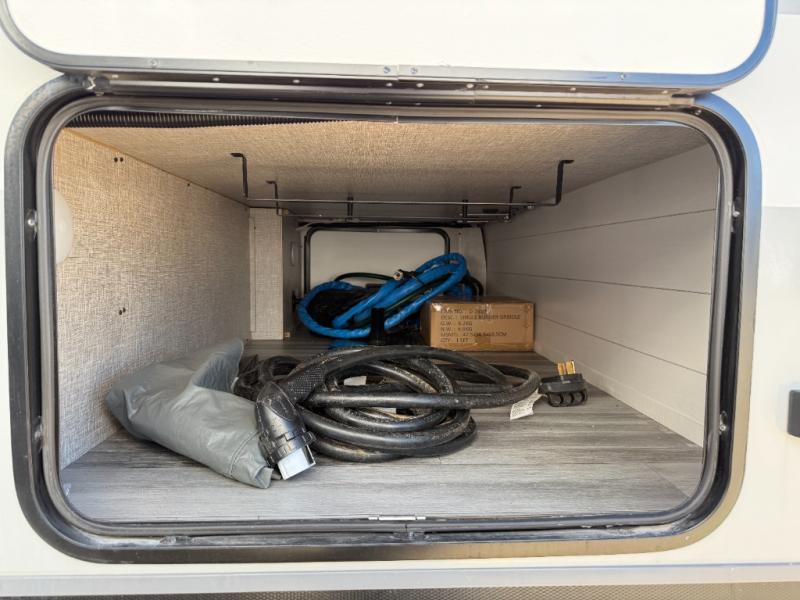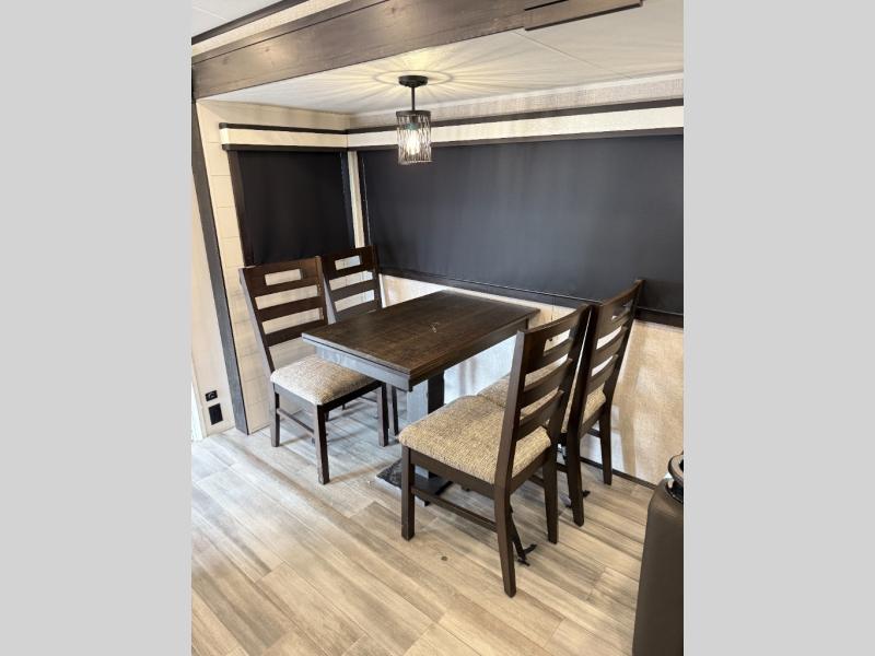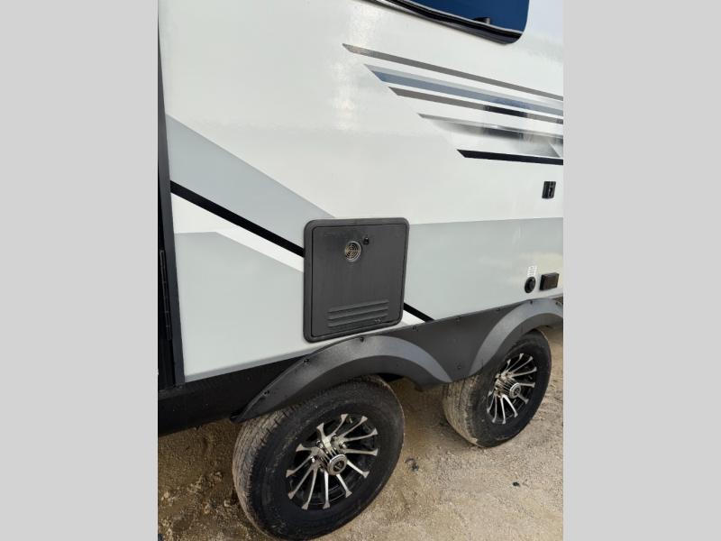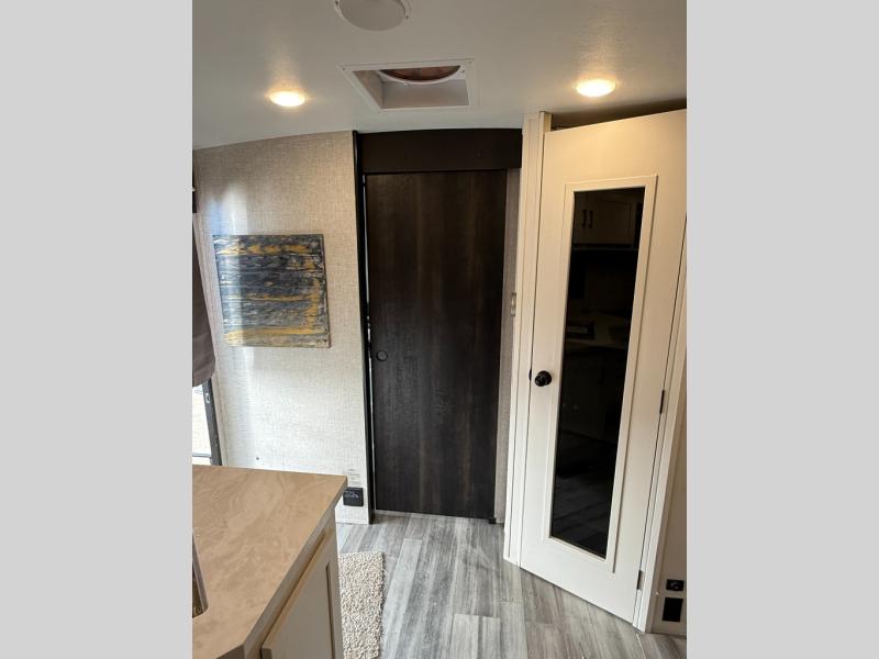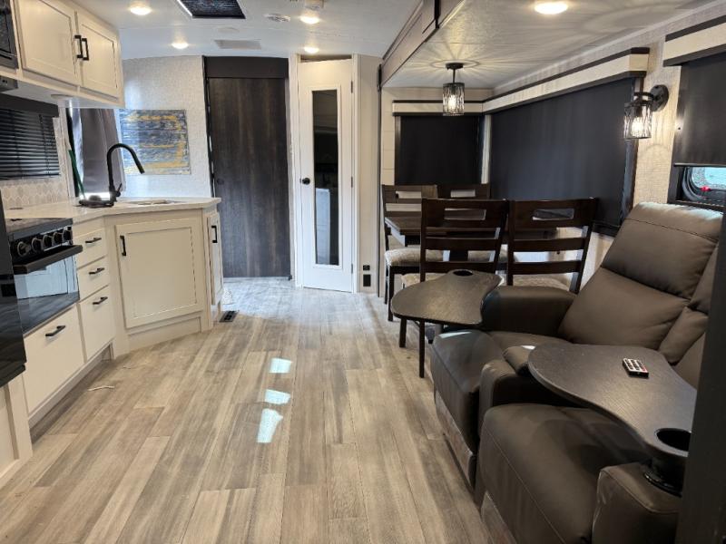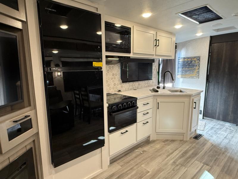 Your family will love camping every other weekend in this spacious travel trailer. The full rear bath is tucked away in the back for privacy, and there are dual entry doors for convenience. When you're not outside cooking on the outdoor kitchen, gather around the U-shaped dinette for game night. You'll find the LED TV and fireplace will make this area feel more like home, and there is a pantry to store snacks and dry goods. When it comes time to call it a night, head to the front private bedroom for a great night's rest on the queen bed, and you'll find two wardrobes plus a closet to keep your clothes tidy.