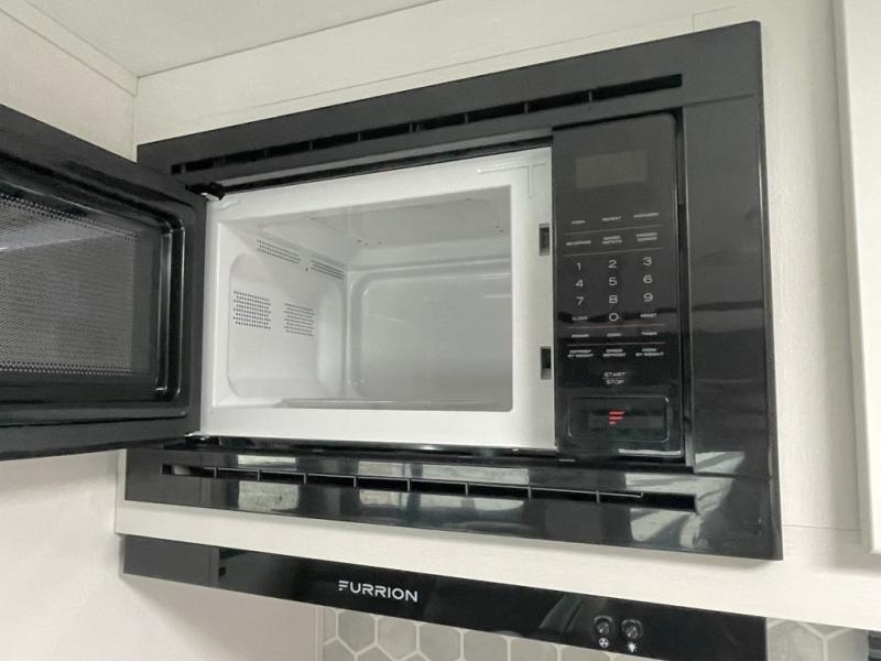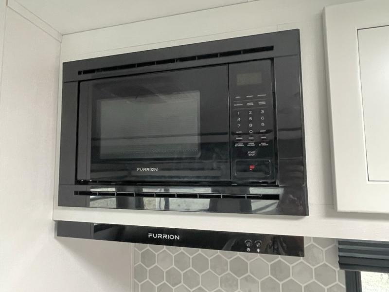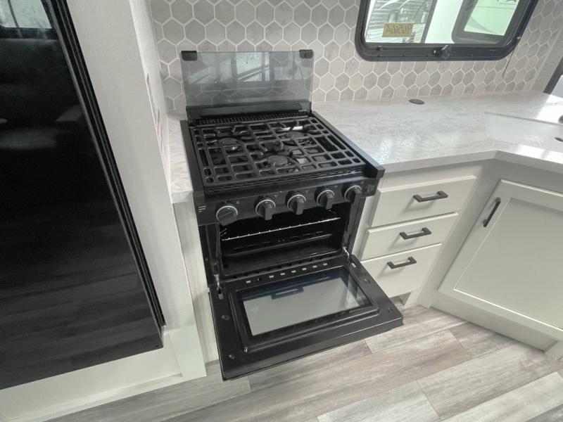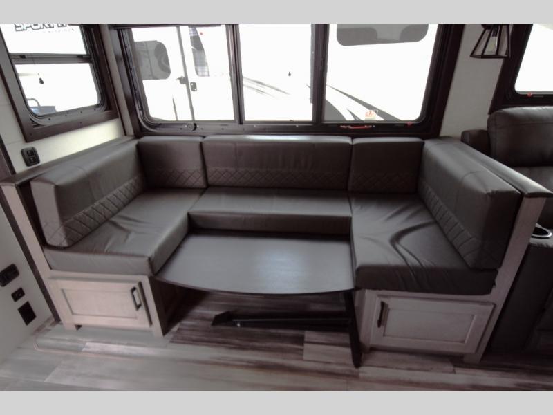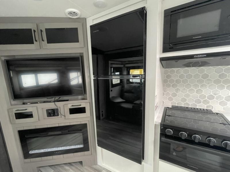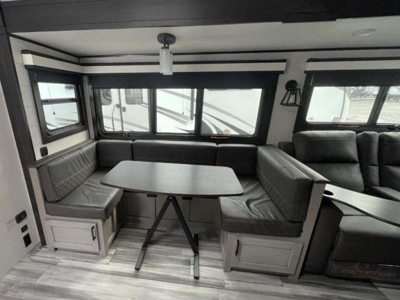Enjoy meals indoors at the U shaped dinette or outside under the shade of the power awning while cooking on the outdoor kitchen. The living area includes a tri fold sofa, fireplace, and LED TV, creating a cozy space for relaxing after a day of adventure.