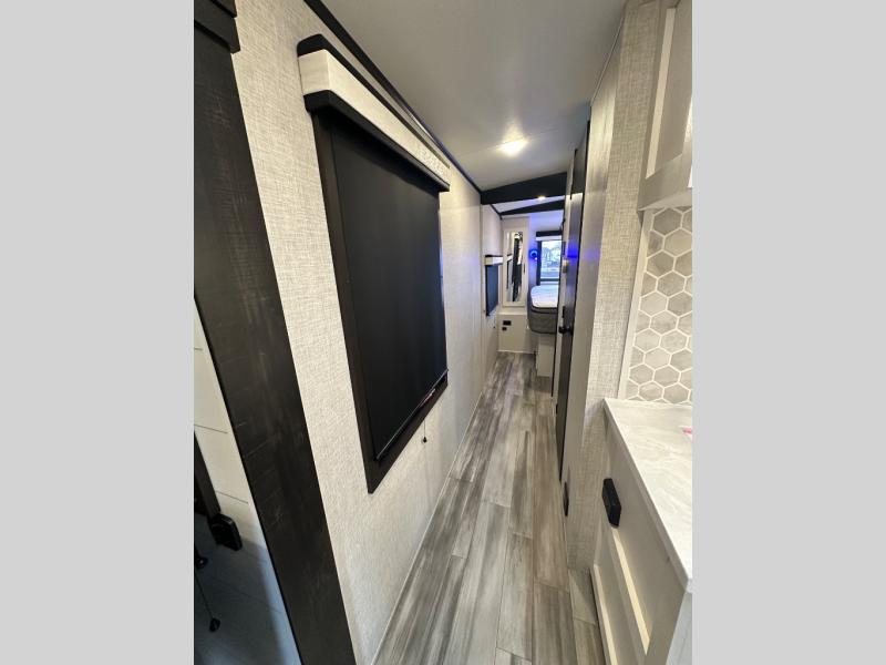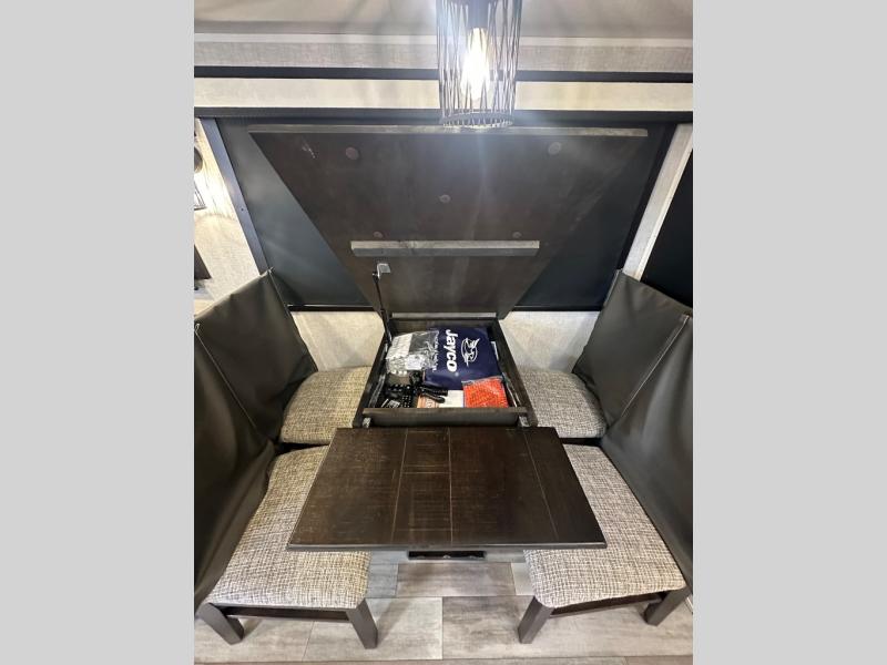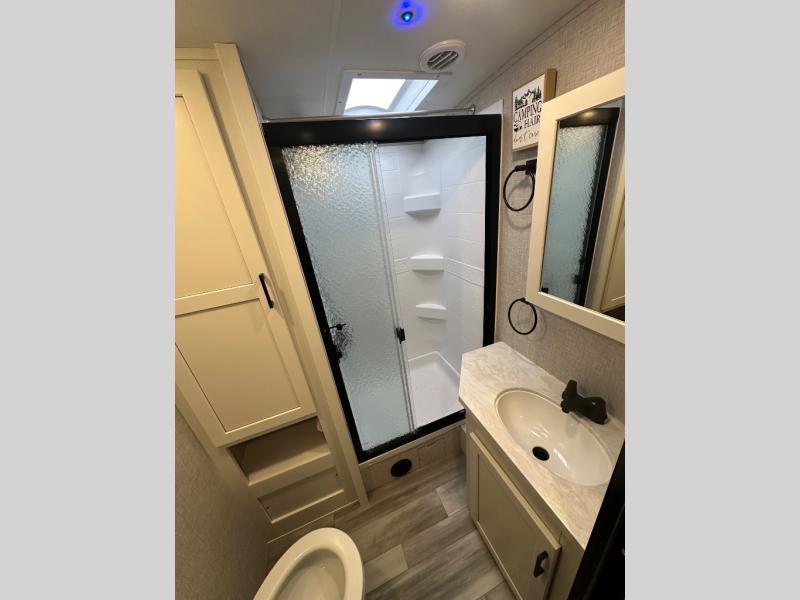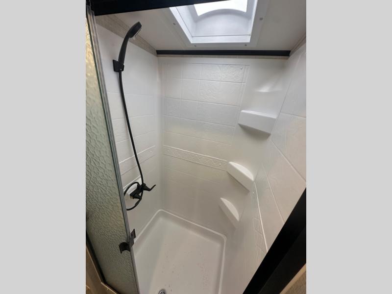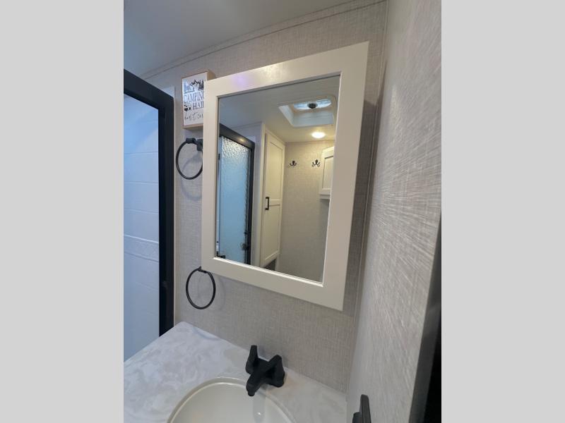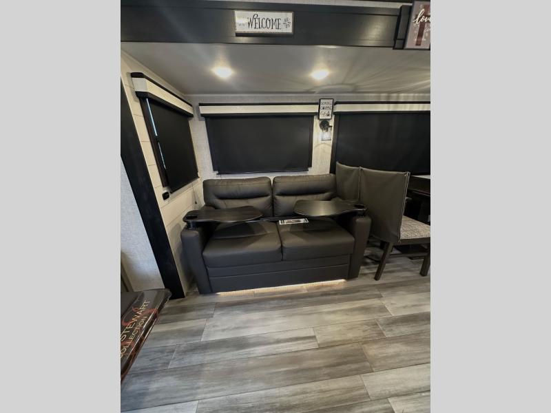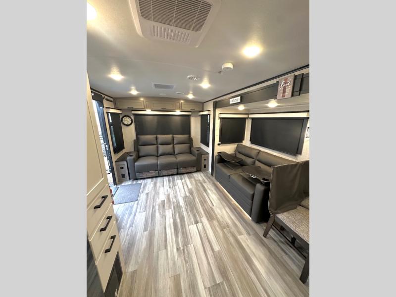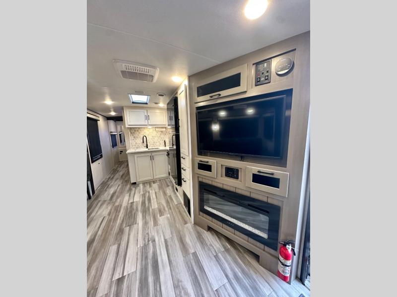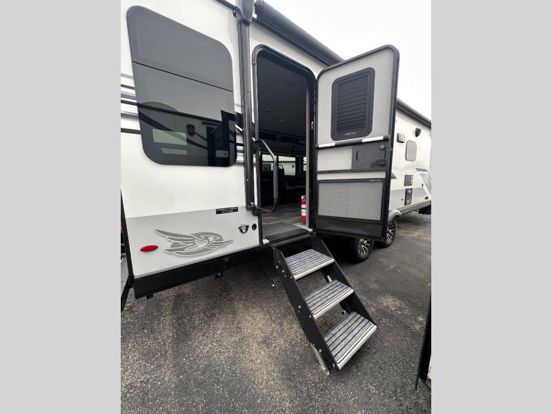 How does a dual entry travel trailer sound with sleeping space for five? Pack up and head to the lake because this model is the one! Once you arrive at your destination, set up the 20' power awning and a enjoy a cold drink in your camp chair. There is a convenient Jayport with an LP quick connect if you want to hook up your gas grill you brought along, and plenty of outside storage to bring along the fishing poles. Inside, your crew can relax on the tri-fold sofa, the booth dinette, or the rear theater seat, which is in great view of the LED TV and fireplace. Preparing meals will be easy in this White Hawk kitchen with plenty of counter space, a three burner cooktop, plus a microwave oven. The full bath includes a linen closet to store clean towels and a medicine cabinet to bring along your necessities. And don't overlook the front private bedroom with a queen bed, dual wardrobes, and its own exterior entry door for convenience!