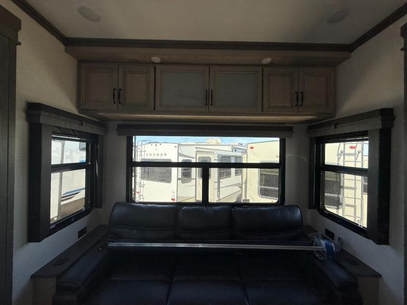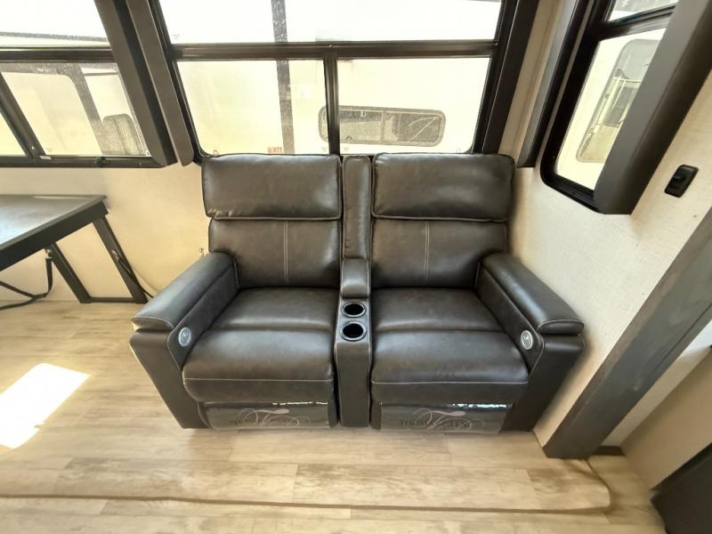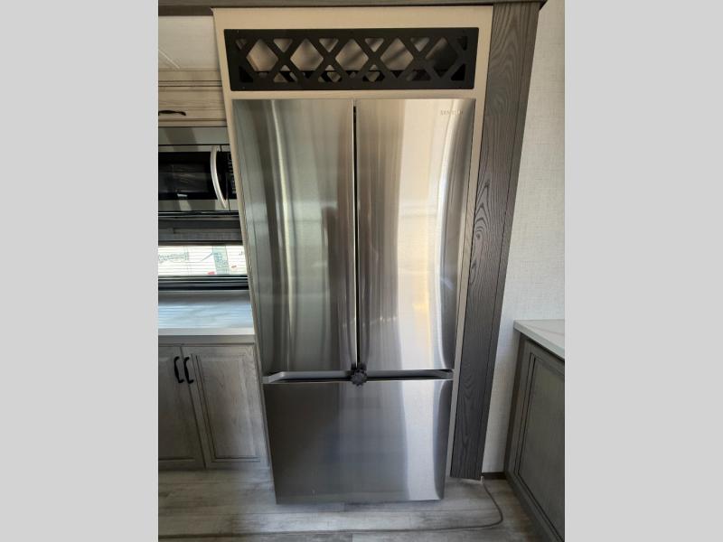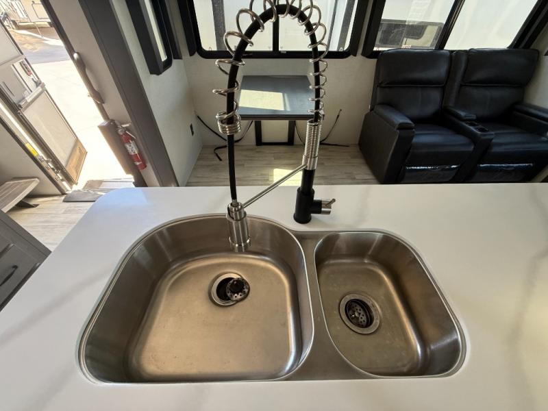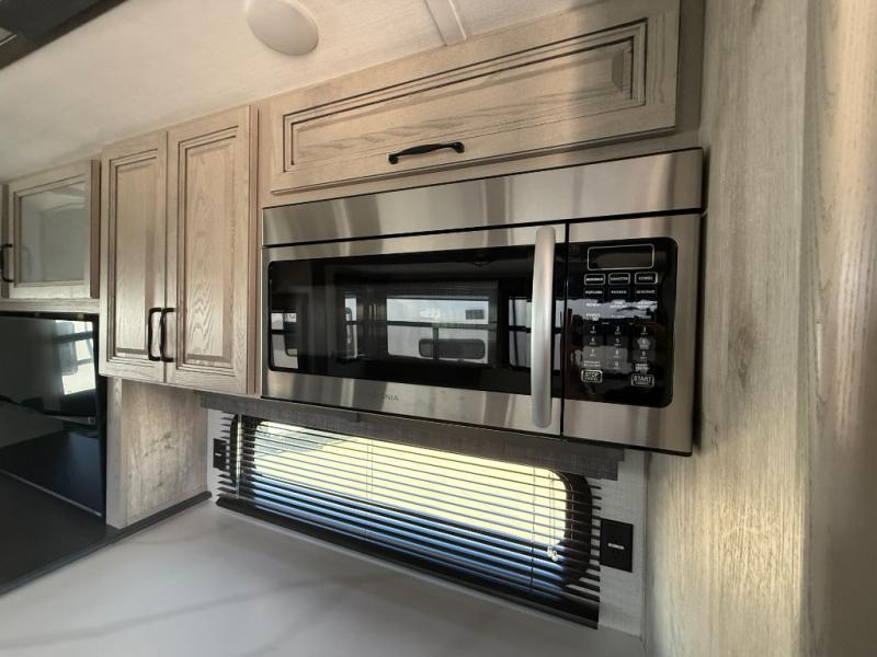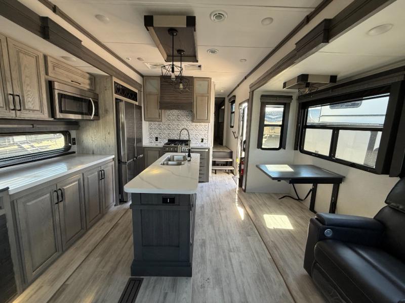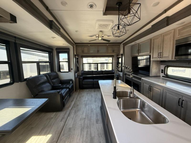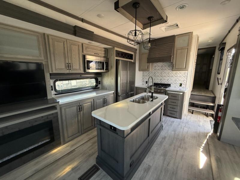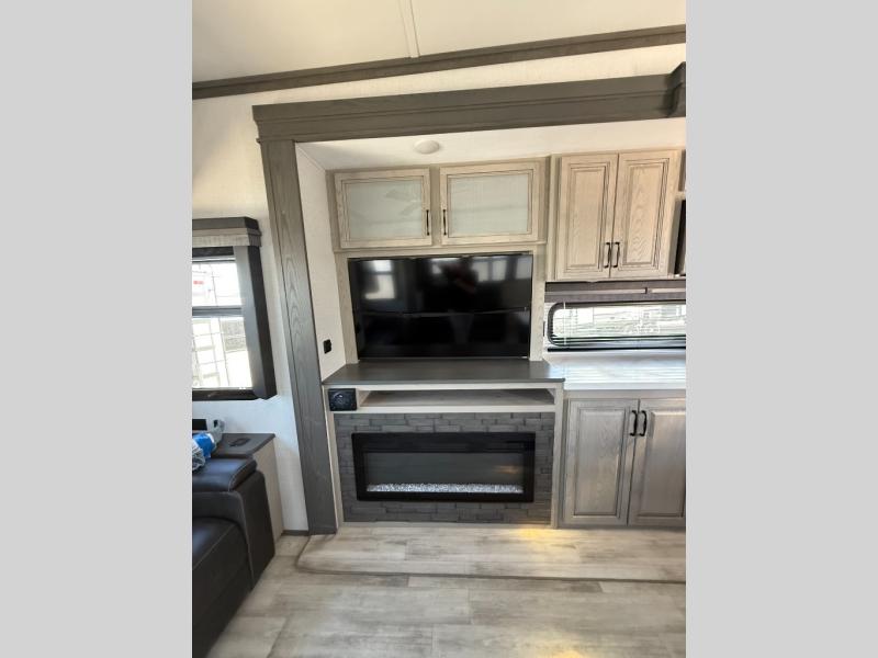You will feel right at home camping in this fifth wheel! The chef will have lots of countertop space to prepare their best meals along with a kitchen island, two pull-out pantries to store your dishes, and an 18 cu. ft. residential refrigerator to store any leftovers. The free standing dinette offers a comfortable place to enjoy your meals, and the theater seating across from the fireplace and entertainment center will be perfect for movie nights. There is also a rear hide-a-bed sofa sleeper for any guests you may have. You will love the full bath that includes a shower with a seat, a linen closet, plus two bath sinks for convenience. And don't overlook the front bedroom with a stylish barn door, king bed slide out, and master closet for all your things. You'll also find stackable washer and dryer prep, two drawers, and a Smart HDTV for movies in bed.