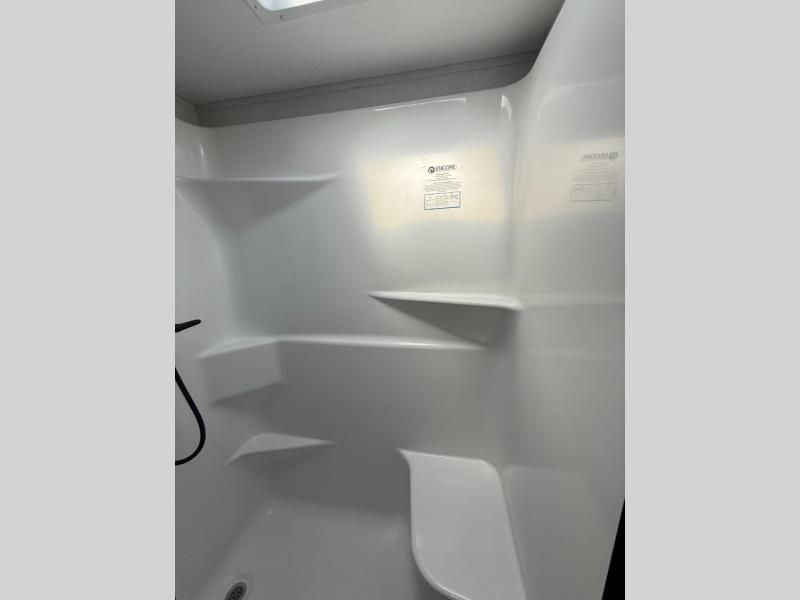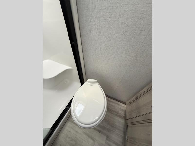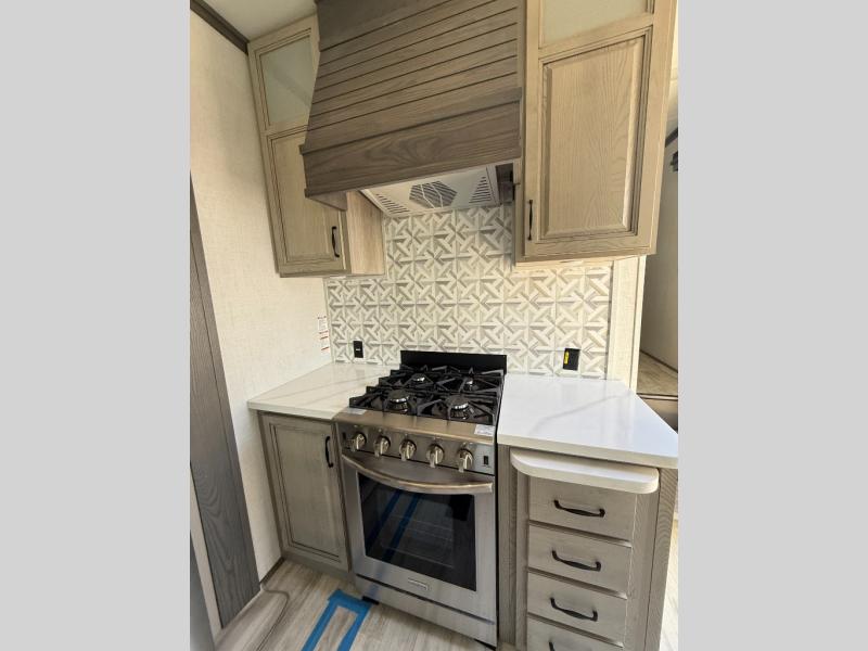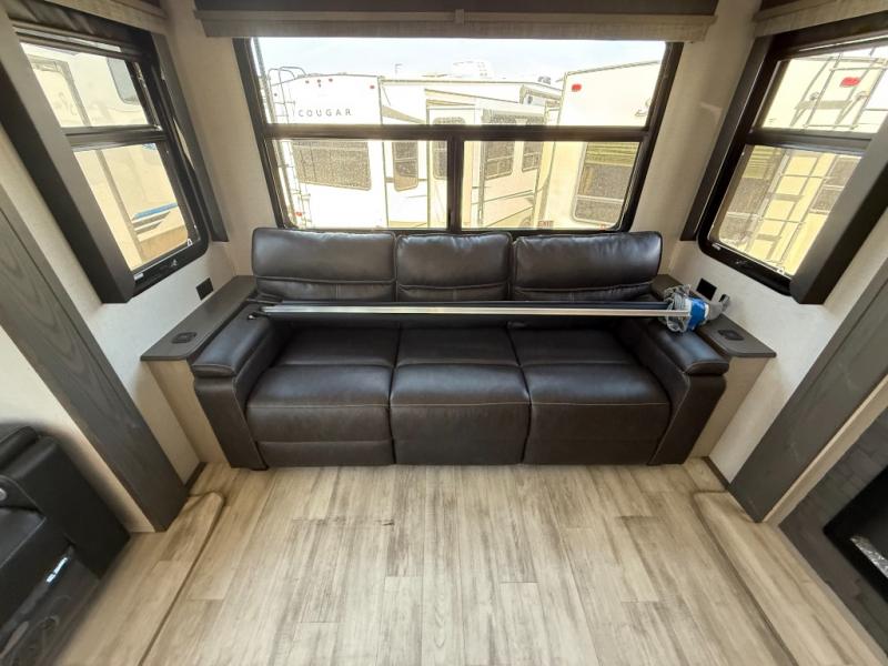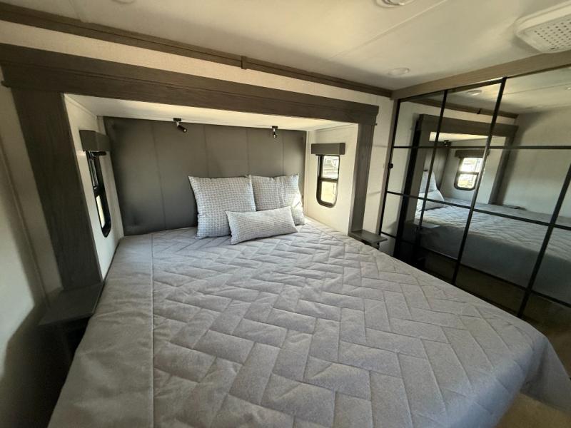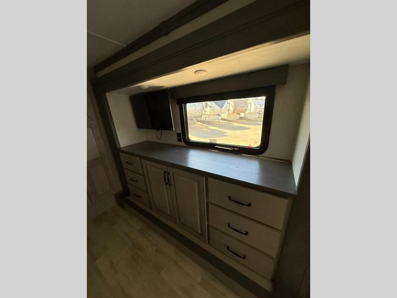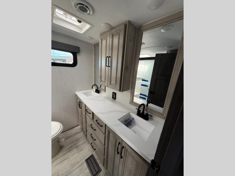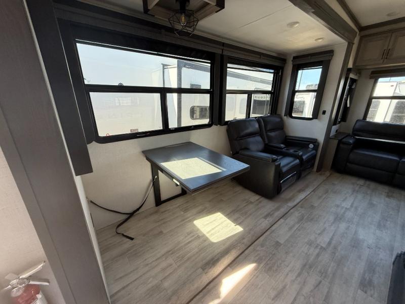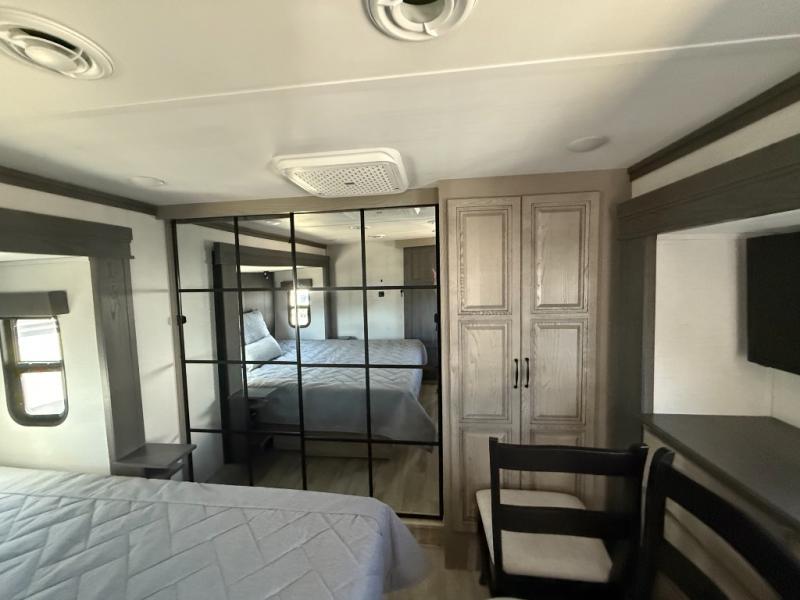 You will feel right at home camping in this fifth wheel! The chef will have lots of countertop space to prepare their best meals along with a kitchen island, two pull-out pantries to store your dishes, and an 18 cu. ft. residential refrigerator to store any leftovers. The free standing dinette offers a comfortable place to enjoy your meals, and the theater seating across from the fireplace and entertainment center will be perfect for movie nights. There is also a rear hide-a-bed sofa sleeper for any guests you may have. You will love the full bath that includes a shower with a seat, a linen closet, plus two bath sinks for convenience. And don't overlook the front bedroom with a stylish barn door, king bed slide out, and master closet for all your things. You'll also find stackable washer and dryer prep, two drawers, and a Smart HDTV for movies in bed.