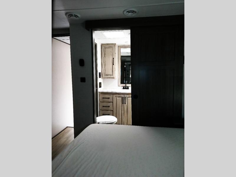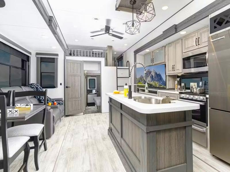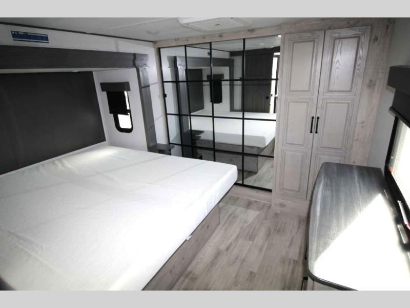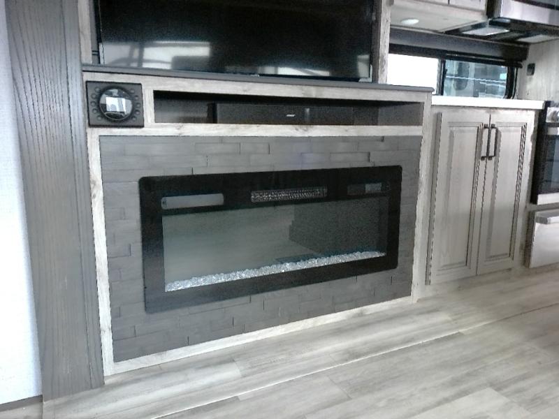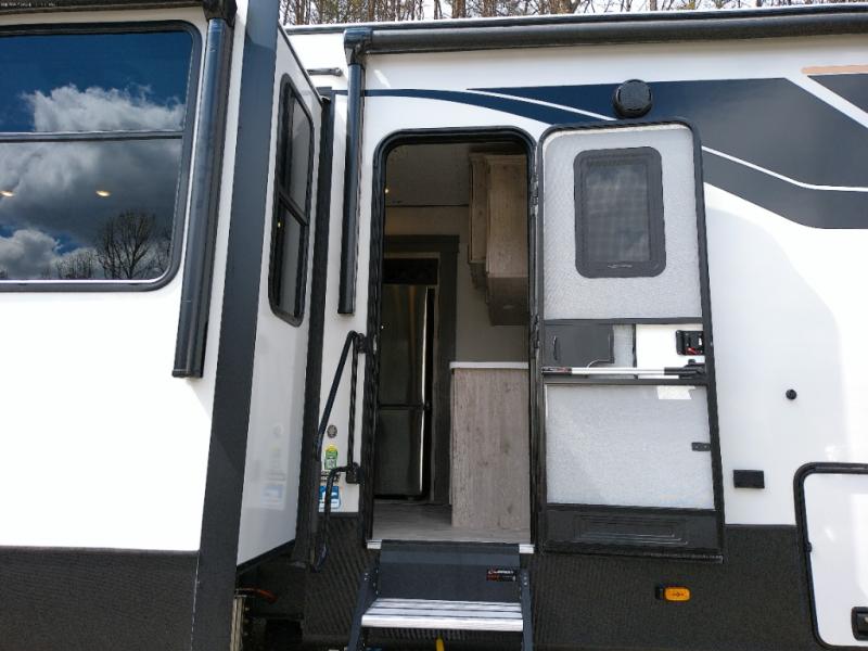 Get ready for family fun in this fifth wheel offering a front master bedroom with a king-size bed slide, plus a second master bedroom for your guests! The second bedroom includes a queen-size bed slide, a loft above the bedroom that sleeps 3 more, plus a rear full bathroom including a unique rear entry/exit door. And both entrances include the LCl SolidStep. The main living and kitchen area offers dual opposing slides and include theater seating, a free standing dinette, a fireplace, a center island and full kitchen amenities to feed your entire crew.