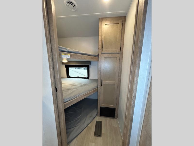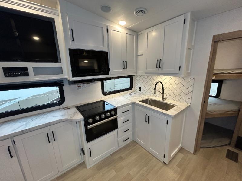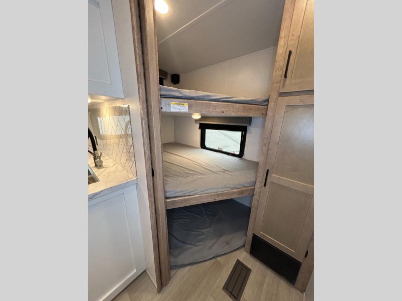 This fifth wheel with an open concept kitchen and living area is sure to feel just like home! You can relax with friends and family around the U-shaped dinette or on the tri-fold sleeper sofa, and there is a TV/radio in this space for entertainment. The rear private bunkhouse includes double-size triple bunks and a wardrobe for your guests' things, and you'll have your own wardrobes up front in the private bedroom. There is also a queen bed here and dual nightstands to keep your phone and glasses close by. And don't overlook the exterior with its 20' electric awning and LCI Solid Steps!
