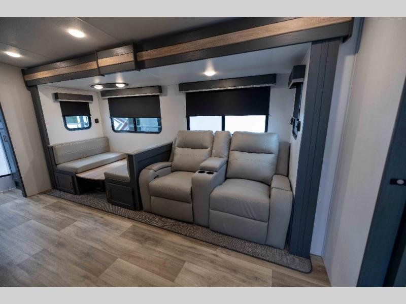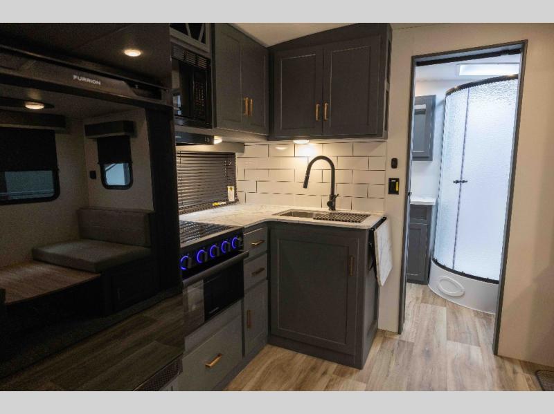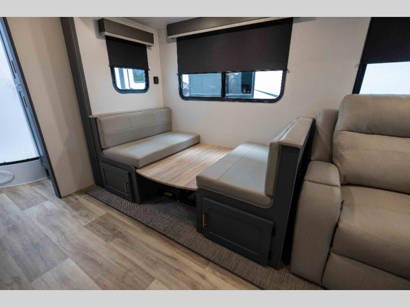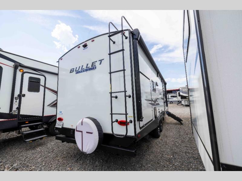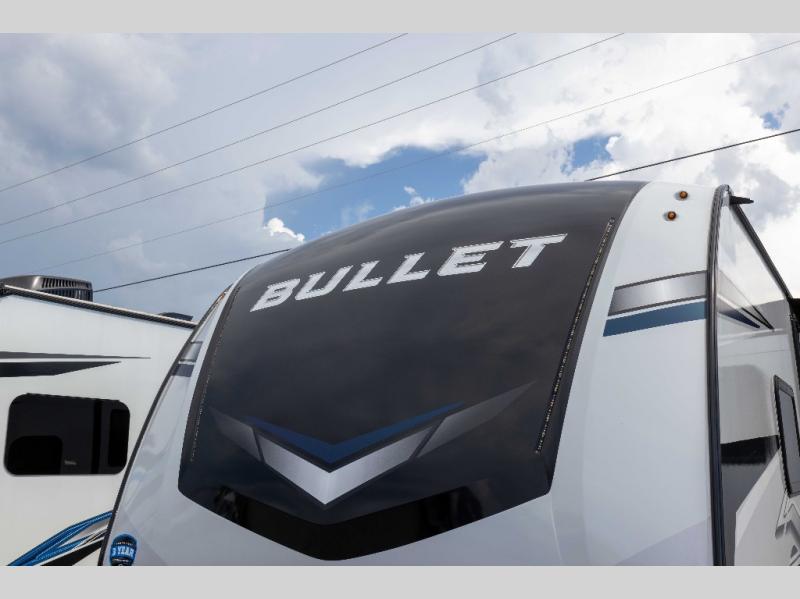 Enjoy camping with your family in this Bullet travel trailer that is perfect for a couple or a family of four. You will appreciate the private bedroom with wide entry including space saving sliding doors. The bedroom features a queen bed, wardrobes on either side, plus a laundry chute. There is also a large pass-through storage compartment beneath the front bedroom for your outdoor gear and more. A large slide features a Do-More dinette and 68" tri-fold sofa that is great for relaxing during the day, and can easily be transformed for more sleeping space at night. Or, you could opt. for the free standing dinette with chairs if you do not prefer booth style seating and/or do not need the added option of more sleeping space. A large rear bath features a radius shower and linen storage, plus a vanity with sink and toilet. And, the chef can choose to cook inside or outside with the outdoor kitchen that includes a Capital grill, 4.4 cu. ft. refrigerator as well as a sink all tucked under the 21' awning.