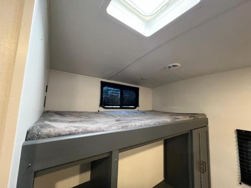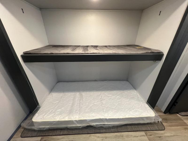 This travel trailer is one the whole gang will love! There is a rear private bunkhouse suite for your guests or the kids, plus a front master bedroom for you. The bunkhouse includes a tri-fold sofa with a flip-up bunk across from a second bunk, plus there is a half bath with its own exterior entry door! The full walk-through bath leads into the front bedroom where you'll find a queen bed, dual wardrobes and a laundry chute so you can throw clothes directly into the pass-through. A super slide in the combined living area and kitchen will provide ample space to move about, and you will find comfy seating on the tri-fold sofa and Do-More dinette table. There is even a fireplace and an entertainment center!
