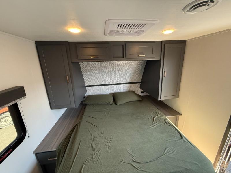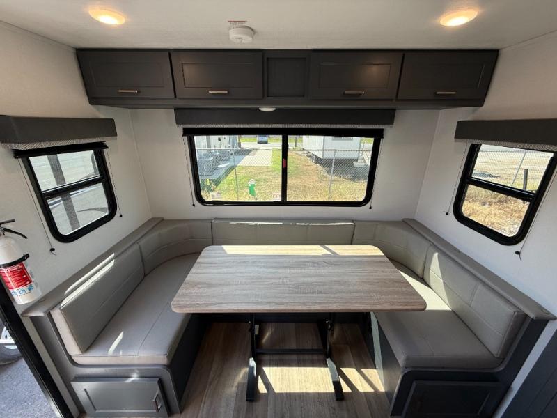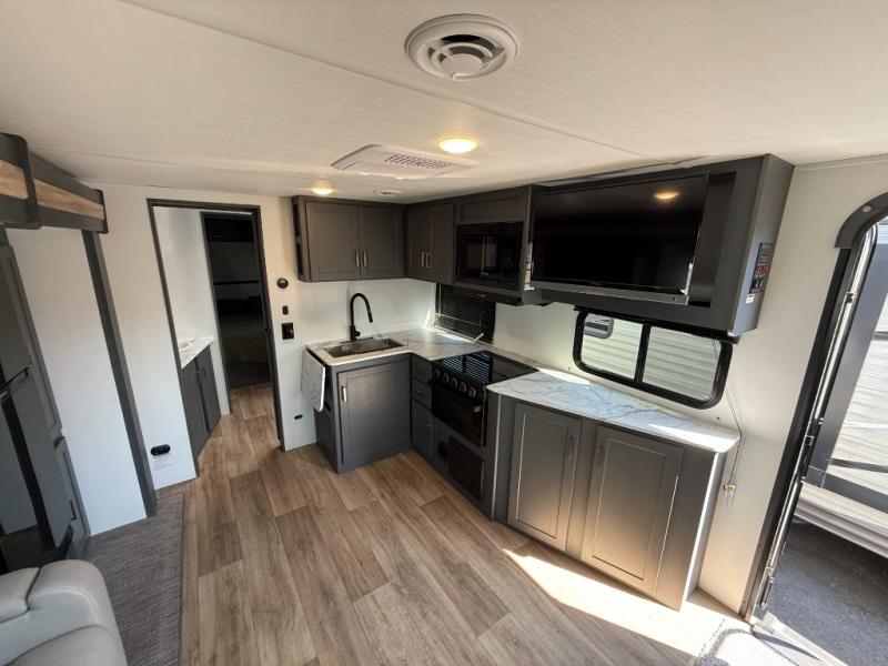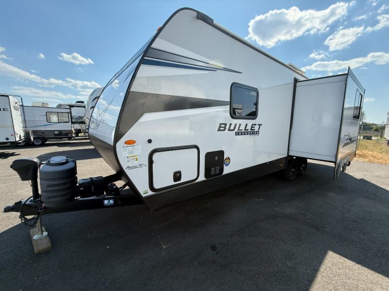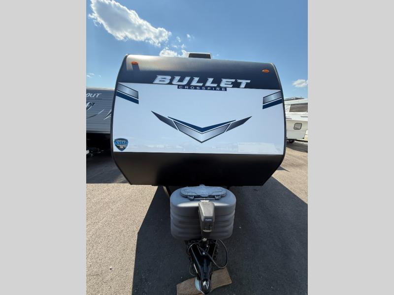 Each Bullet Crossfire Double Axle travel trailer by Keystone is constructed with a NORCO HSLA steel/automotive deposition coated frame assembled with huck bolts for durability. The TORFLEX rubber torsion suspension will provide smooth towing, and the one-piece ABS enclosed underbelly will help extend your camping season. Setting up your trailer will be a breeze with the electric tongue jack and four electric stabilizer jacks, and there is an electric awning with adjustable arms and LED lighting for an inviting outdoor living space. The affordable, high-quality RV solar energy system, SolarFlex Protect 220 comes standard with each model and will allow you to go off-grid when you want, or you can choose the optional SolarFlex Discover 440i for even more off-grid capabilities. Inside, you'll find fabric night shades, Beauflor woven flooring in the slides, full depth cabinets with full extension drawer guides, and many more comforts.