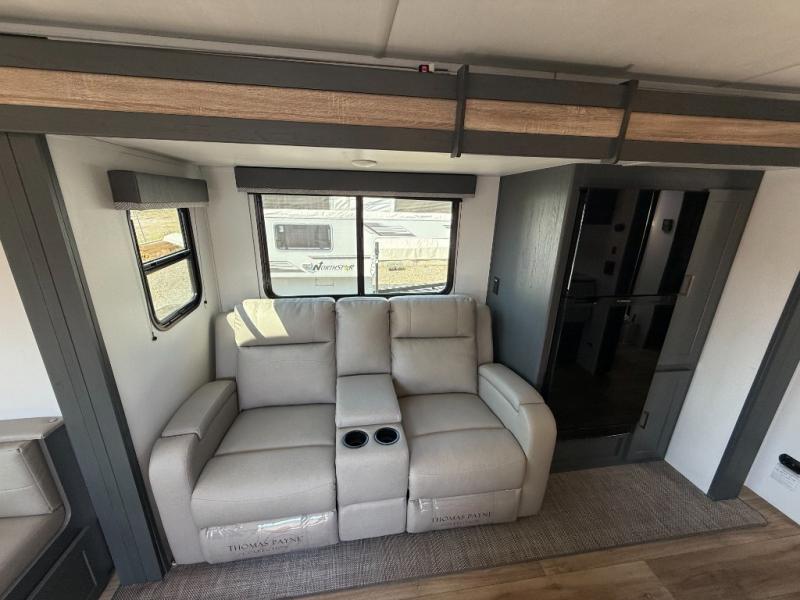 It won't be hard to find comfort in this dual entry travel trailer for six! You can enter in through the front private bedroom or the rear living area, and there is a large slide out for added space to move about. Spend your evenings on the tri-fold sofa across from the LED TV, around the U-shaped dinette, or outside under the 19' power awning with LED lights. You might even like to add the optional theater seating in place of the sofa for more comfort! The walk-through bath will provide easy access for everyone, and the front master bedroom is sure to feel just like home with its queen bed and dual wardrobes!