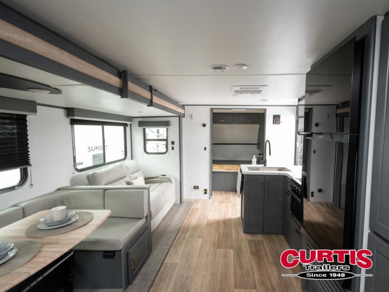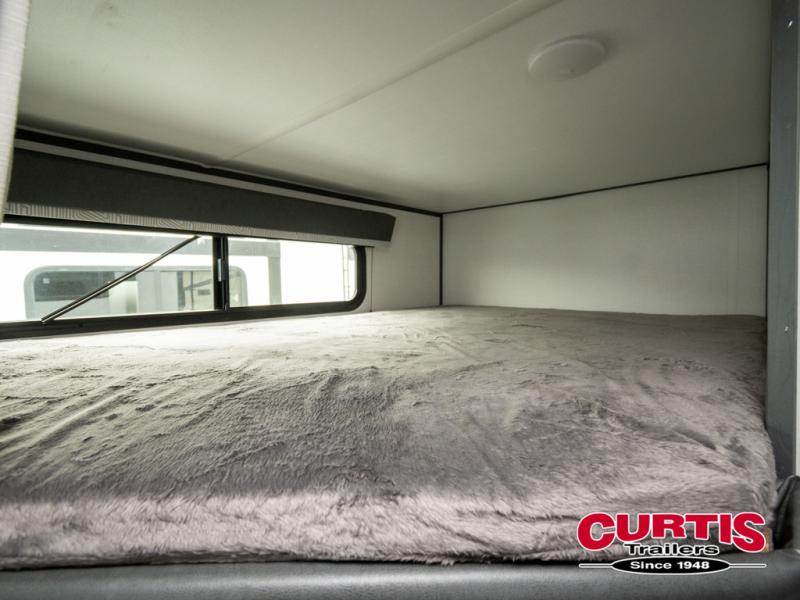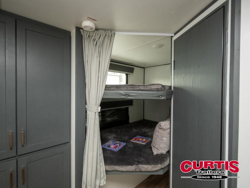 Double-size bunks make this travel trailer fun for all! There is even flip-up bunk for added storage and a rear cargo door where you can quickly unload gear from under the bunks. Whether your crew is playing a game around the Do-More dinette table, relaxing on the tri-fold sofa sleeper, or making lunch on the outdoor kitchen, a good time is sure to be had! The chef will also love the interior kitchen with a three burner gas range/oven, a Furrion microwave, an 8 cu. ft. 12V refrigerator, and a flip-up counter for more prep space. And don't overlook the front private bedroom, complete with a walk-around queen bed, plus dual nightstands and dual wardrobes!