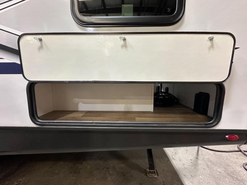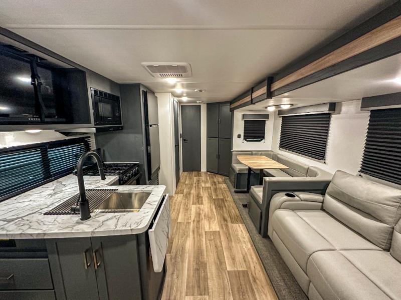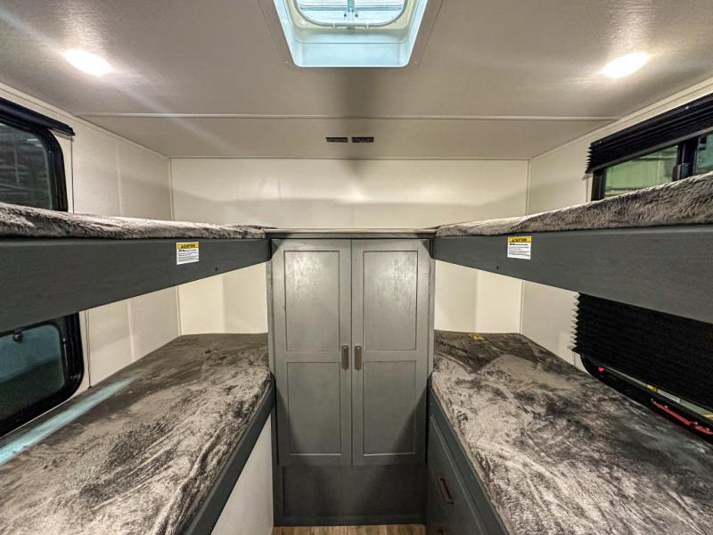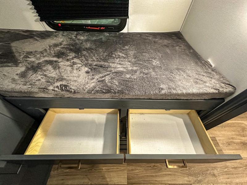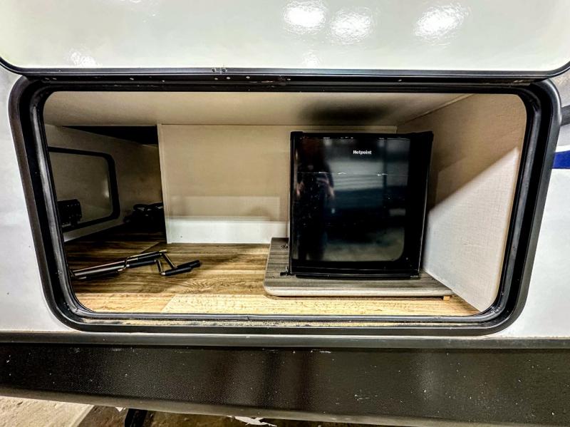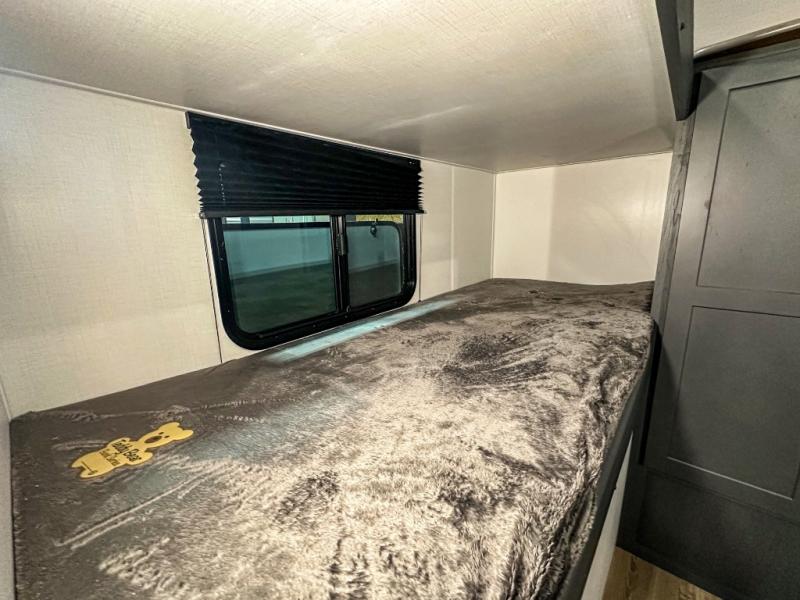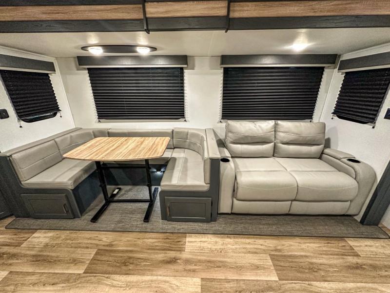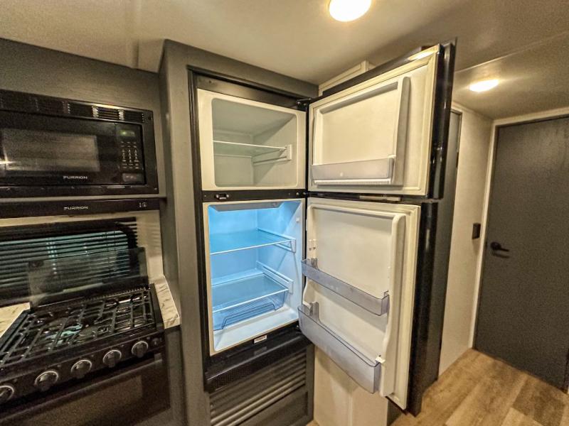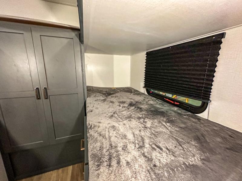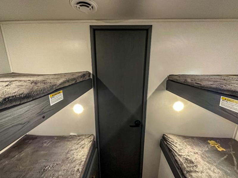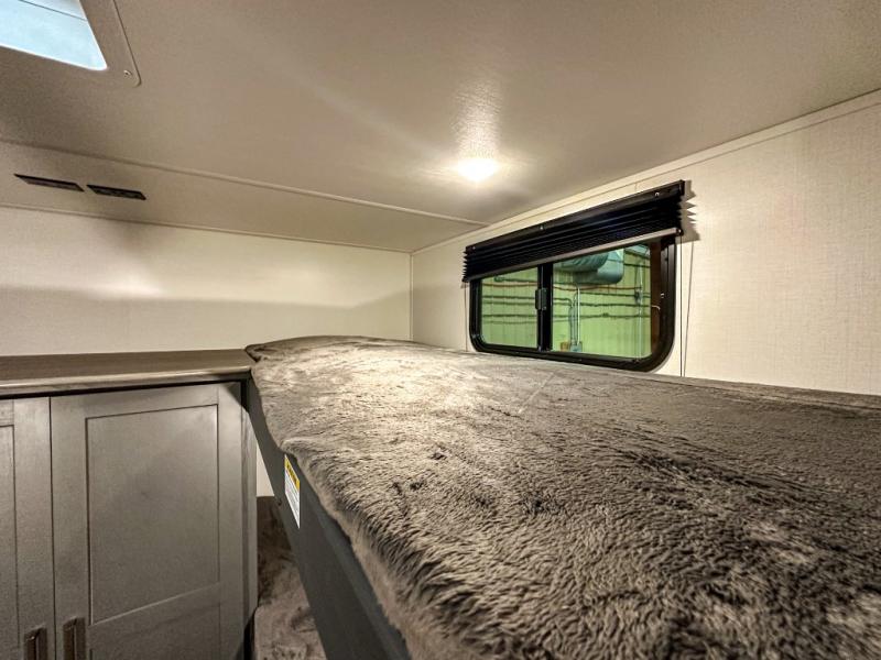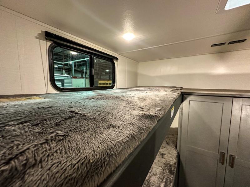 This spacious travel trailer has an impressive ten person sleeping capacity thanks to the added bunkhouse with four bunks! Your guests or the kids will also have a wardrobe and additional storage for their things, and the full bath is close by for easy nighttime use. You'll find the front private bedroom to feel just like home with its walk-around queen bed, plus dual nightstands and dual wardrobes. If you have any other guests, they can sleep on the tri-fold sofa sleeper or U-shaped Do-More dinette table within the super slide out. There is a full kitchen inside with a three burner gas range, a Furrion microwave, plus an 8 cu. ft. 12V refrigerator. Head outdoors to enjoy the 21' power awning with LED lights, and there is an outdoor refrigerator with LP quick connect if you want to bring along a grill. If the weather is raining on your parade, you might just decide to stay indoors and watch a movie on the LED TV!