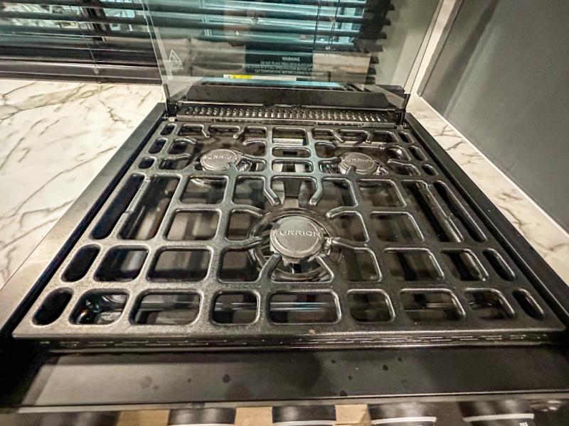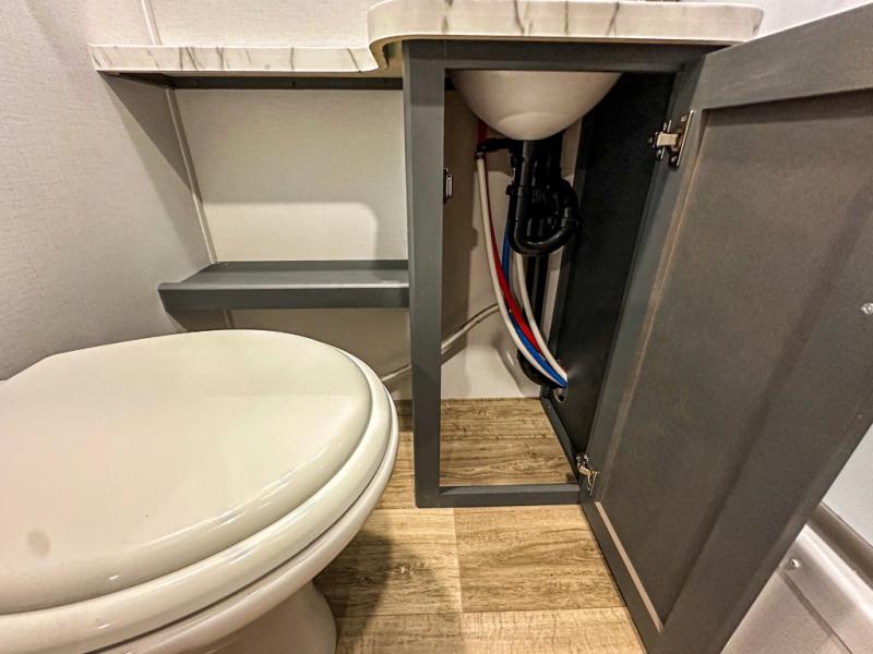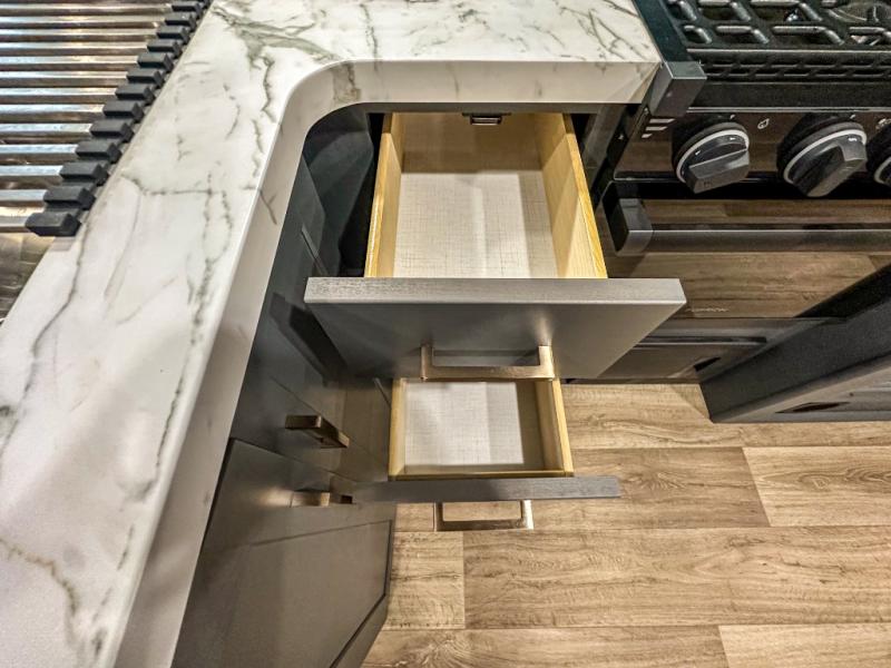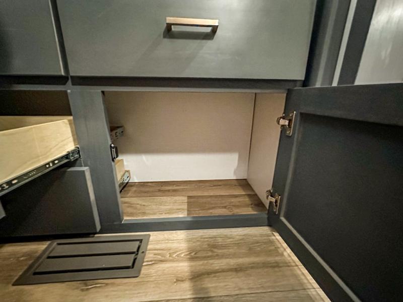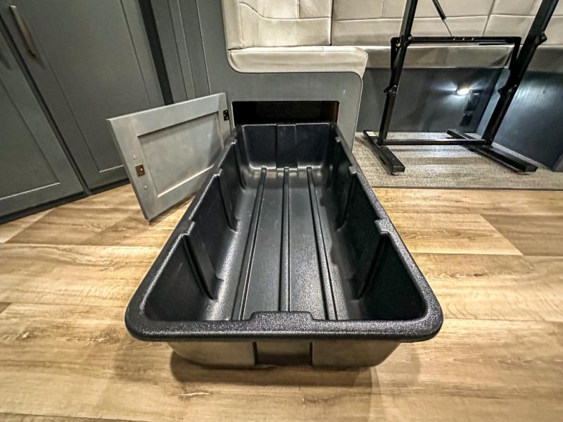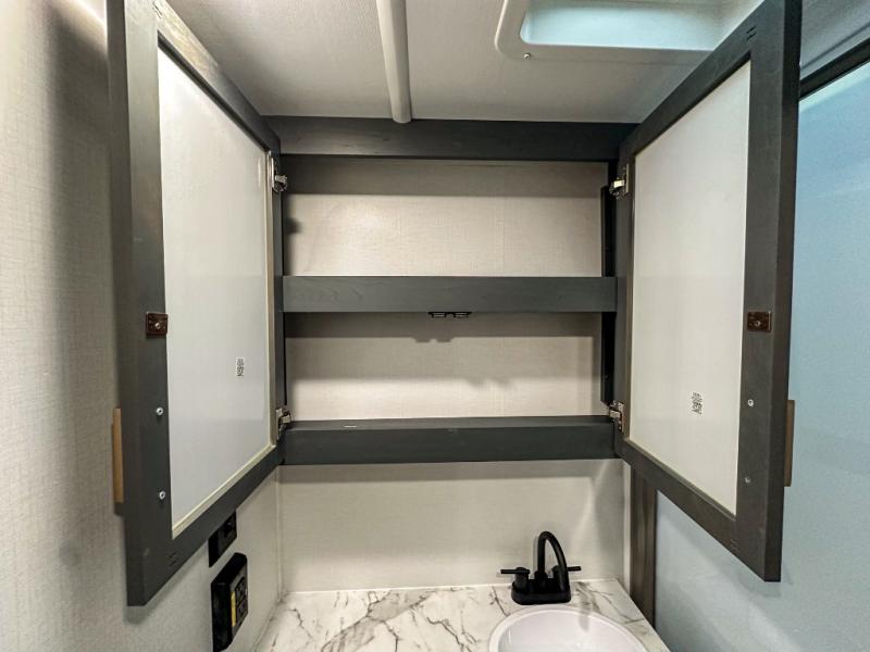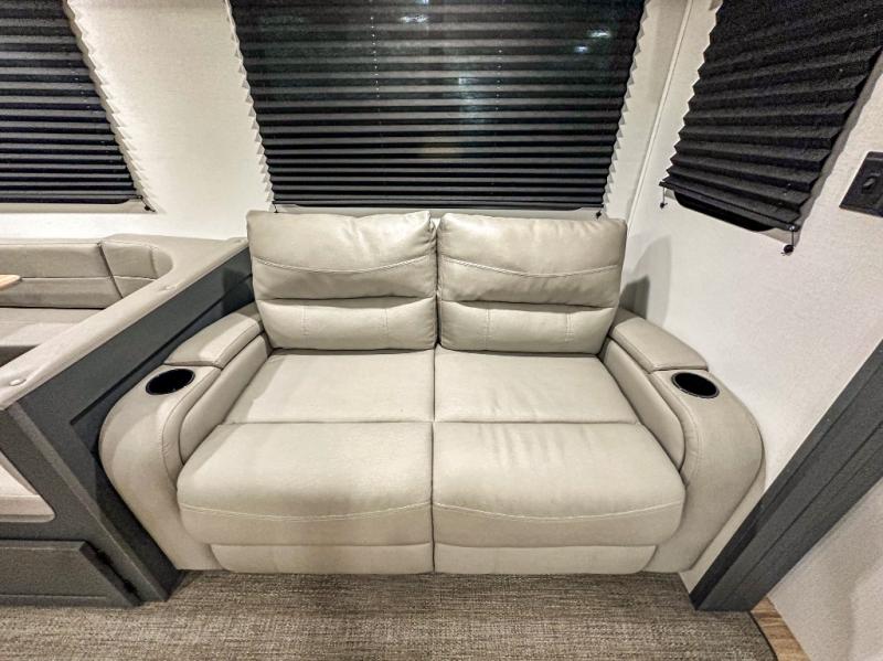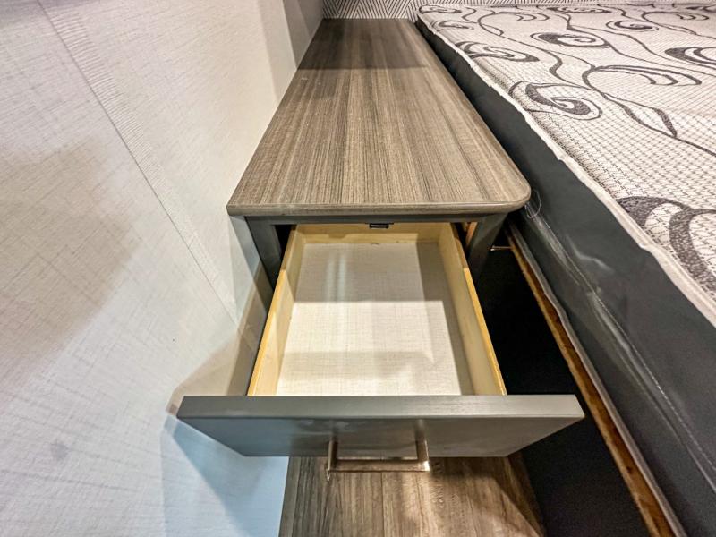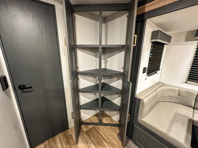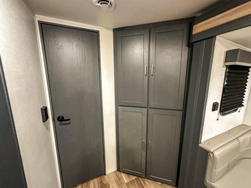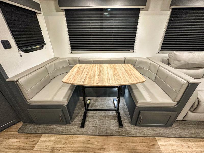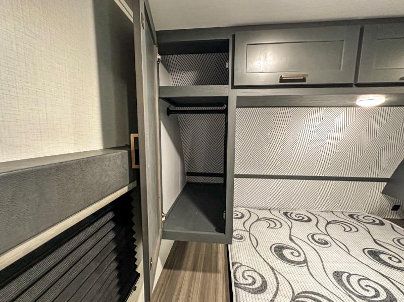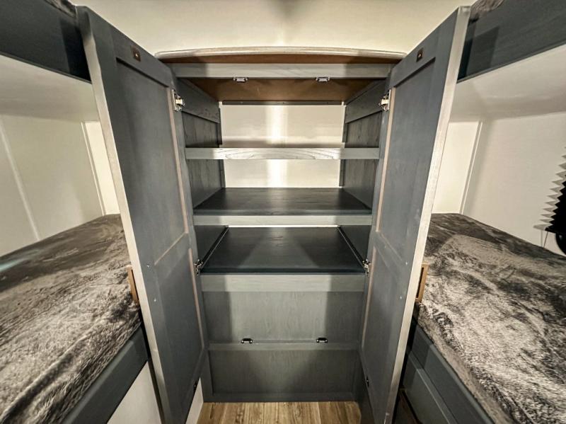 This spacious travel trailer has an impressive ten person sleeping capacity thanks to the added bunkhouse with four bunks! Your guests or the kids will also have a wardrobe and additional storage for their things, and the full bath is close by for easy nighttime use. You'll find the front private bedroom to feel just like home with its walk-around queen bed, plus dual nightstands and dual wardrobes. If you have any other guests, they can sleep on the tri-fold sofa sleeper or U-shaped Do-More dinette table within the super slide out. There is a full kitchen inside with a three burner gas range, a Furrion microwave, plus an 8 cu. ft. 12V refrigerator. Head outdoors to enjoy the 21' power awning with LED lights, and there is an outdoor refrigerator with LP quick connect if you want to bring along a grill. If the weather is raining on your parade, you might just decide to stay indoors and watch a movie on the LED TV!