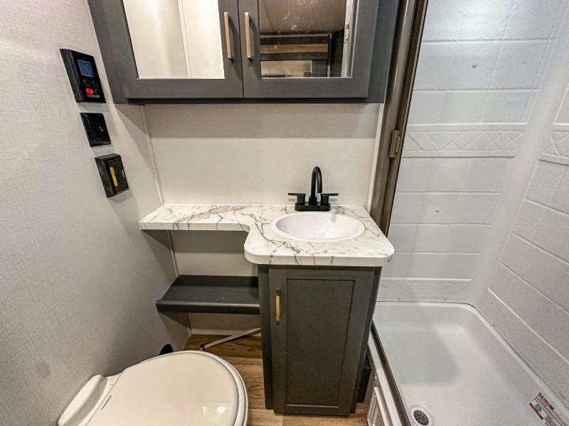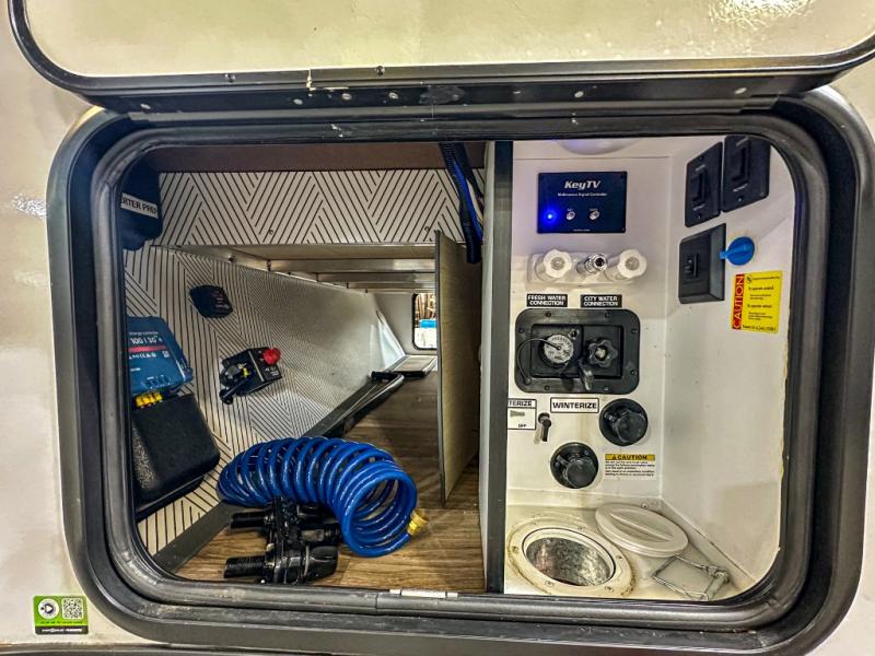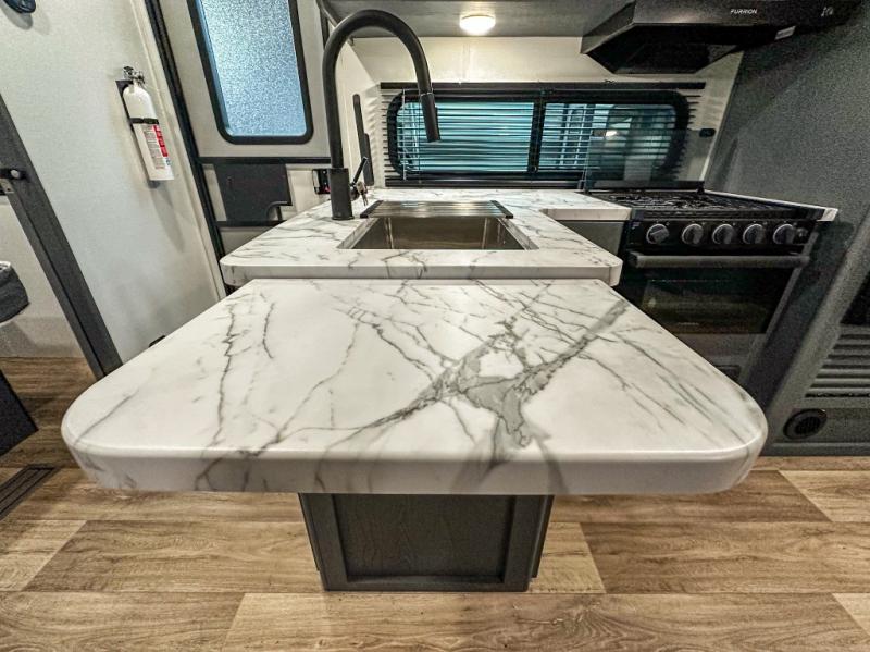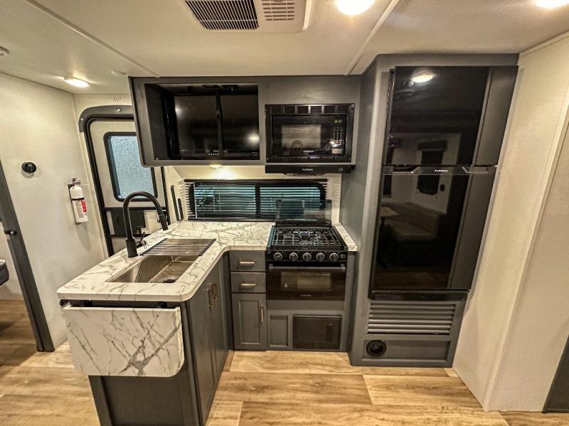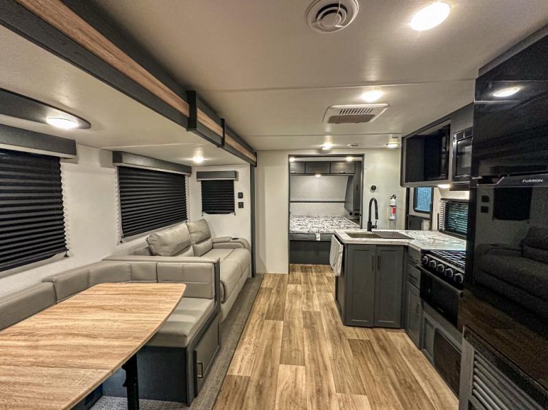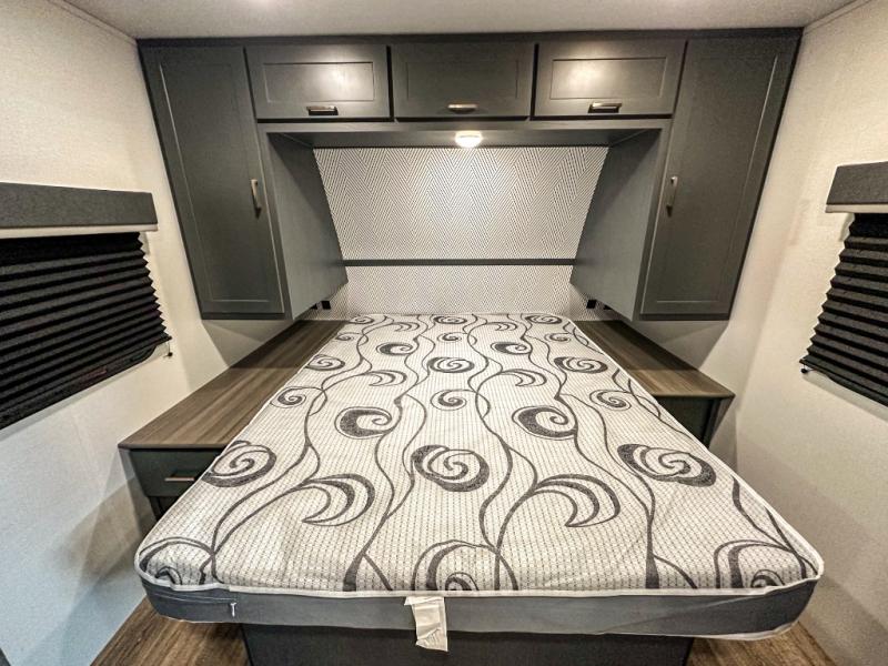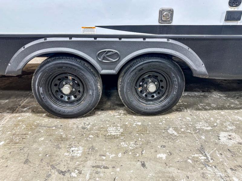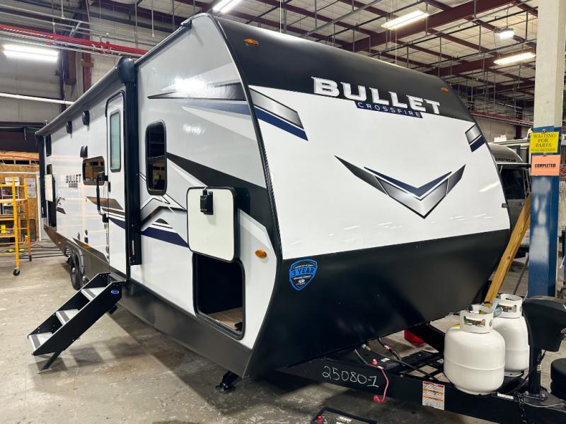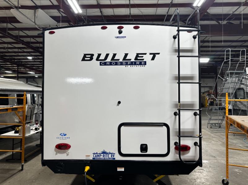 Each Bullet Crossfire Double Axle travel trailer by Keystone is constructed with a NORCO HSLA steel/automotive deposition coated frame assembled with huck bolts for durability. The TORFLEX rubber torsion suspension will provide smooth towing, and the one-piece ABS enclosed underbelly will help extend your camping season. Setting up your trailer will be a breeze with the electric tongue jack and four electric stabilizer jacks, and there is an electric awning with adjustable arms and LED lighting for an inviting outdoor living space. The affordable, high-quality RV solar energy system, SolarFlex Protect 220 comes standard with each model and will allow you to go off-grid when you want, or you can choose the optional SolarFlex Discover 440i for even more off-grid capabilities. Inside, you'll find fabric night shades, Beauflor woven flooring in the slides, full depth cabinets with full extension drawer guides, and many more comforts.