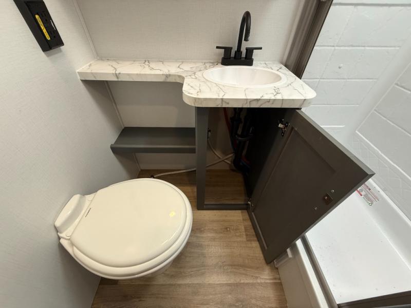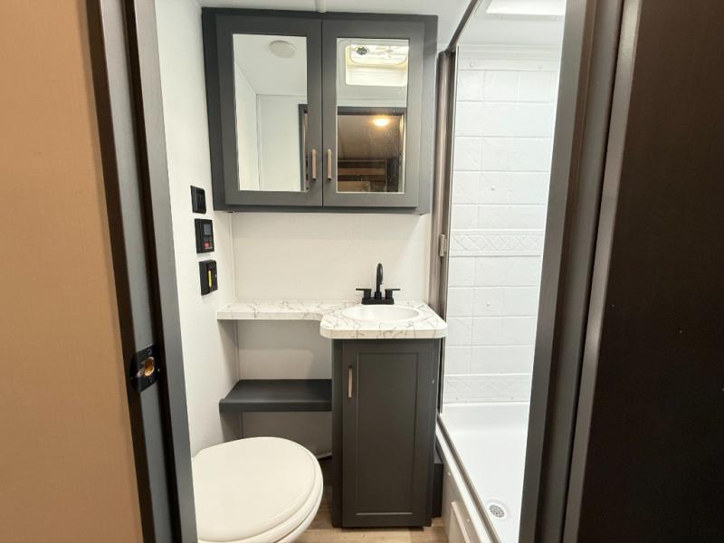 Standard full bath with shower, toilet, and vanity — conveniently located near the bunkhouse and living area.