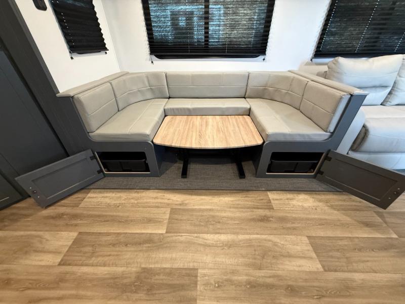 U-shaped dinette and tri-fold sofa in the slide out both convert to beds for additional sleeping capacity.