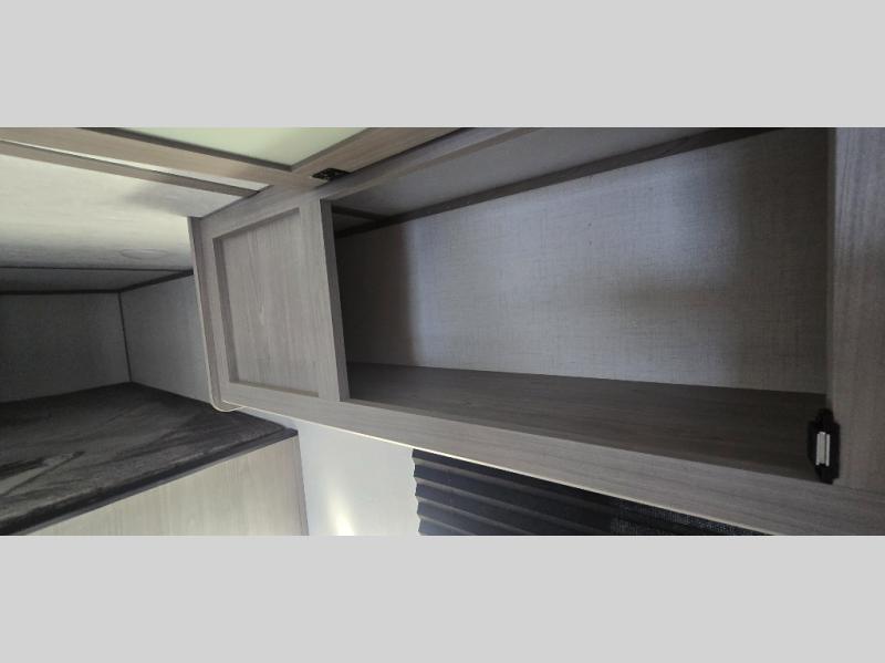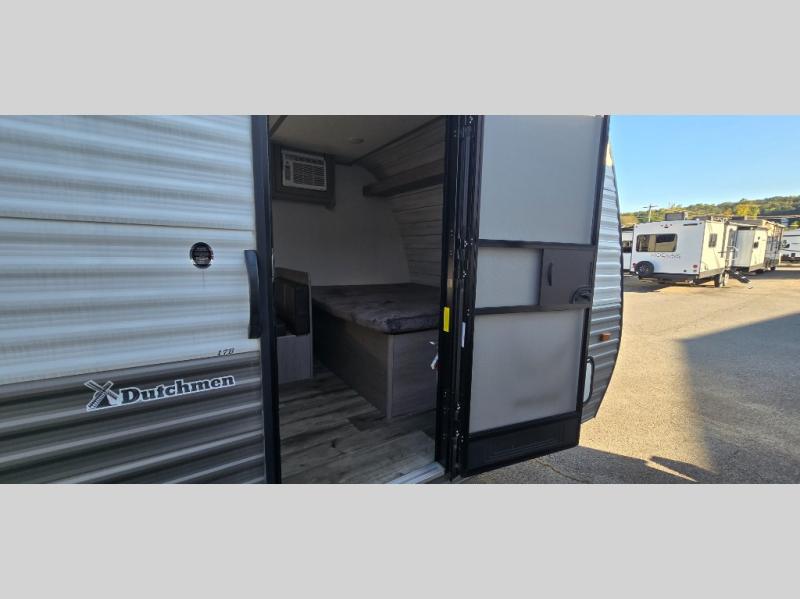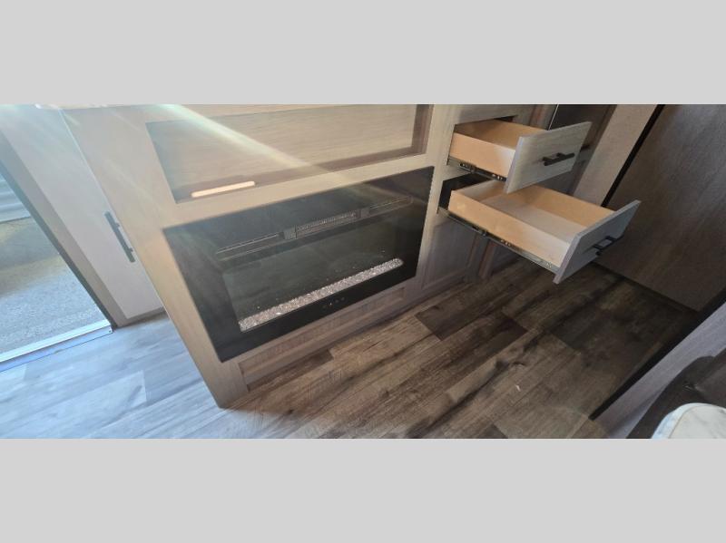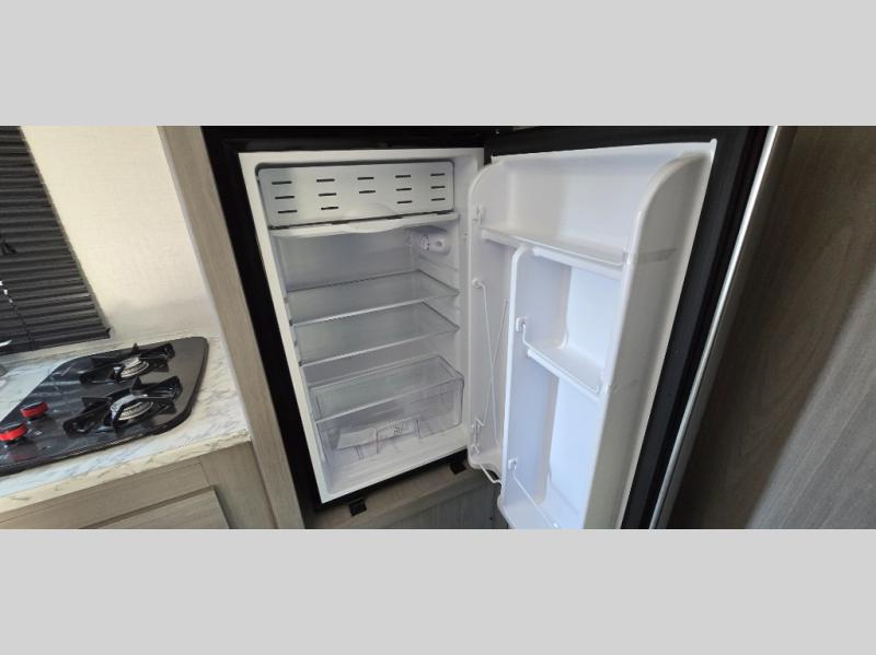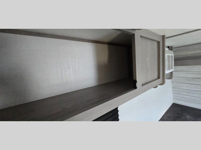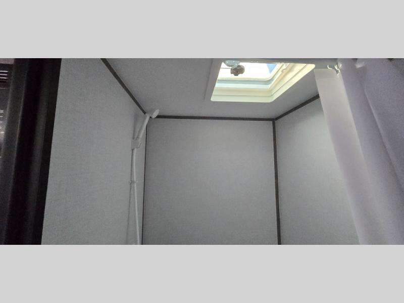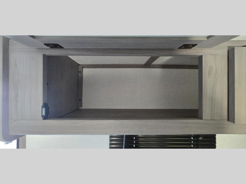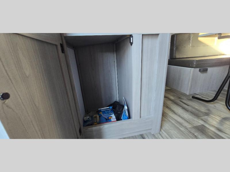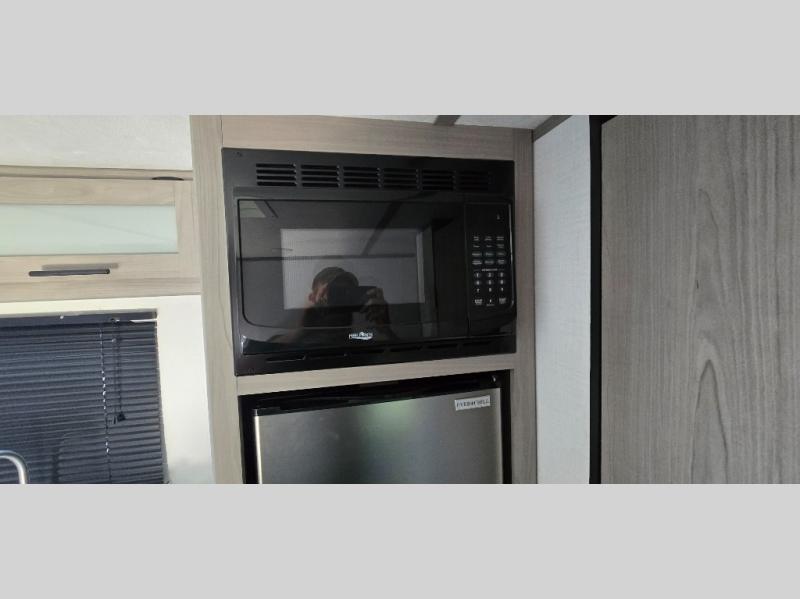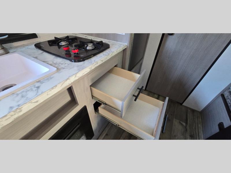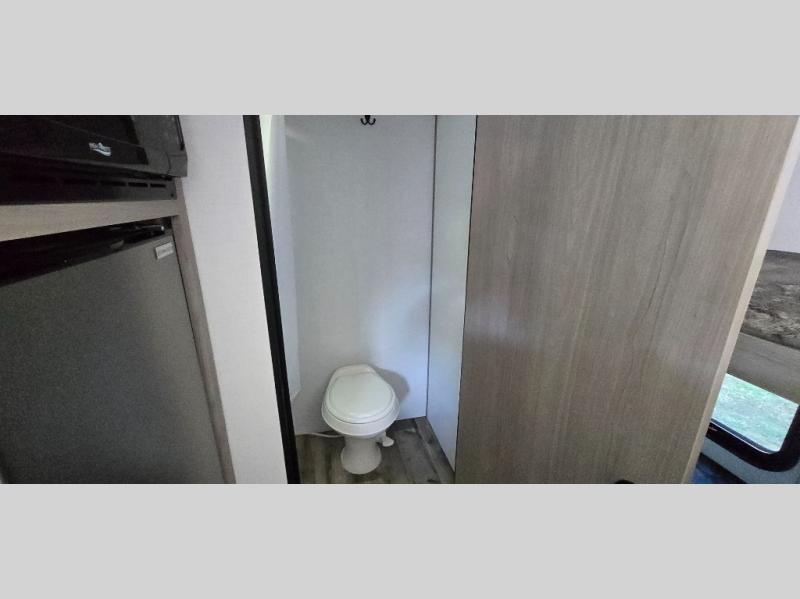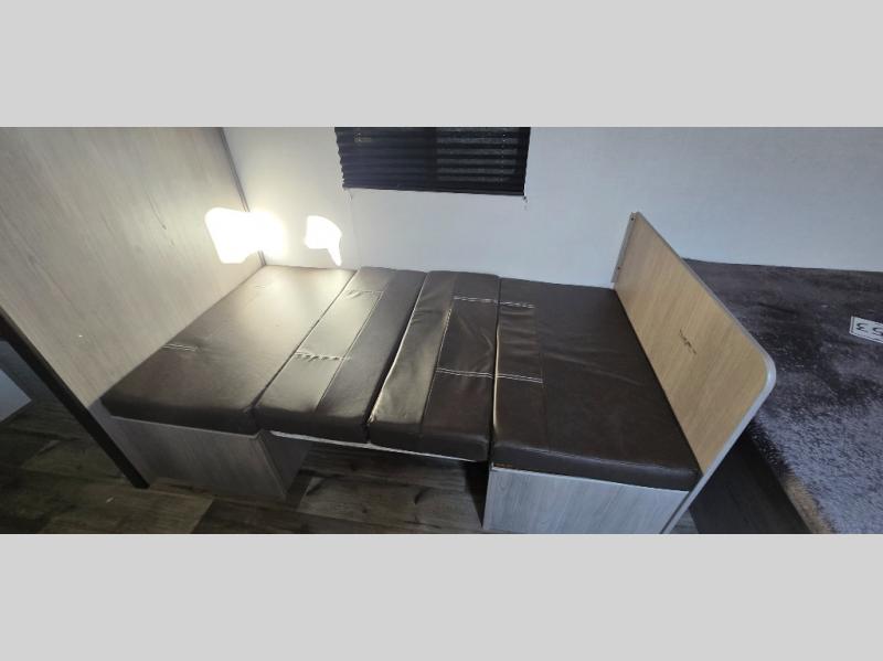 After making dinner on the two burner cooktop or inside the microwave, you can dine at the booth dinette or outside under the 8' power awning if you brought along your camping chairs. Either way you will be comfortable and the dinette may even sleep one person if needed. After playing outdoors all day, everyone can return to get cleaned up in the private toilet and shower room then fall asleep on the queen bed up front or the bunk beds in the rear. And everyone can wake up the next morning to do it over again.