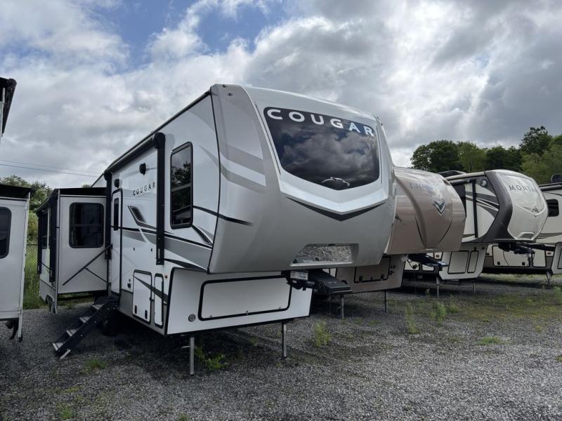 Spend more time having fun and less time worrying about your RV with the Keystone Cougar fifth wheel! These units have all that you will need for excellent vacations. The interior comes with 5/8" one-piece DynaSpan® flooring, tall slide outs for added comfort and head room, night roller shades throughout, and residential, raised-panel hardwood cabinet doors and drawers. You will also enjoy decorative crown molding, a 5,500 BTU electric fireplace with thermostat control and remote, and a Max Air exhaust fan with rain sensor. The exterior is also fully outfitted with a convenience center, friction-hinge entry door, electric four-point auto leveling system, and Lippert SolidStep® on the main entry. There is a full pass-through storage with slam-latch baggage doors, an industry-best 80-gallon fresh tank capacity, a 2" accessory hitch with 300-LB storage capacity, and an outside shower.