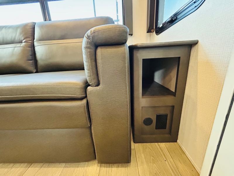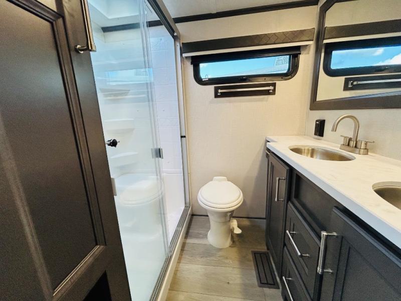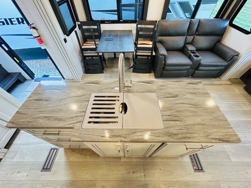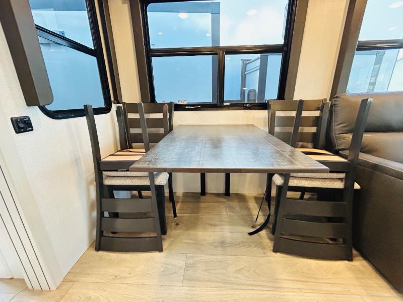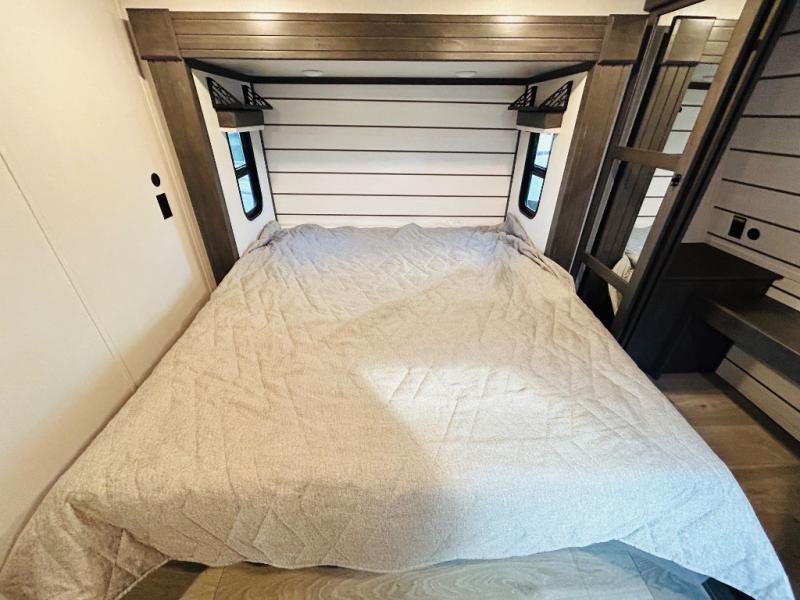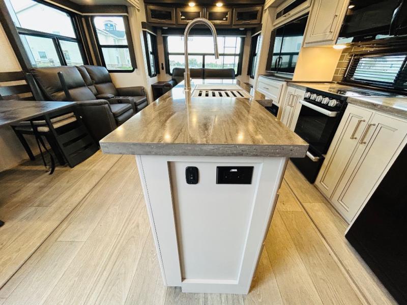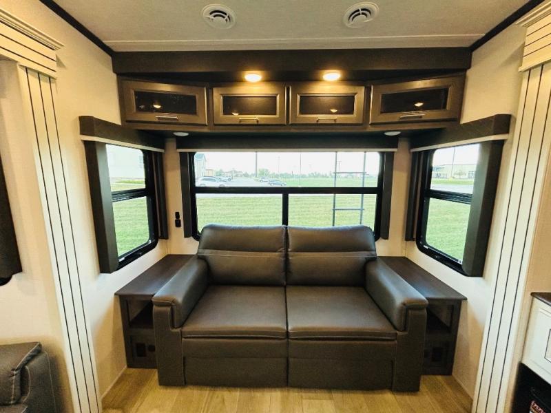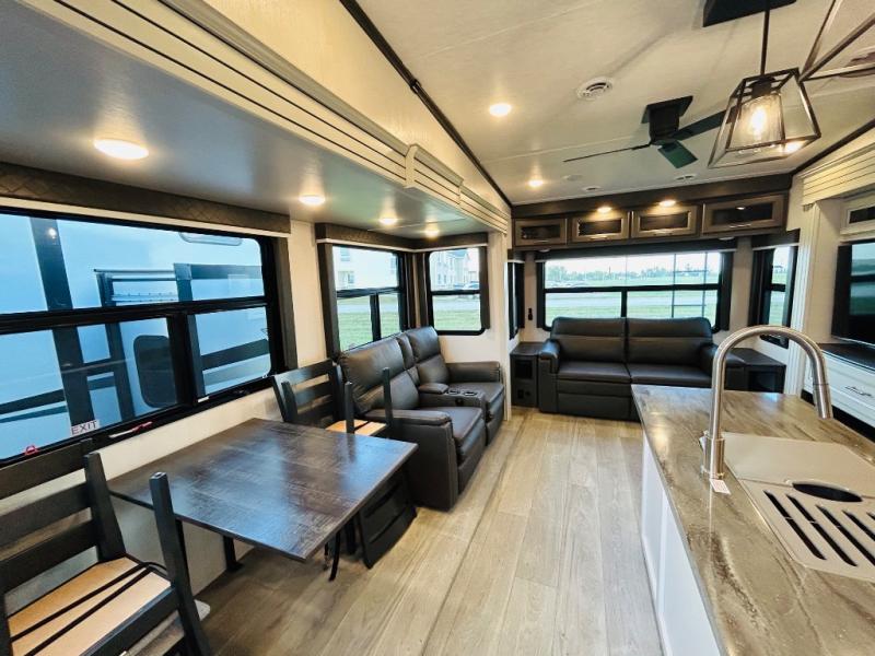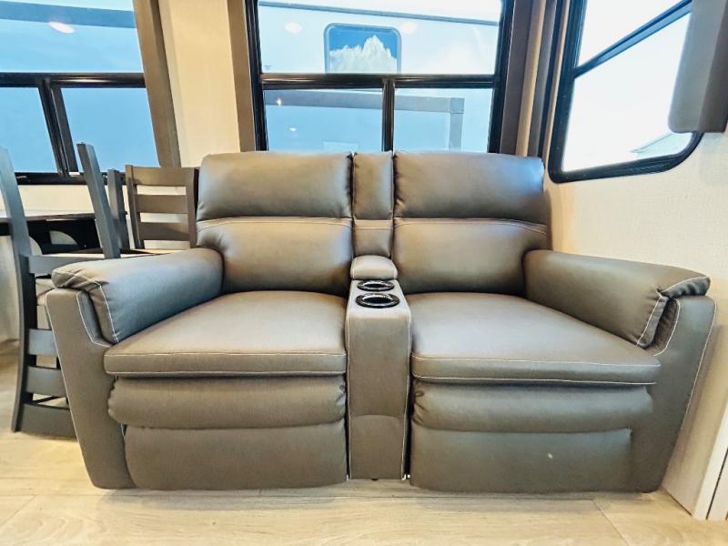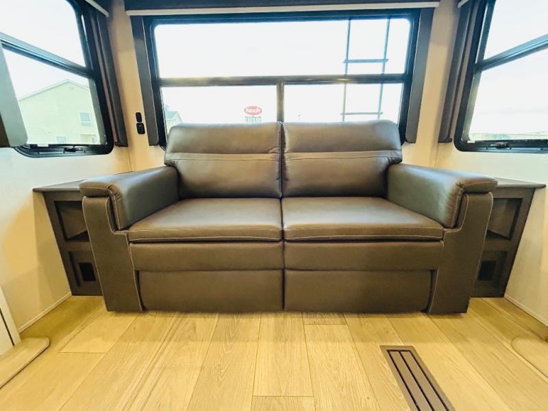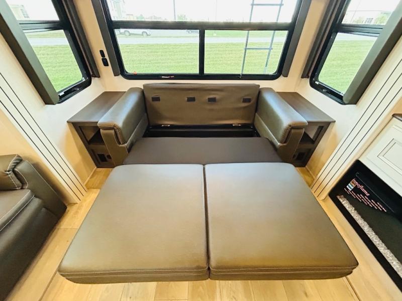 The dual-sink vanity in the full bathroom on this Cougar fifth wheel is what will make your morning routine feel just the same on the road as it does at home! You'll also sleep just as well on the queen-size bed in the front private bedroom, and there is under-bed storage, a full-height wardrobe, and a dresser for all of your personal belongings. As you spend time in the main living area, you'll appreciate having extra space thanks to the set of opposing slides, and the kitchen island will be easy to work around. You'll be able to relax on the tri-fold sleeper sofa and theater seating while you watch the LED HDTV, and the booth dinette is another seating location that can be used for meal time or game nights.