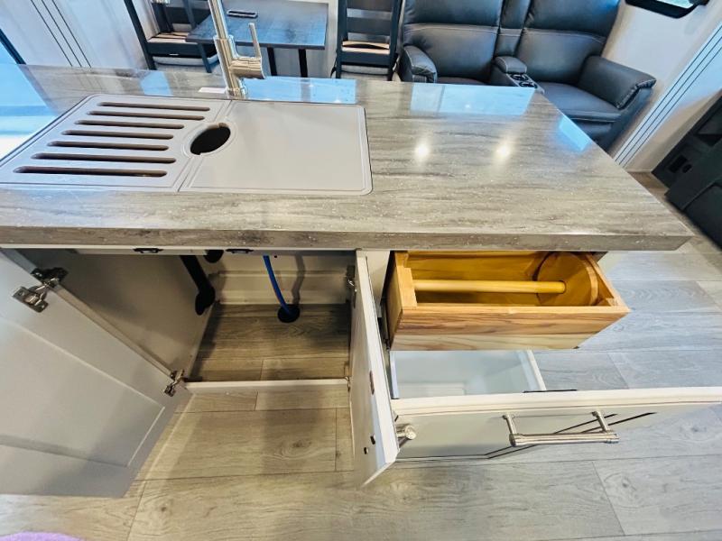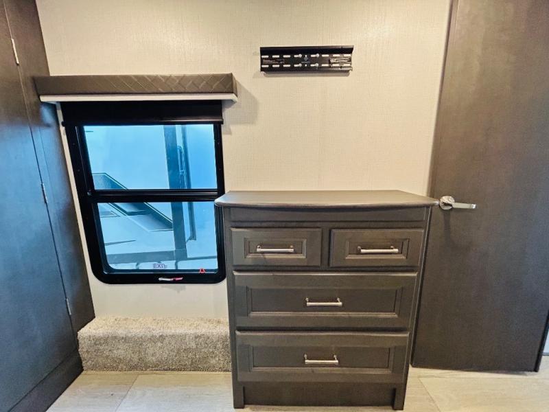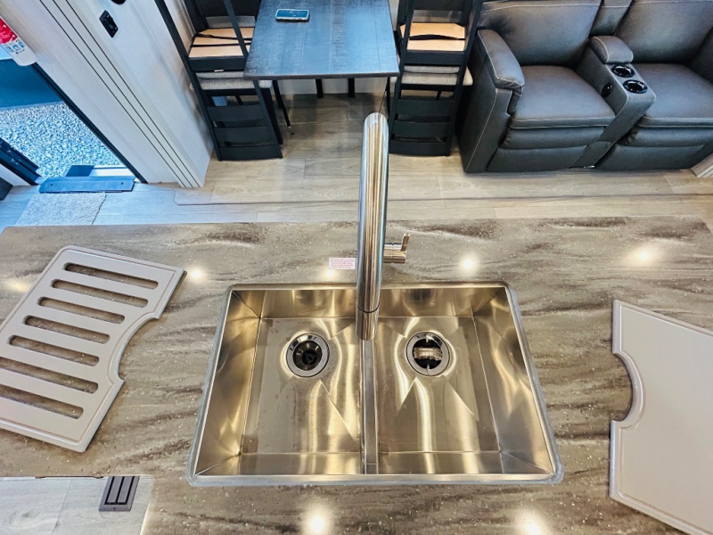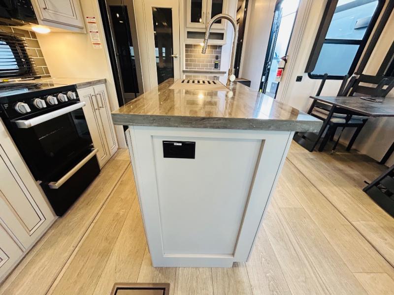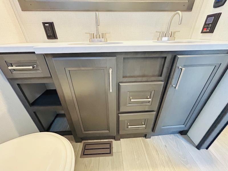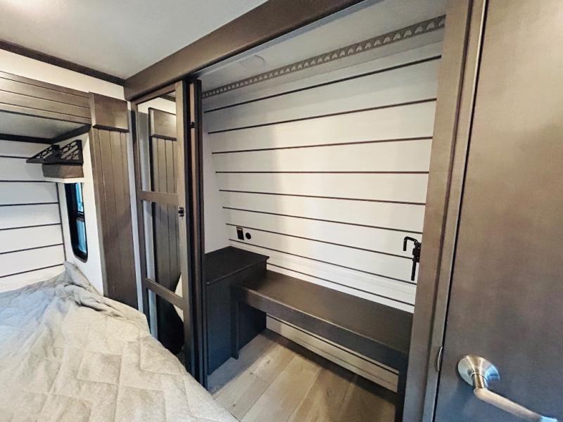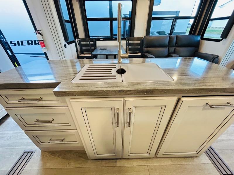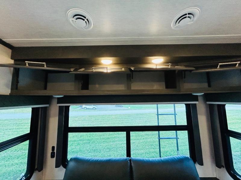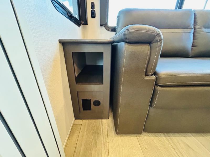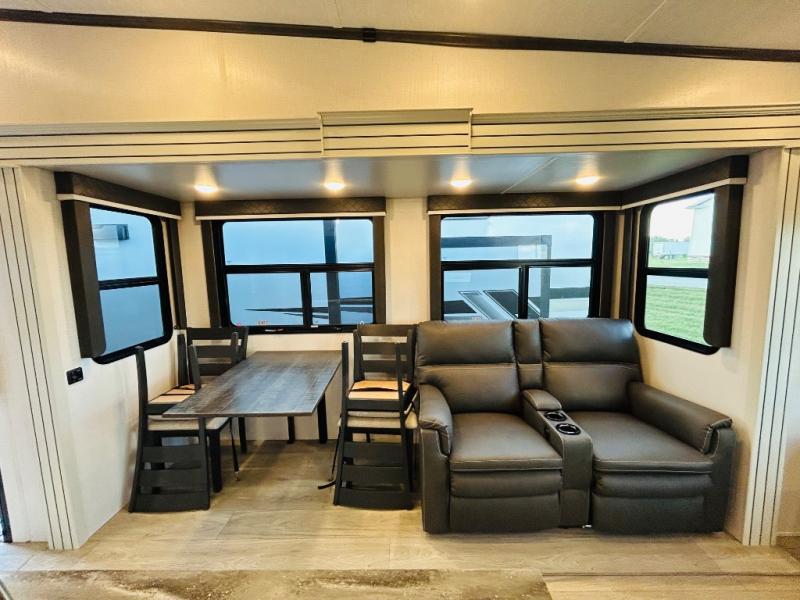 The dual-sink vanity in the full bathroom on this Cougar fifth wheel is what will make your morning routine feel just the same on the road as it does at home! You'll also sleep just as well on the queen-size bed in the front private bedroom, and there is under-bed storage, a full-height wardrobe, and a dresser for all of your personal belongings. As you spend time in the main living area, you'll appreciate having extra space thanks to the set of opposing slides, and the kitchen island will be easy to work around. You'll be able to relax on the tri-fold sleeper sofa and theater seating while you watch the LED HDTV, and the booth dinette is another seating location that can be used for meal time or game nights.