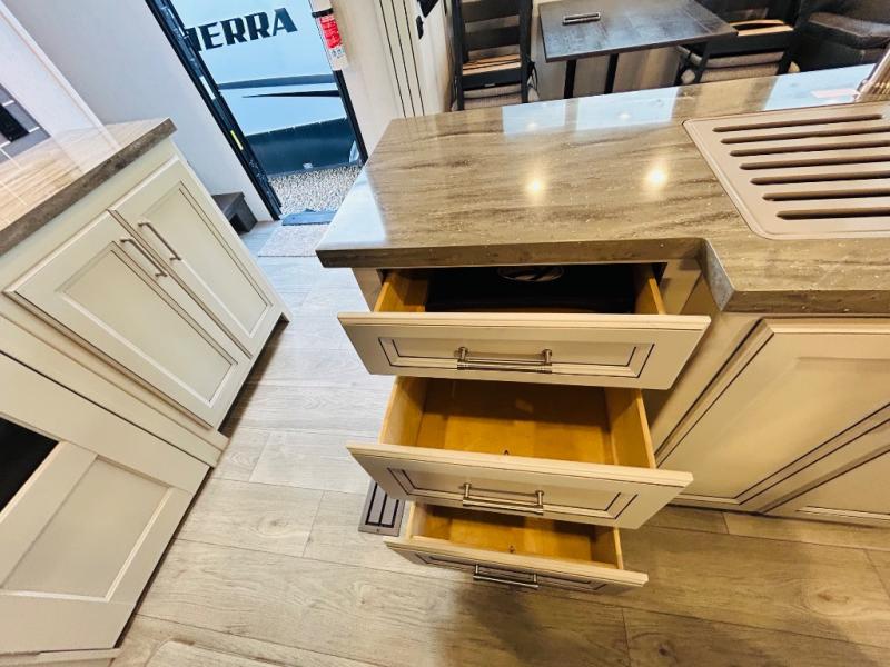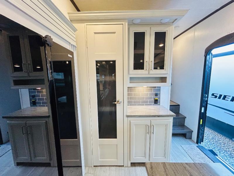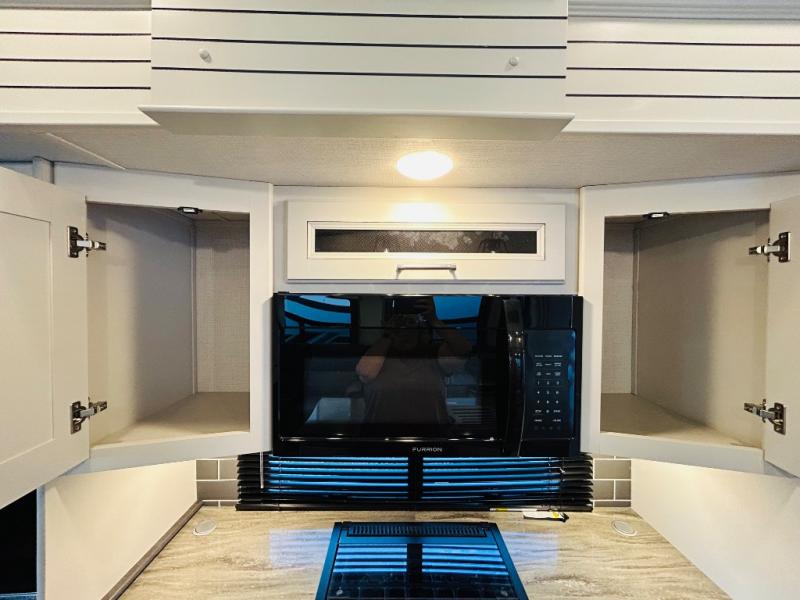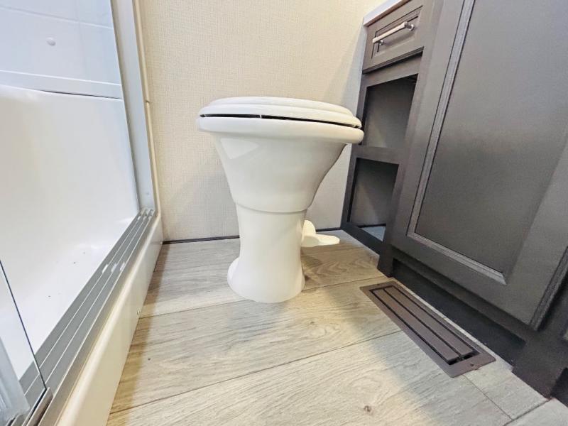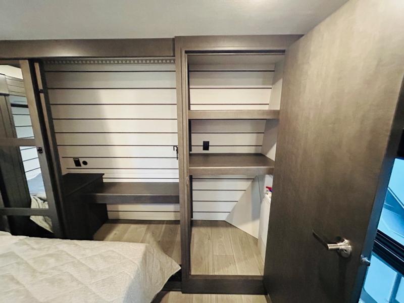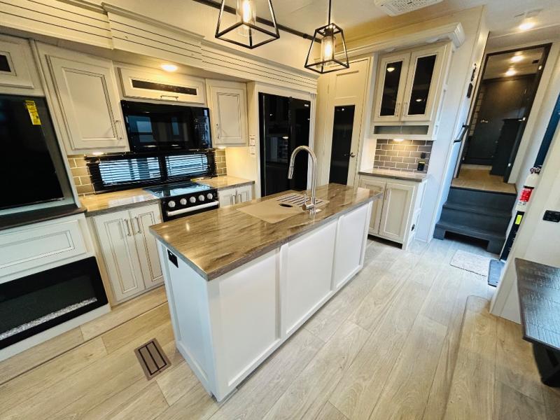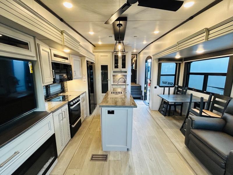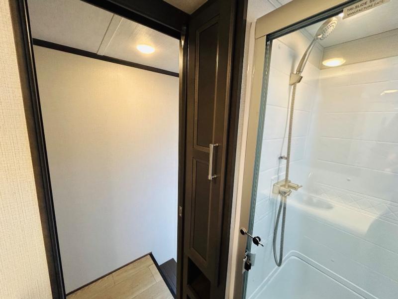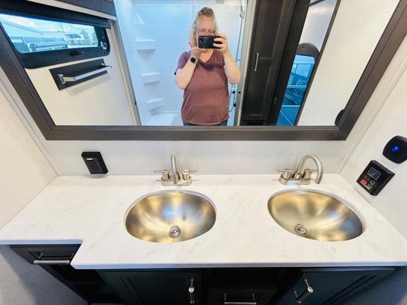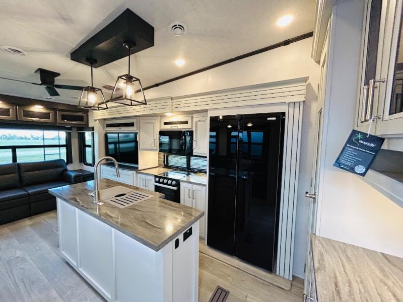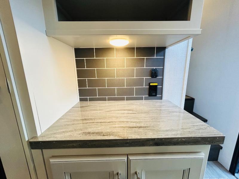 The dual-sink vanity in the full bathroom on this Cougar fifth wheel is what will make your morning routine feel just the same on the road as it does at home! You'll also sleep just as well on the queen-size bed in the front private bedroom, and there is under-bed storage, a full-height wardrobe, and a dresser for all of your personal belongings. As you spend time in the main living area, you'll appreciate having extra space thanks to the set of opposing slides, and the kitchen island will be easy to work around. You'll be able to relax on the tri-fold sleeper sofa and theater seating while you watch the LED HDTV, and the booth dinette is another seating location that can be used for meal time or game nights.
