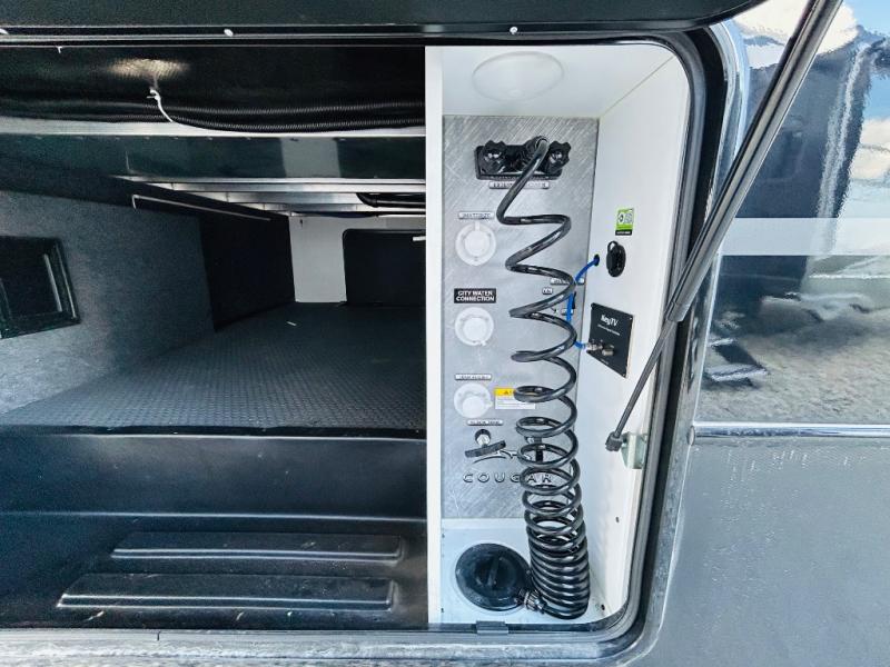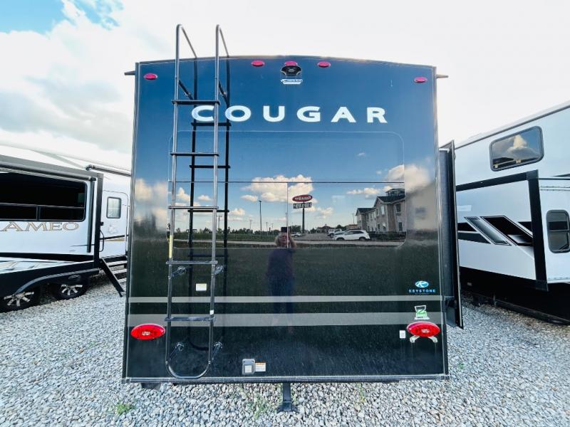 Spend more time having fun and less time worrying about your RV with the Keystone Cougar fifth wheel! These units have all that you will need for excellent vacations. The interior comes with 5/8" one-piece DynaSpan® flooring, tall slide outs for added comfort and head room, night roller shades throughout, and residential, raised-panel hardwood cabinet doors and drawers. You will also enjoy decorative crown molding, a 5,500 BTU electric fireplace with thermostat control and remote, and a Max Air exhaust fan with rain sensor. The exterior is also fully outfitted with a convenience center, friction-hinge entry door, electric four-point auto leveling system, and Lippert SolidStep® on the main entry. There is a full pass-through storage with slam-latch baggage doors, an industry-best 80-gallon fresh tank capacity, a 2" accessory hitch with 300-LB storage capacity, and an outside shower.