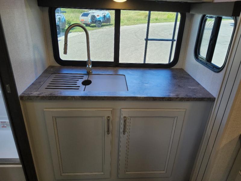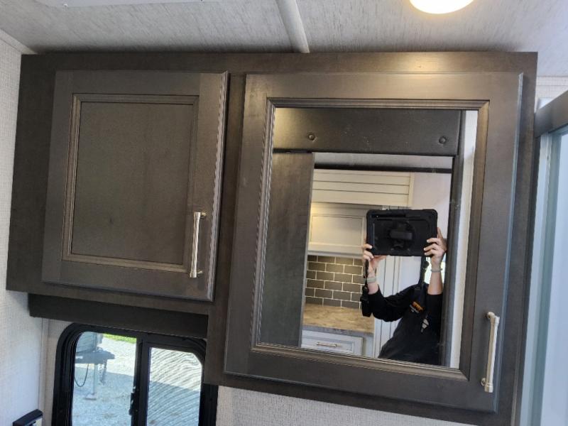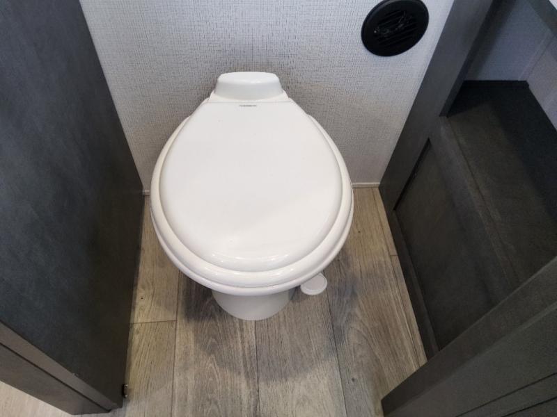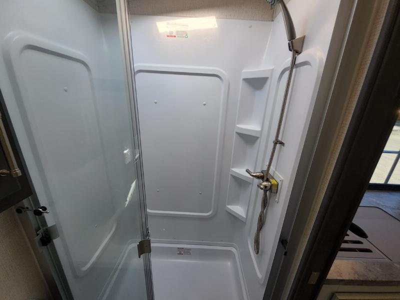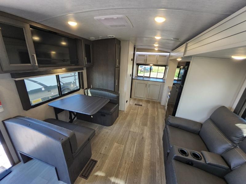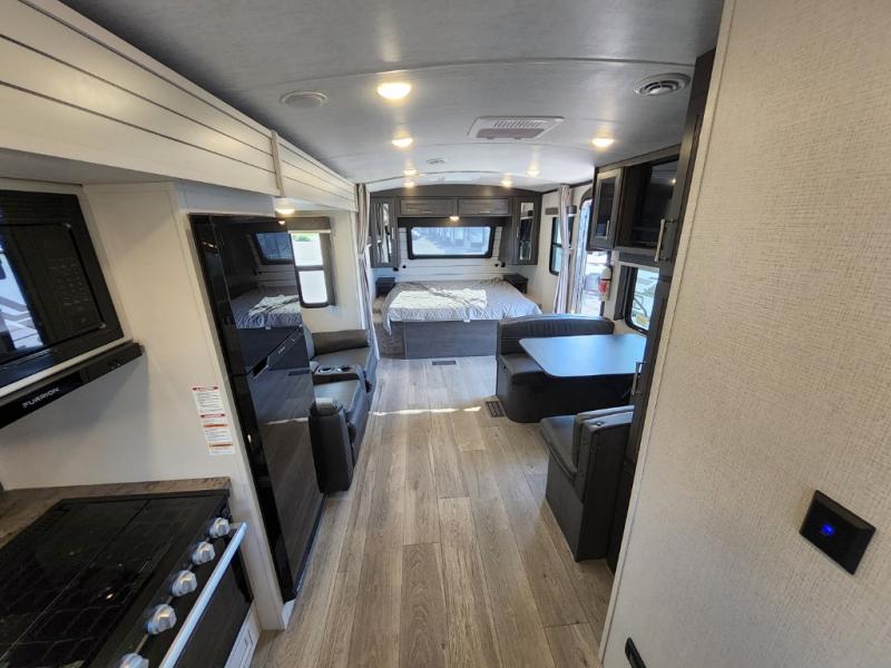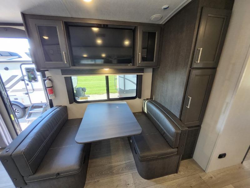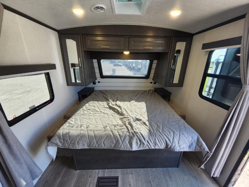 With a king-size bed, this Cougar Half-Ton travel trailer shows that you can still be comfortable even while you're away from home! The bed has wardrobes and nightstands on either side to keep your belongings tidy. There is a convenient shoe cubby right as you enter the unit to keep this space picked up as well. Right next to the booth dinette is the pantry, and next to the pantry is the full bathroom which is certainly one of the most valuable features to any trailer.