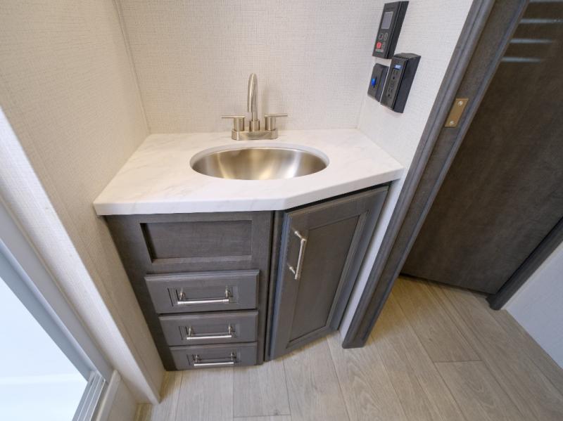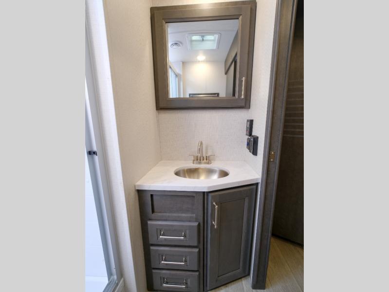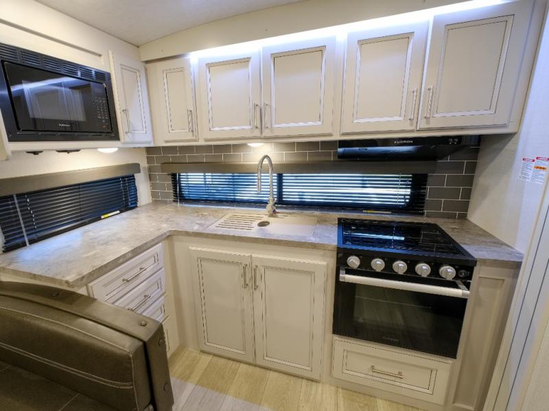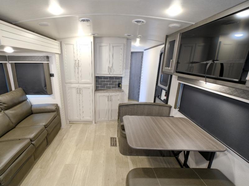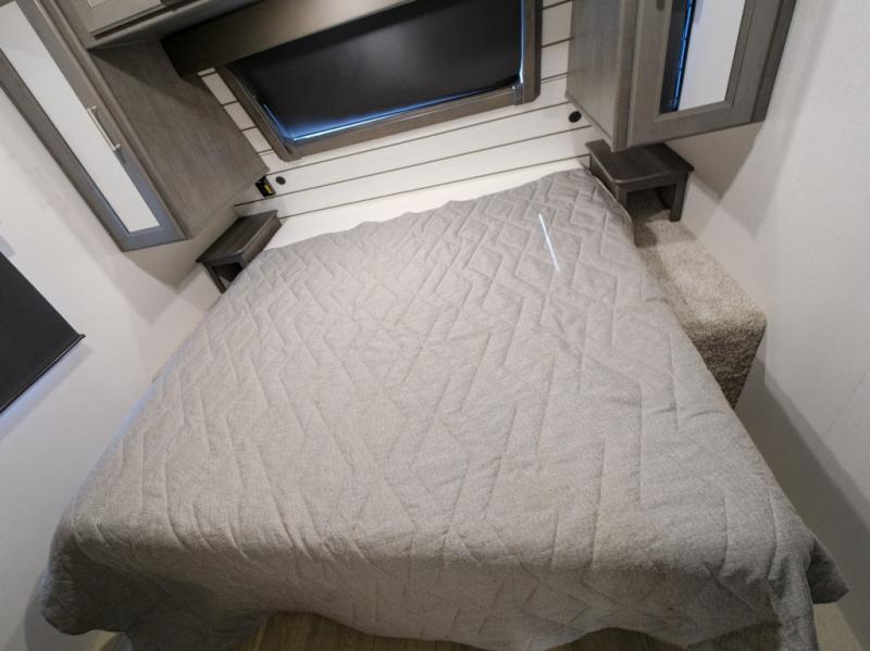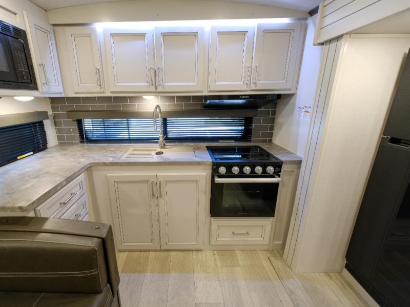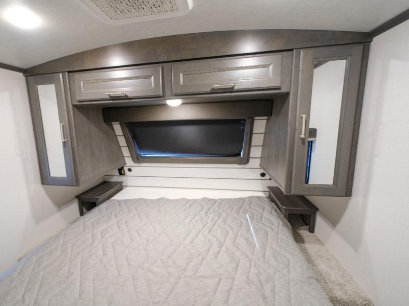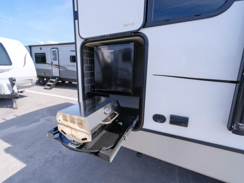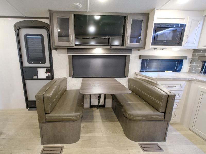If you're ready for fun summers at the lake, make your adventures complete with this travel trailer in tow. The rear kitchen includes ample counter space to prep burgers, and you can take your preparations outside to cook on the outdoor kitchen! If the weather is nice, you might just want to eat outside too under the 18' power awning, or dine inside at the booth dinette. There is also a tri-fold sleeper sofa within the large slide out and an LED HDTV for movie nights. You'll find plenty of storage throughout, including a kitchen pantry, overhead cabinets, plus dual bedside drawers on either side of the king bed!