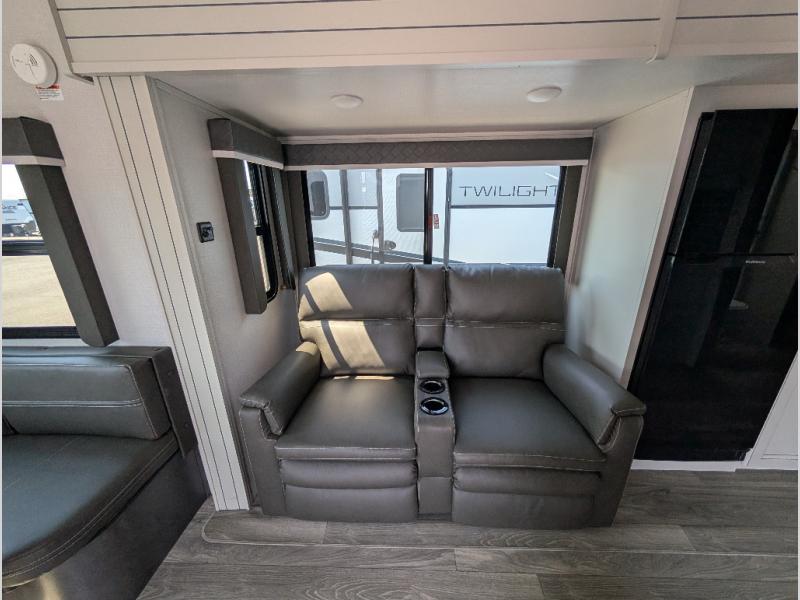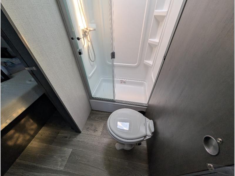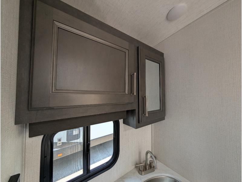 This Cougar Half-Ton travel trailer has an excellent dining area with its huge rear U-shaped dinette! Right next to the dinette is a large slide out that holds the 68" tri-fold sleeper sofa, 10.4 cu. ft. refrigerator, and a pantry. The kitchen has been excellently appointed with a Furrion range, seamless, pressed countertops, a stainless steel undermount sink, and a microwave, and you will be grateful that you can access both sides of the walk-through bathroom. The private bedroom is ultra convenient with its exterior entrance, king-size bed, and dual wardrobes and dual nightstands.