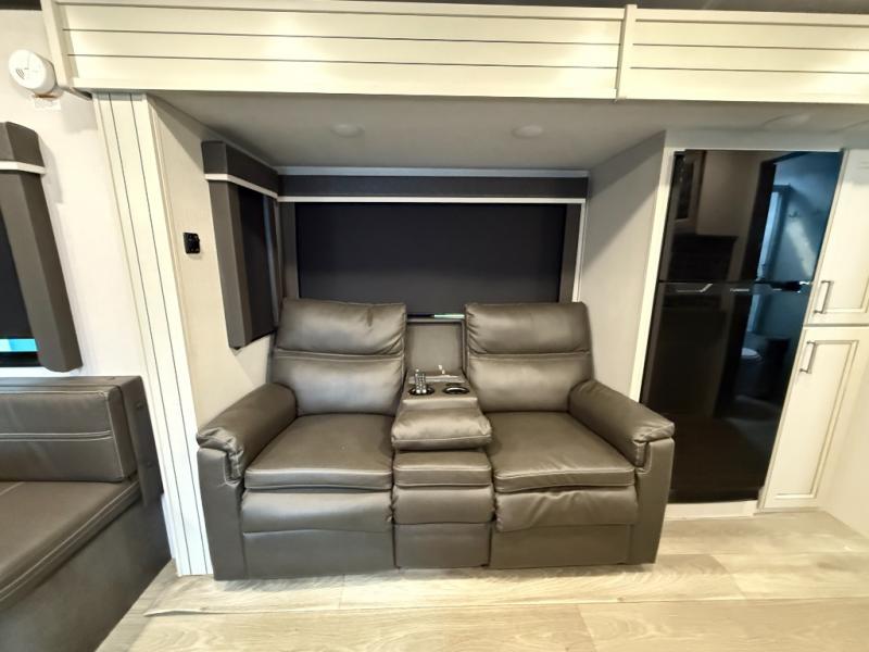 This Cougar Half-Ton travel trailer has an excellent dining area with its huge rear U-shaped dinette! Right next to the dinette is a large slide out that holds the 68" tri-fold sleeper sofa, 10.4 cu. ft. refrigerator, and a pantry. The kitchen has been excellently appointed with a Furrion range, seamless, pressed countertops, a stainless steel undermount sink, and a microwave, and you will be grateful that you can access both sides of the walk-through bathroom. The private bedroom is ultra convenient with its exterior entrance, king-size bed, and dual bedside drawers and dual nightstands.