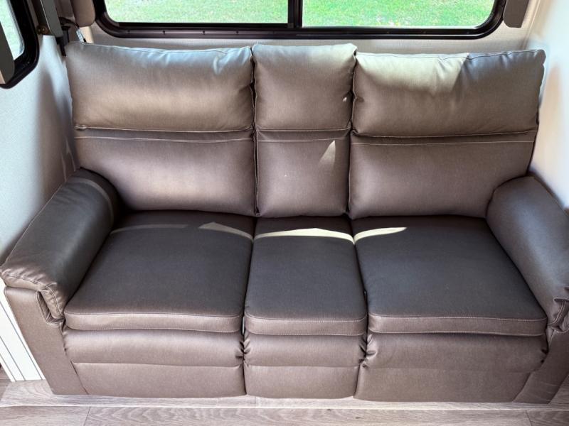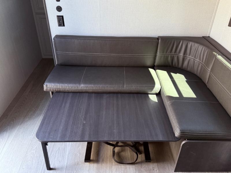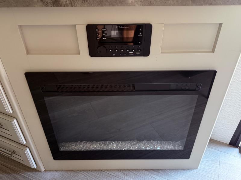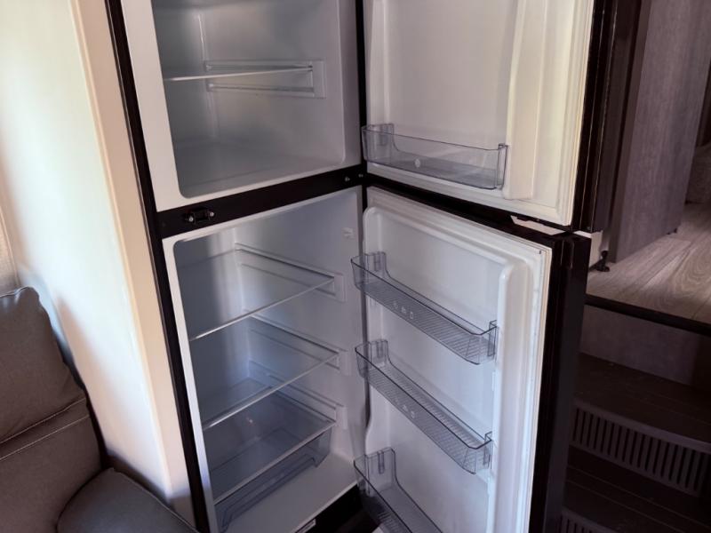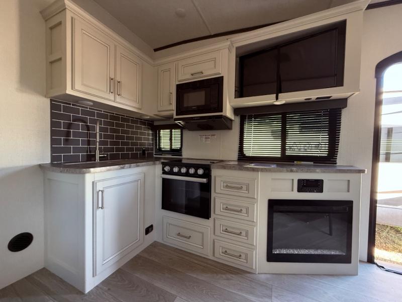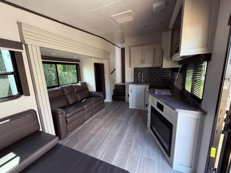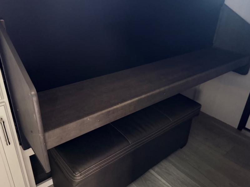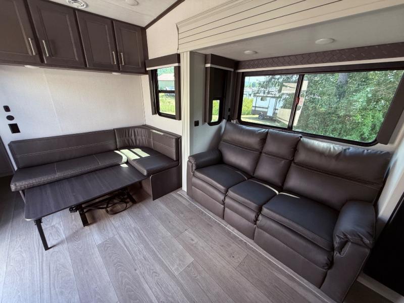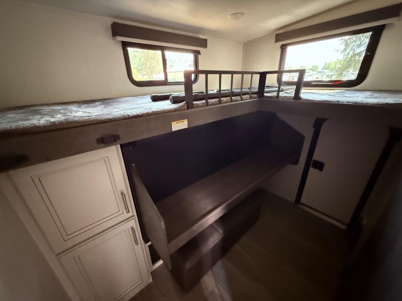 If you're needing additional sleeping space or a place to work on the road, take a look at this fifth wheel! The bunkhouse includes three bunks, and the lower bunk can swing up so you can work at the desk. There is also an exterior cargo door here so you can pack luggage right into the bunkhouse. You will have your own private bedroom up front with a walk-around queen bed, a wardrobe slide, plus dual wardrobes and nightstands. The main living area will be a favorite hangout spot with its tri-fold sofa, L-shaped sofa with a table dinette and an ottoman, plus an LED HDTV. You can even add the optional fireplace for a more at-home feel. This model also includes a 20' power awning, LCI solid steps, and an exterior mini refrigerator and Capital griddle for breakfast outdoors!