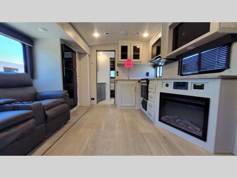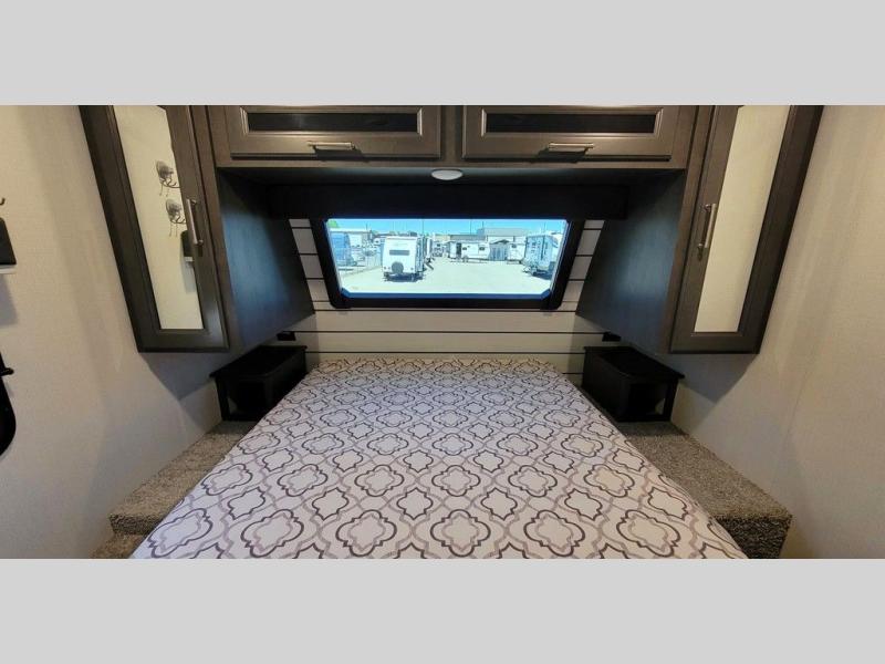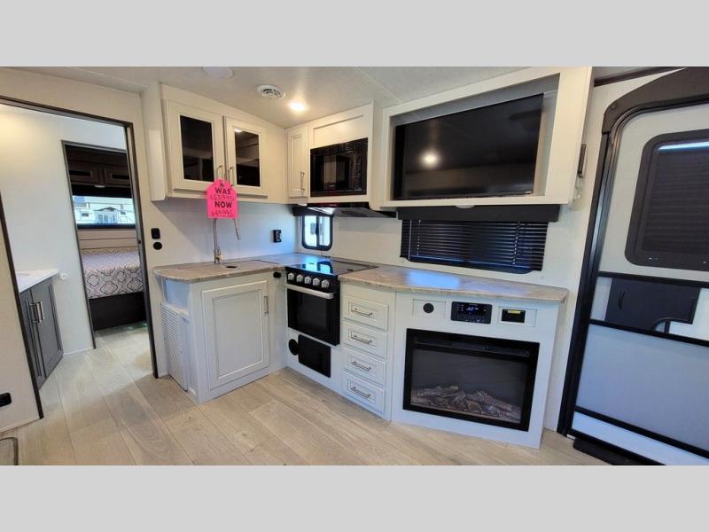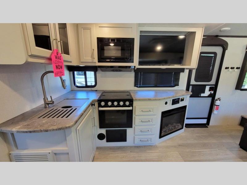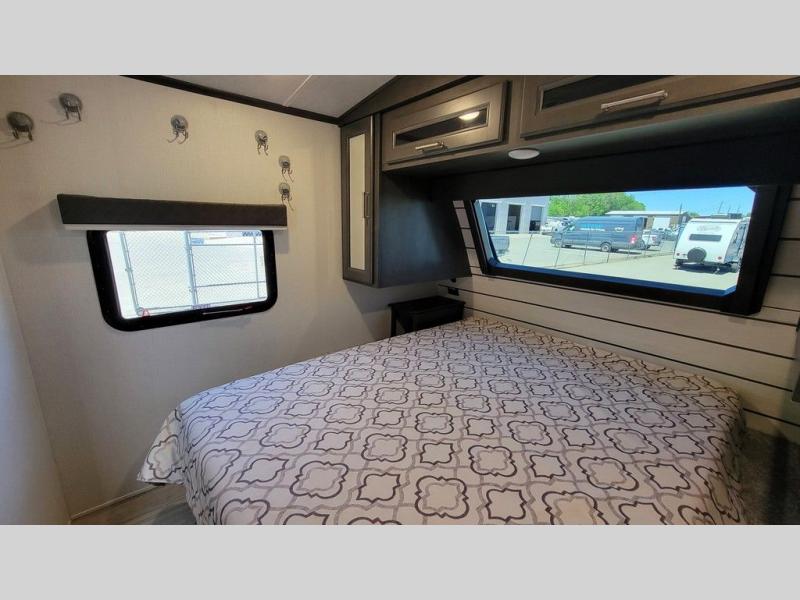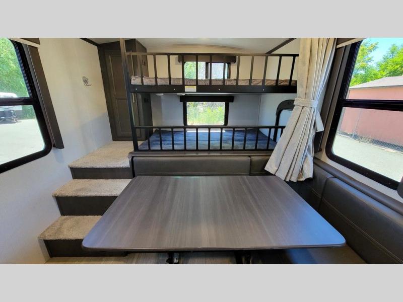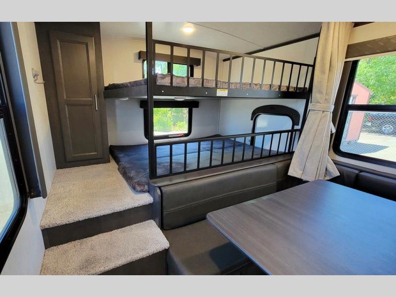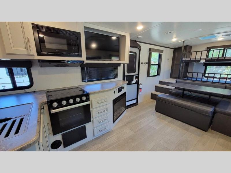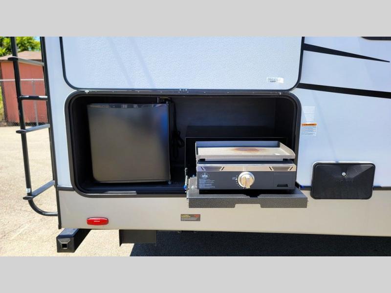You're going to love camping with friends or family in this spacious travel trailer. There are double-size bunks in the back, and the lower bunk flips up for storage of luggage, camp gear, or toys. The group can relax in the main living area that includes a tri-fold sleeper sofa within the large slide out, plus there is an L-shaped booth dinette with an ottoman/bench seat for a unique set-up. There is even a fireplace and an LED HDTV for those rainy days you stay indoors. This model includes all the appliances indoors needed to prepare meals each day, plus there is a capital grill outdoors and an exterior mini fridge for cold drinks. And check out the 19' power awning that will shade you as you cook up lunch!