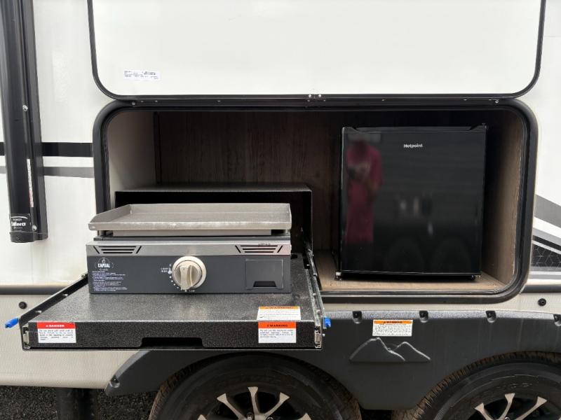 How does a queen bed slide with an optional king bed in the master suite sound? With this Cougar Half-Ton travel trailer, you'll have extra floor space and a full-width wardrobe allowing you to stay at your favorite campsite for long periods of time. The second slide located in the main living and kitchen area opens up this space for you to enjoy time spent inside just as much as outdoor adventures. The furniture even doubles as sleeping space for the kids or overnight guests. The rear kitchen layout is a convenience, and you will appreciate all the counter space for preparing and serving meals. You will find hidden storage behind the entertainment center, and next to the entertainment center is a pantry where you can store your favorite snacks.