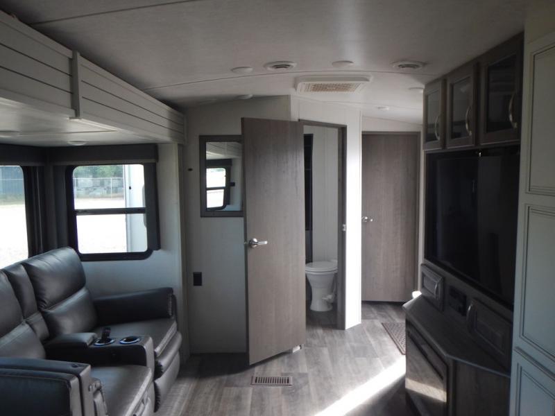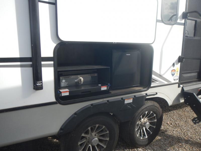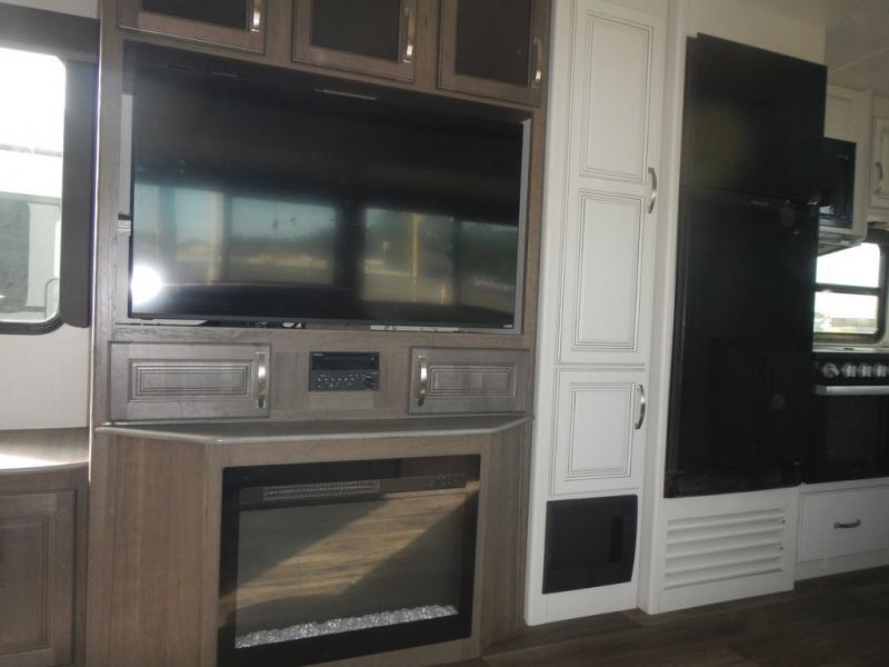 How does a queen bed slide with an optional king bed in the master suite sound? With this Cougar Half-Ton travel trailer, you'll have extra floor space and a full-width wardrobe allowing you to stay at your favorite campsite for long periods of time. The second slide located in the main living and kitchen area opens up this space for you to enjoy time spent inside just as much as outdoor adventures. The furniture even doubles as sleeping space for the kids or overnight guests. The rear kitchen layout is a convenience, and you will appreciate all the counter space for preparing and serving meals. You will find hidden storage behind the entertainment center, and next to the entertainment center is a pantry where you can store your favorite snacks.