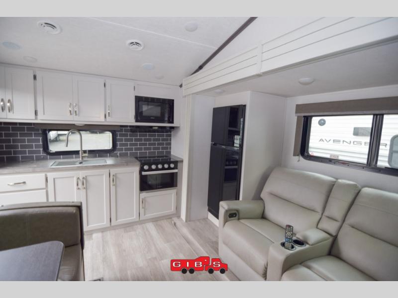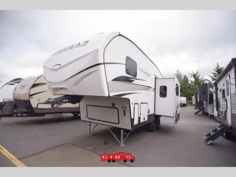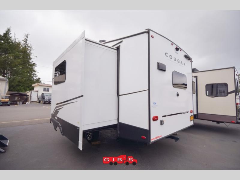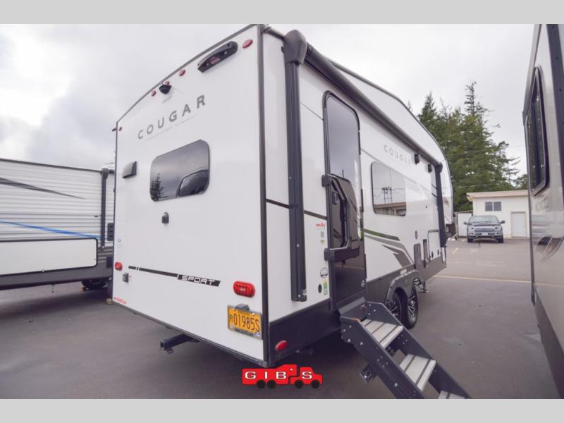 Your family of five or six will love traveling in this Cougar Sport lightweight fifth wheel! Enter to find a convenient rear kitchen layout just steps inside the door. Drop your shoes off in the shoe cubby to your right at the door, and relax on either the tri-fold sleeper sofa or at the booth dinette. The sofa and a 12 volt refrigerator are situated within the slide for added roominess. Head up the steps to a complete bath and private front bedroom featuring a queen size bed with dual shirt wardrobes and nightstands on both sides of the bed. There is also a wardrobe off the foot of the bed along the inside wall with two convenient drawers as well. The bathroom offers a shower with a skylight for added headroom and natural lighting. You will also appreciate the medicine cabinet over the sink for your personal items. Back down to the main living and kitchen area, a nice size pantry will hold all of your dry goods and snacks, and there is ample storage in the overhead cabinets above the dinette on either side of the TV, plus in the kitchen area all along the rear wall. Here you can cook your family their camp favorites using either the three burner range with oven, or overhead microwave. Outside, a 17' awning provides added living space protected from the elements!