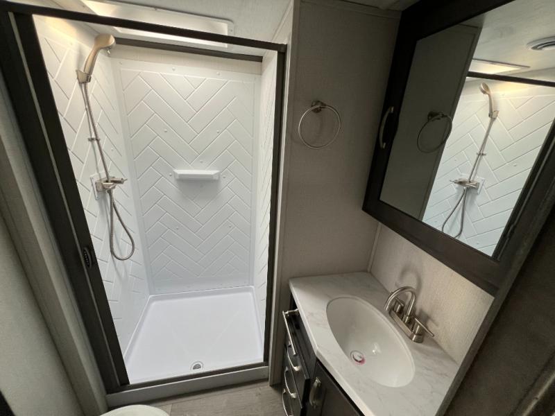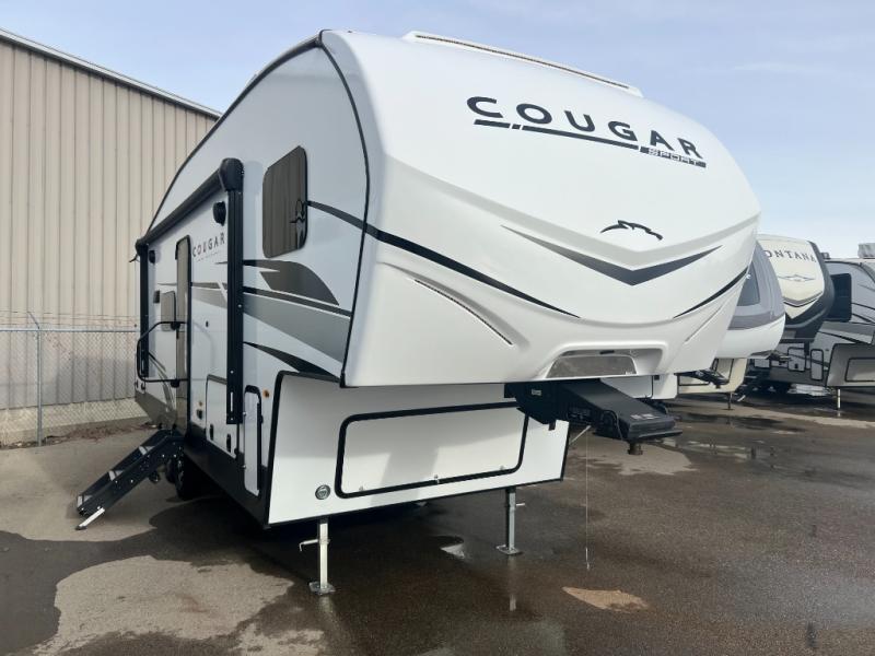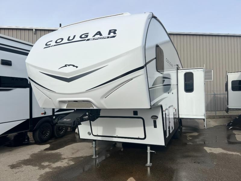 The Cougar Sport structural I-beam frame with stamped steel cross-members and outriggers, plus its laminated sidewalls with five-sided aluminum superstructure and Alpha Super Flex roof membrane are what active RVers love about the construction of the Cougar line. The Cougar Sport models are no exception when it comes to a great package, as well as being smaller and lighter weight than their big brother Cougar models. A one-piece, heated and enclosed polypropylene underbelly means a longer camping season. On the inside, residential shaker style hardwood cabinet doors and decorative crown molding, plus seamless pressed countertops and an on-demand water heater will make your unit feel even more like home. You are also sure to appreciate the shiplap style decorative accent wall behind the bed, a porcelain foot flush toilet in the bathroom, plus residential kitchen hardware, and so much more.