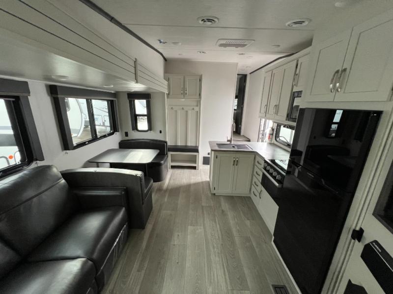 This lightweight fifth wheel is big enough for your small family to camp together! Enter to find a convenient combined kitchen and living space with large slide for added space. The slide features theater seating and a booth dinette which offers ample seating for meals and hanging out. There is a flip up table along the rear wall with a nearby 40" LED TV which features a butler pantry behind. Head up the steps to the right of the entry door to a complete bath and private front bedroom featuring a queen size bed with dual shirt wardrobes and nightstands on both sides of the bed. The bathroom offers a shower with a skylight for added headroom and natural lighting. Outside, a 16' awning provides added living space protected from the elements!