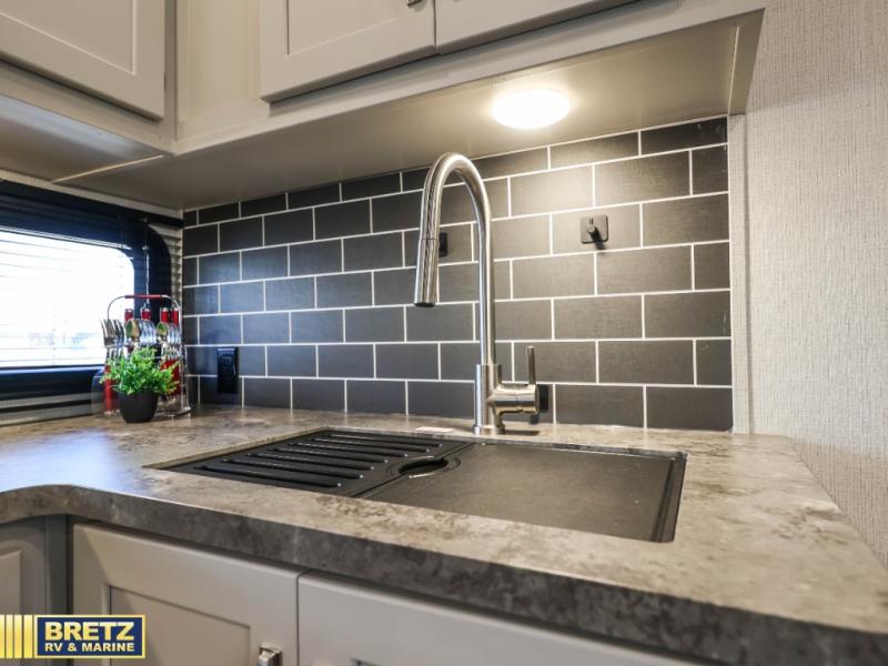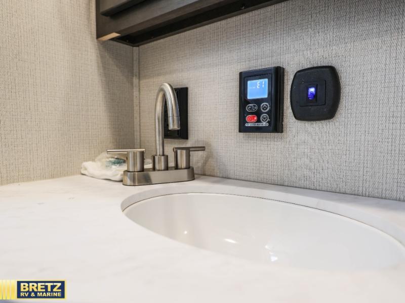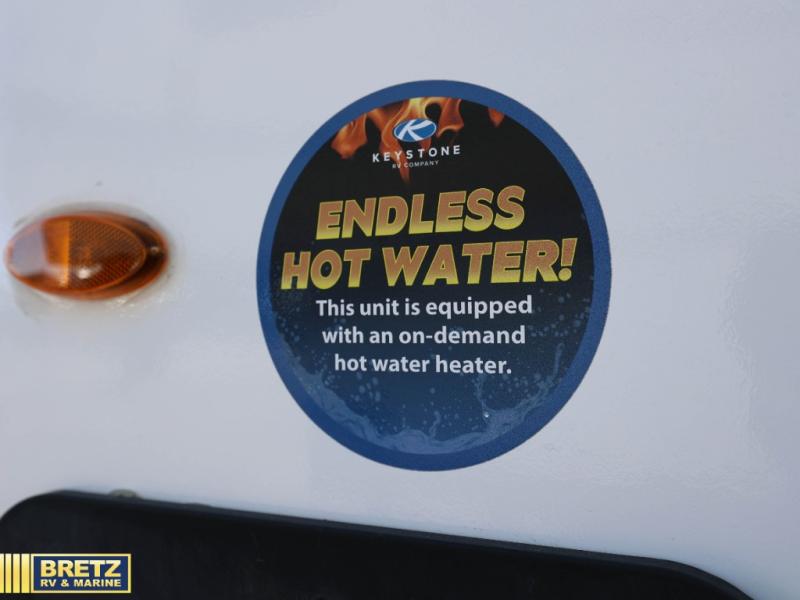 The Cougar Sport structural I-beam frame with stamped steel cross-members and outriggers, plus its laminated sidewalls with five-sided aluminum superstructure and Alpha Super Flex roof membrane are what active RVers love about the construction of the Cougar line. The Cougar Sport models are no exception when it comes to a great package, as well as being smaller and lighter weight than their big brother Cougar models. A one-piece, heated and enclosed polypropylene underbelly means a longer camping season. On the inside, residential shaker style hardwood cabinet doors and decorative crown molding, plus seamless pressed countertops and an on-demand water heater will make your unit feel even more like home. You are also sure to appreciate the shiplap style decorative accent wall behind the bed, a porcelain foot flush toilet in the bathroom, plus residential kitchen hardware, and so much more.