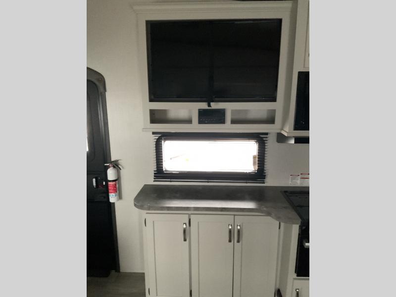 The Cougar Sport structural I-beam frame with stamped steel cross-members and outriggers, plus its laminated sidewalls with five-sided aluminum superstructure and Alpha Super Flex roof membrane are what active RVers love about the construction of the Cougar line. The Cougar Sport models are no exception when it comes to a great package, as well as being smaller and lighter weight than their big brother Cougar models. A one-piece, heated and enclosed polypropylene underbelly means a longer camping season. On the inside, residential shaker style hardwood cabinet doors and decorative crown molding, plus seamless pressed countertops and an on-demand water heater will make your unit feel even more like home. You are also sure to appreciate the shiplap style decorative accent wall behind the bed, a porcelain foot flush toilet in the bathroom, plus residential kitchen hardware, and so much more.