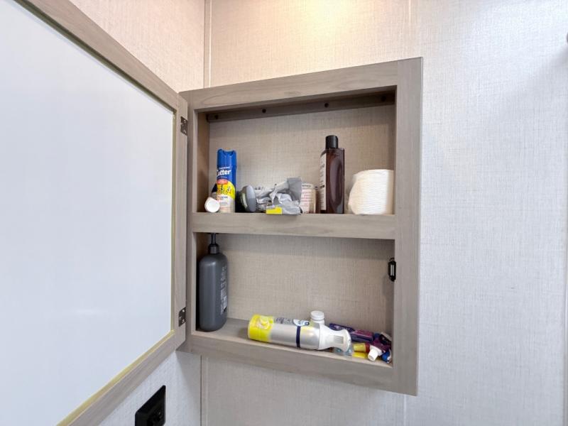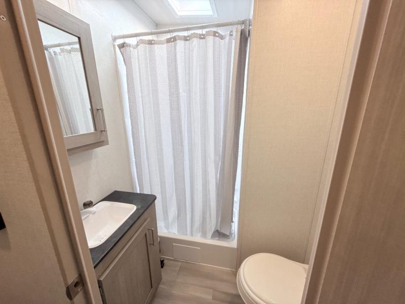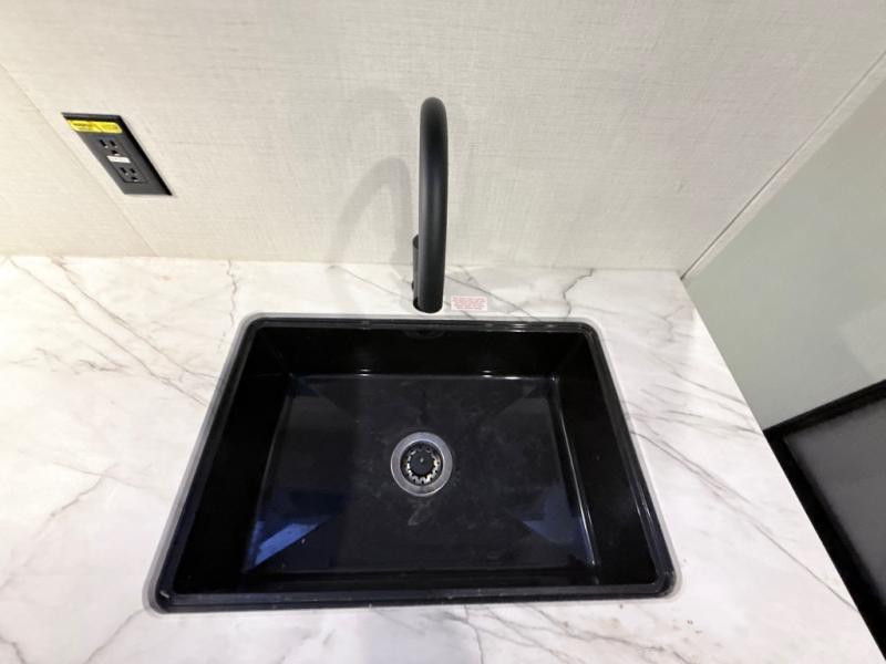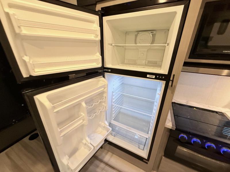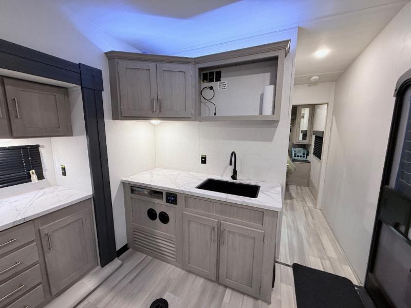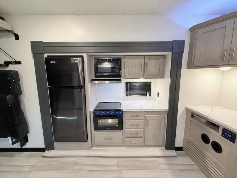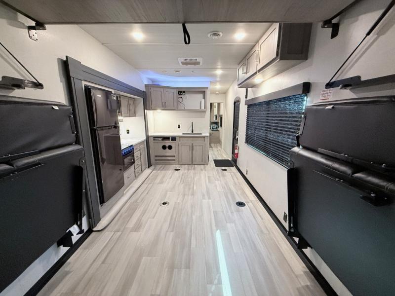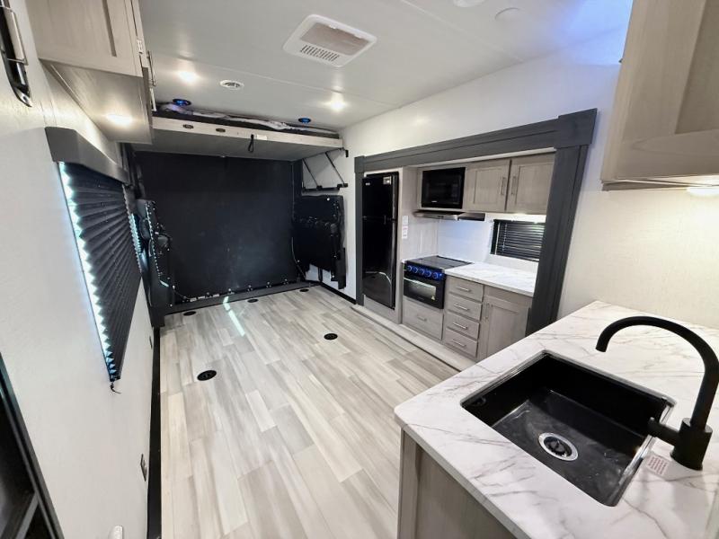 This open concept toy hauler is sure to meet all of your needs. There is a slide out for more space, a full kitchen with a Furrion three burner gas range and a microwave oven to prepare meals, plus a 10 cu. ft. 12V refrigerator to keep food fresh. You'll find comfortable seating space on the dual opposing sofas with a top queen bed, and there is TV prep if you want to add some entertainment. The RV queen bed in the front master bedroom will bring a great night's rest, and the dual entry bath lets you clean up after trail riding. When you're ready to head home, the 13' 4" garage area includes frame welded tie downs to keep your toys secure.