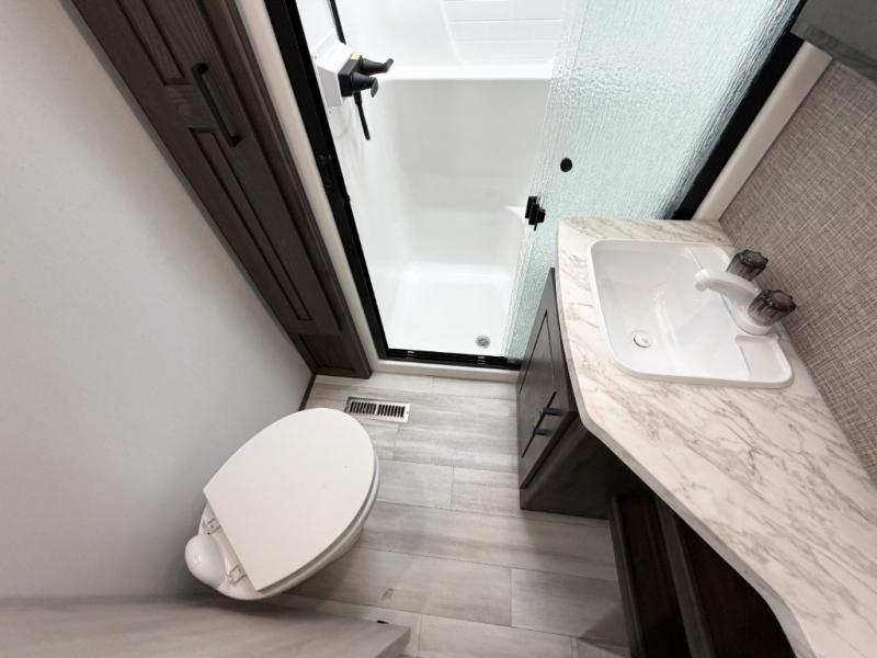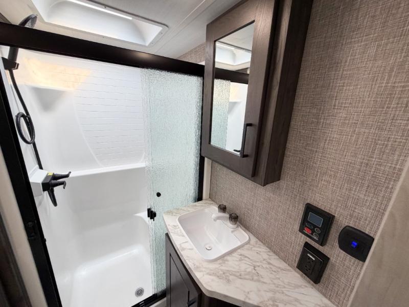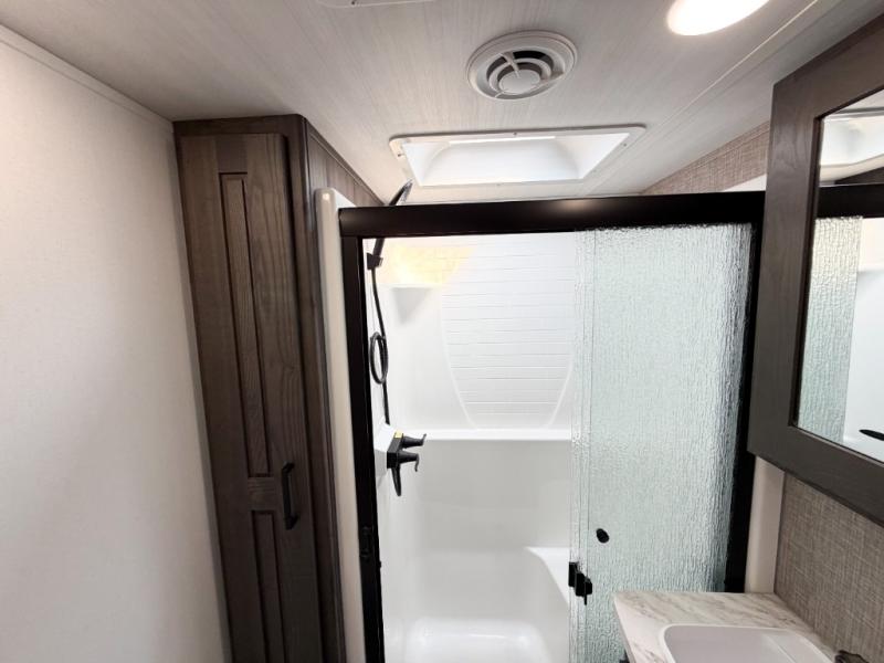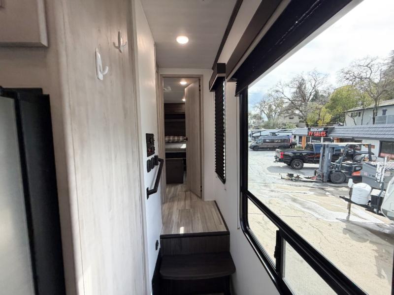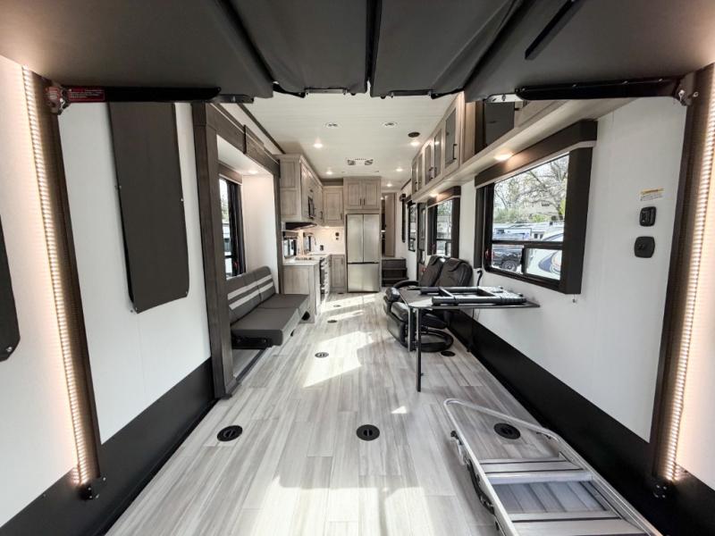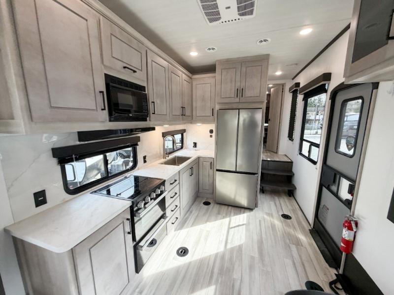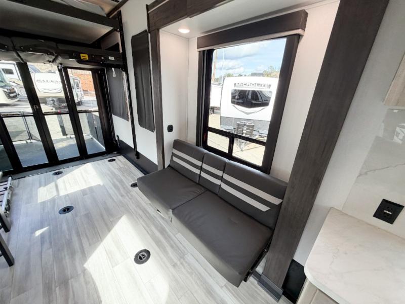 Get ready for fun in this spacious toy hauler with an impressive 23' garage area! After the toys are unloaded, you can fill them up using the 30 gallon fuel station, then head out to kick up some mud! The full bath will let you clean up when you return, and you can start dinner on the Furrion three burner gas range for your whole crew. There is seating space at the flip-up table, the two swivel chairs with a second flip-up table in between, plus a HappiJack sofa/folding bed. And don't forget about the dual opposing sofas in the garage! Your guests can make their bed here at night, while you take the Fuzion king bed in the front private bedroom. A wardrobe slide also comes standard in the bedroom, along with two additional wardrobes and dual nightstands for your things.