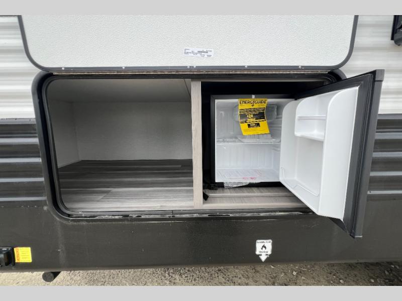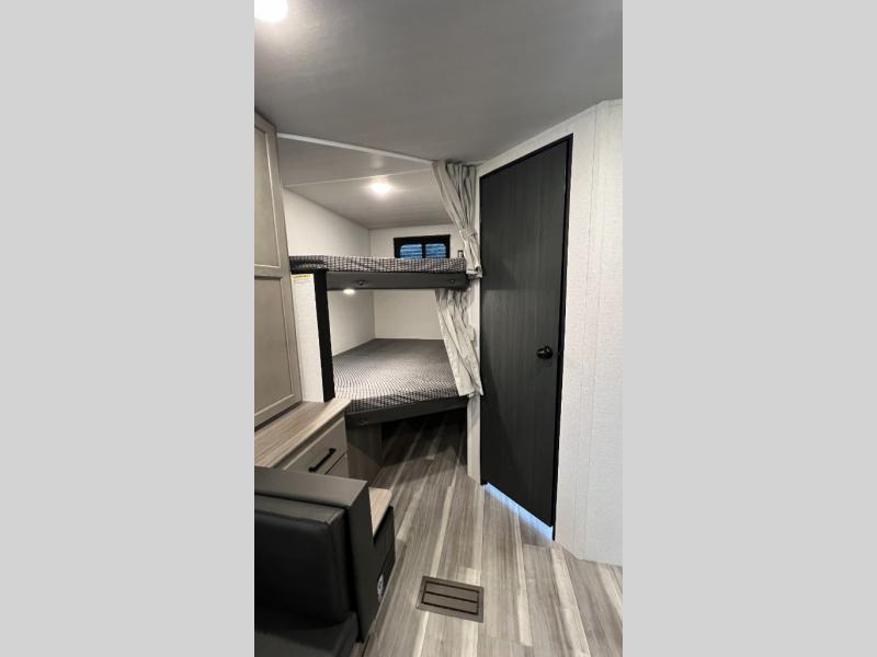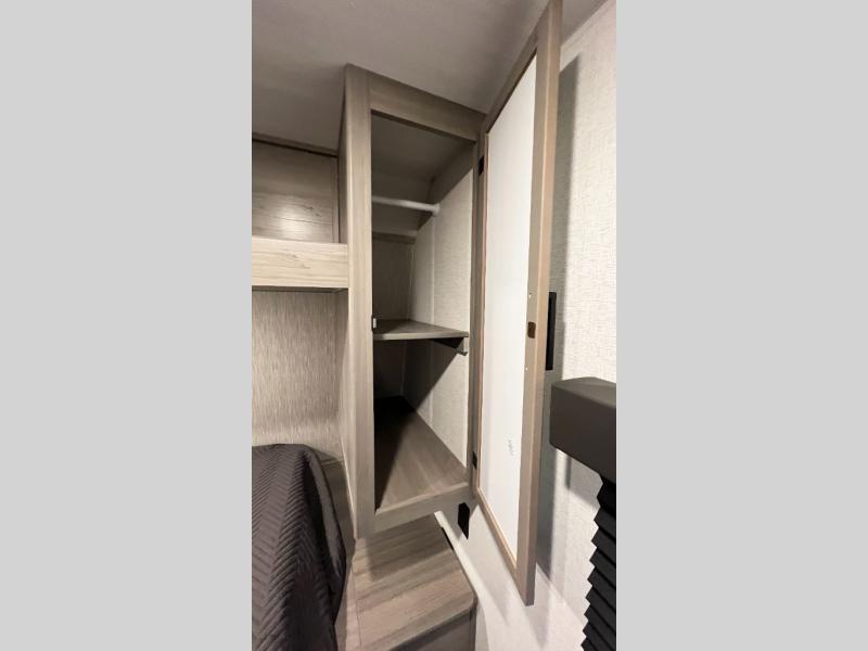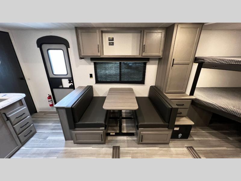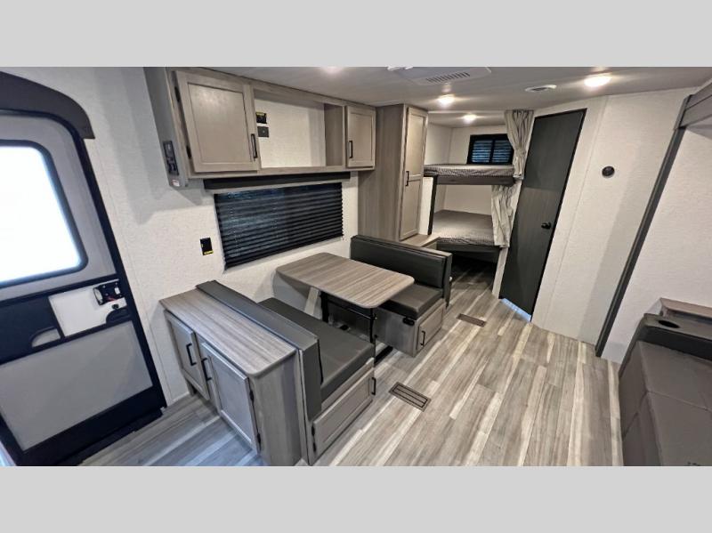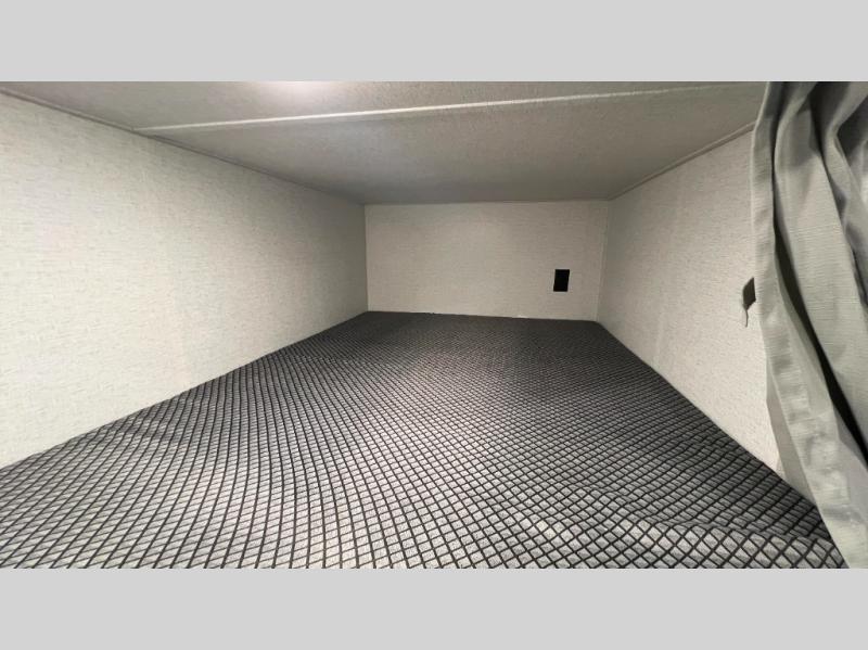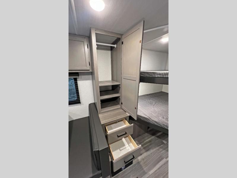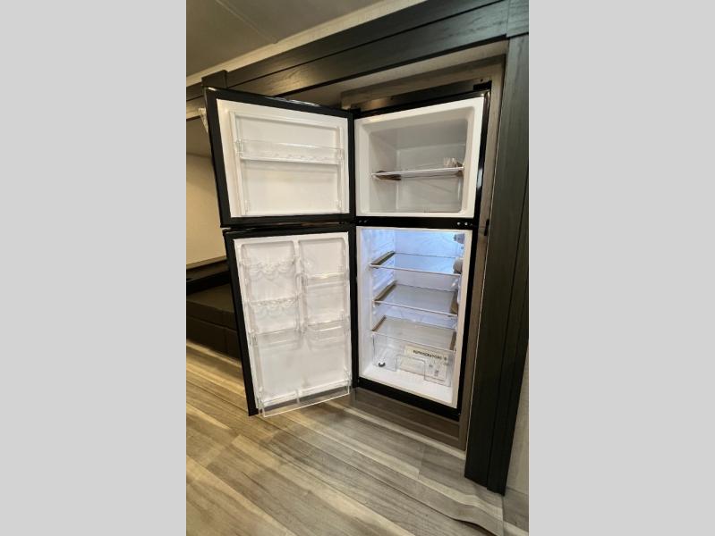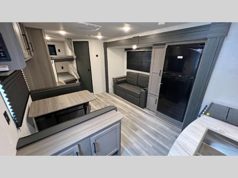 If you've been searching for a travel trailer with more space and a larger sleeping capacity, your search is over! This model includes double-size bunks with a flip-up bottom bunk for the little ones or your guests, plus a large slide out in the main living area, creating an open concept layout. The chef of your group can make meals on the three burner cooktop, and perishables can be kept in the 10 cu. ft. 12V refrigerator. A walk-around queen bed in the front bedroom will make this space feel more like home, and you'll enjoy dual closets and nightstands for your belongings. And don't forget to throw your dirty clothes in the convenient laundry chute!