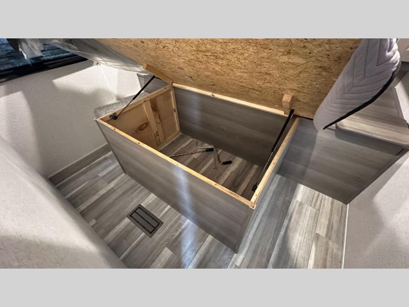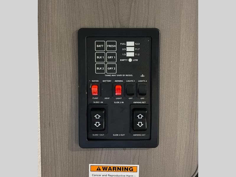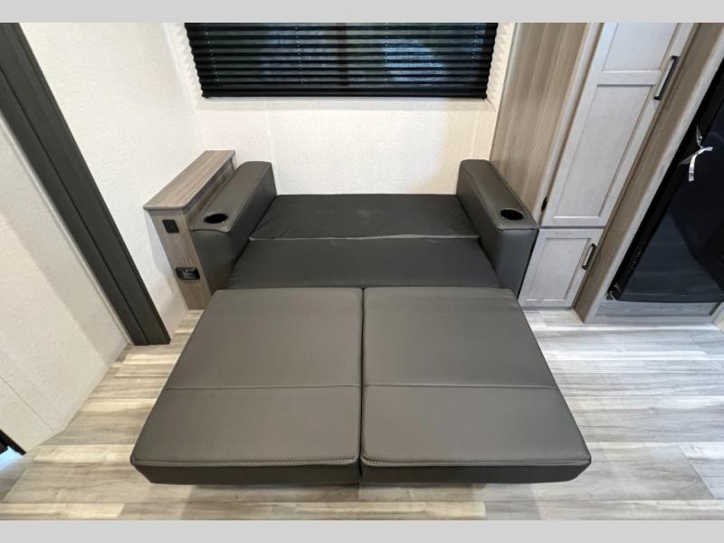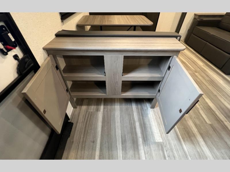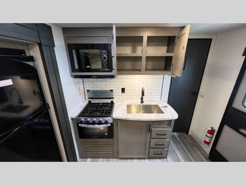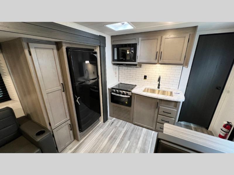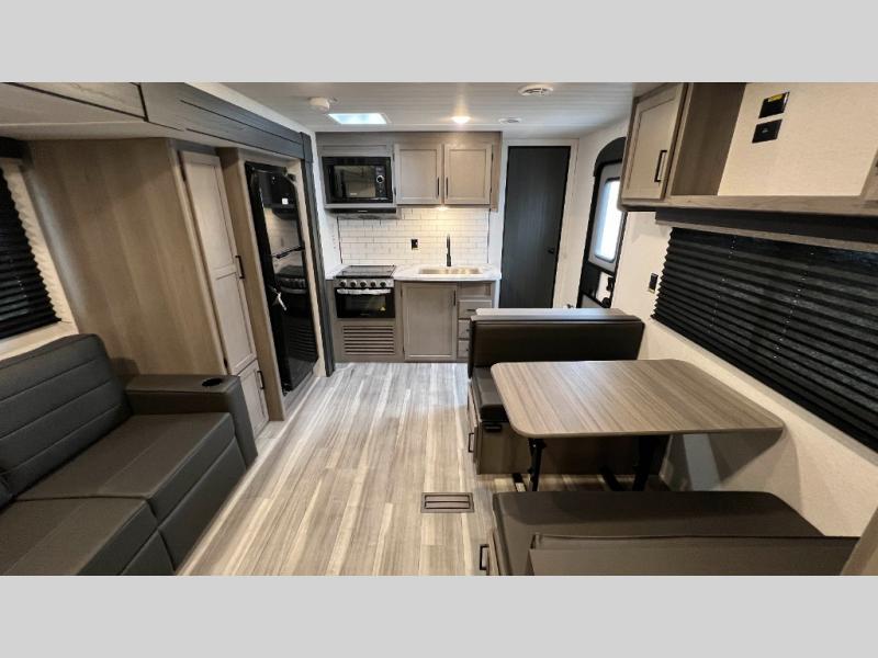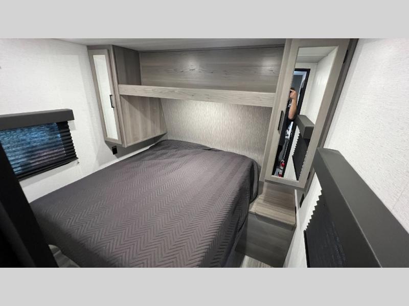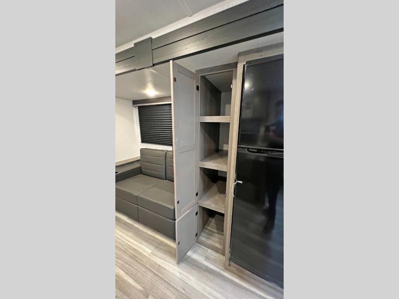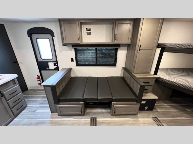 If you've been searching for a travel trailer with more space and a larger sleeping capacity, your search is over! This model includes double-size bunks with a flip-up bottom bunk for the little ones or your guests, plus a large slide out in the main living area, creating an open concept layout. The chef of your group can make meals on the three burner cooktop, and perishables can be kept in the 10 cu. ft. 12V refrigerator. A walk-around queen bed in the front bedroom will make this space feel more like home, and you'll enjoy dual closets and nightstands for your belongings. And don't forget to throw your dirty clothes in the convenient laundry chute!