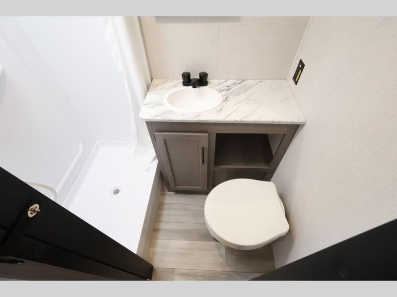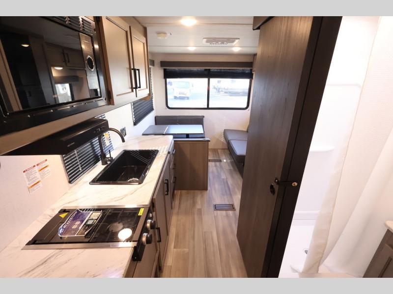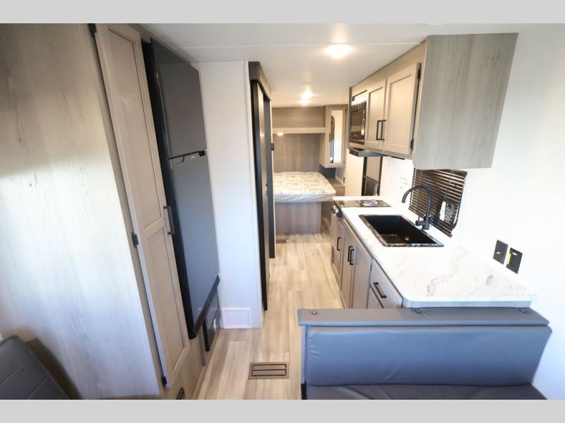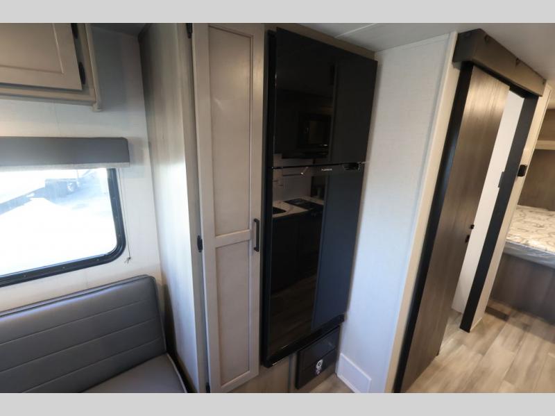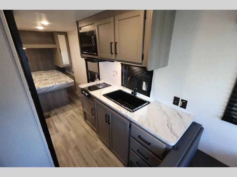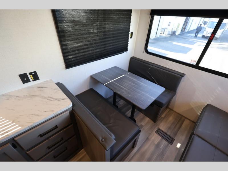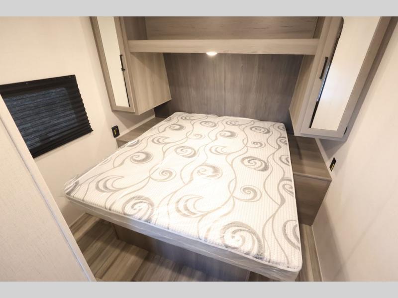 This is the perfect starter travel trailer since it includes everything you need while you're away from home. You'll enjoy the queen bed in the front bedroom with underbed storage and nightstands for your things, plus a full bath on board so you won't have to use the camp's facilities. This model includes a two burner cooktop that will allow you to cook meals each day, and there is a pantry and a 10 cu. ft. 12V refrigerator for food storage! A booth dinette in the back provides a place to dine and the sofa will be perfect to relax on after a day outdoors. And these pieces of furniture can double as your guests sleeping space at night!