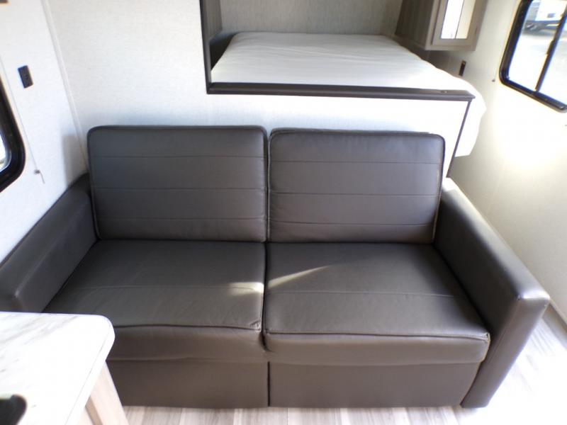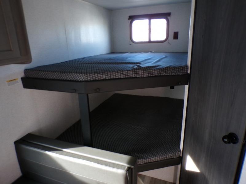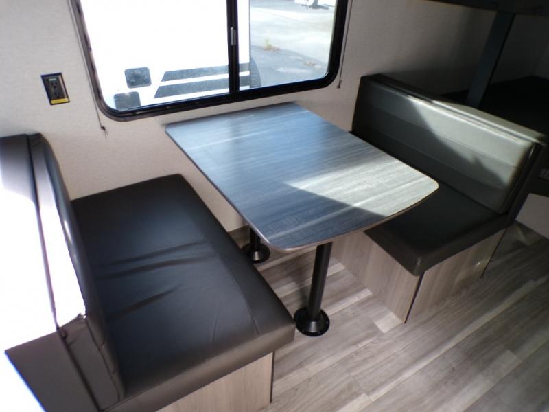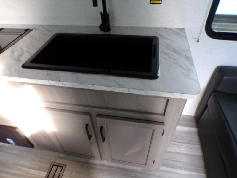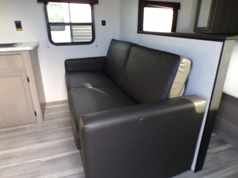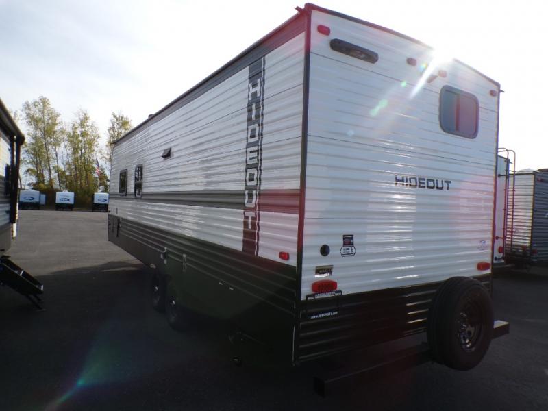 If you're looking for a travel trailer with a little more sleeping space, look no further than this Hideout Sport! There are double-size bunks with inside and outside storage, a walk-around queen bed in the front bedroom, plus a sofa and booth dinette for even more sleeping space. The kitchen comes with a two burner cooktop to cook meals on, a sink for clean up, and a 10 cu. ft. 12V refrigerator to store the milk and eggs. You will also find TV prep in this model if you enjoy movie nights while at the campground.