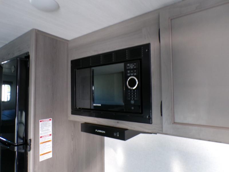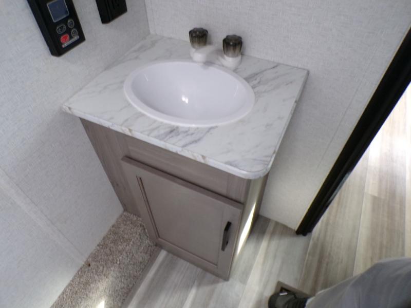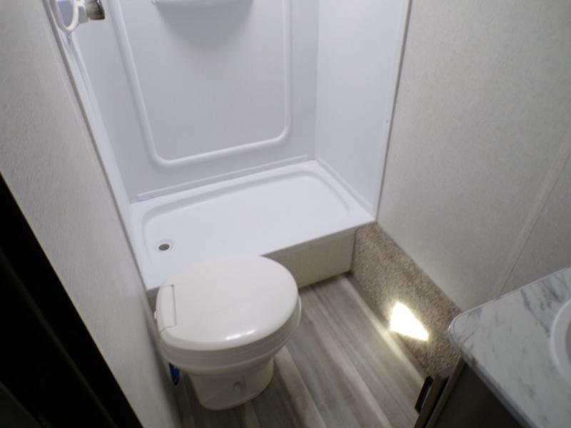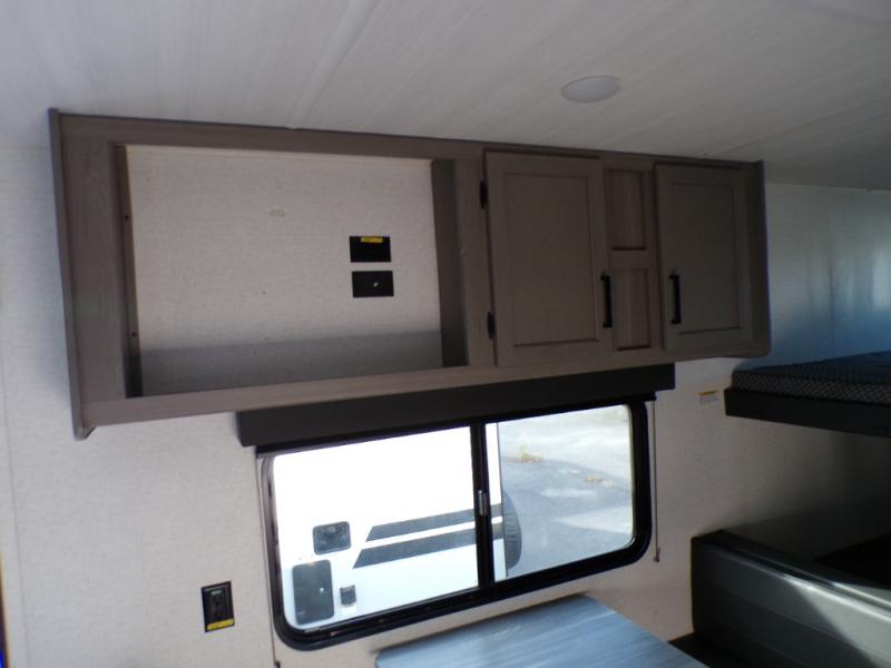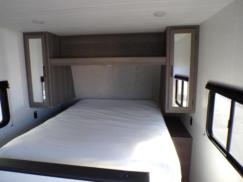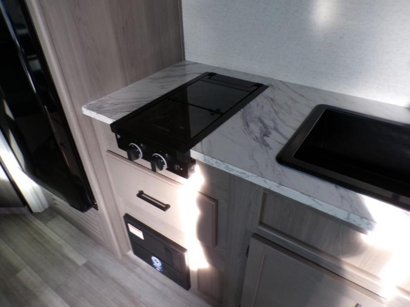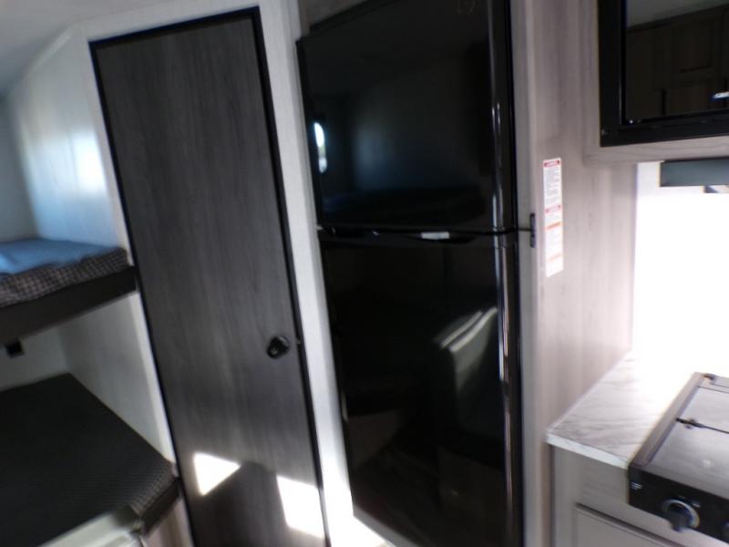 If you're looking for a travel trailer with a little more sleeping space, look no further than this Hideout Sport! There are double-size bunks with inside and outside storage, a walk-around queen bed in the front bedroom, plus a sofa and booth dinette for even more sleeping space. The kitchen comes with a two burner cooktop to cook meals on, a sink for clean up, and a 10 cu. ft. 12V refrigerator to store the milk and eggs. You will also find TV prep in this model if you enjoy movie nights while at the campground.