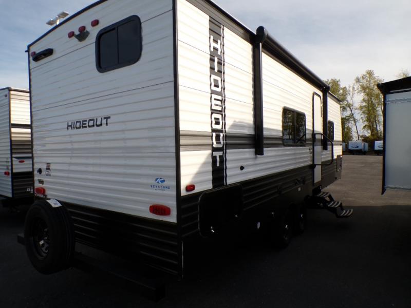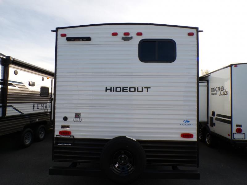 With any Hideout Sport travel trailer by Keystone you will enjoy simplified camping solutions that won't break the bank! Each model is constructed with a durable aluminum exterior, tinted safety glass windows, a walkable roof, and an I-beam frame. There are power tongue jacks and electric stabilizer jacks that will make it easier than ever to hitch up and go, and you can add the optional spare tire kit in case you have any unfortunate flats on the way to the campground. An XL entry assist handle will also provide convenience, along with a power awning that will provide much wanted shade during the day. You will feel right at home in a Hideout Sport with its stylish decor, blackout night shades, and cozy queen bed with storage underneath!