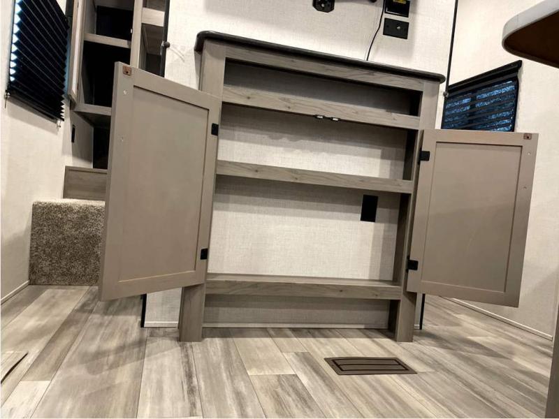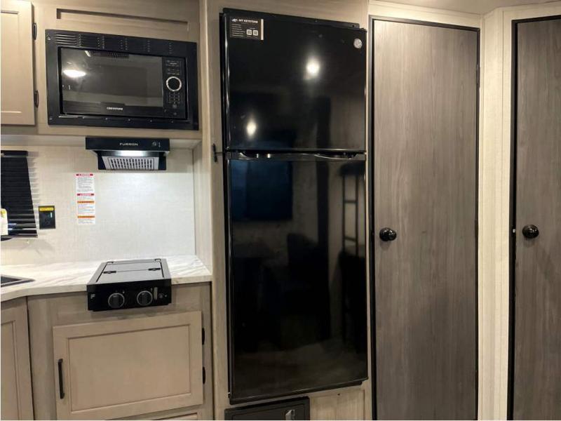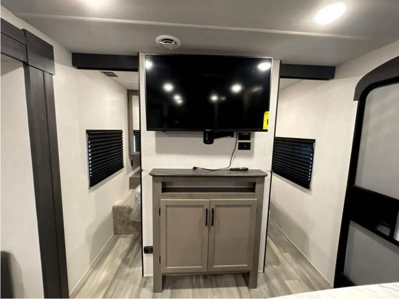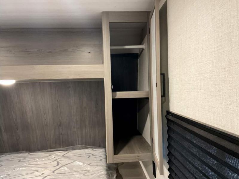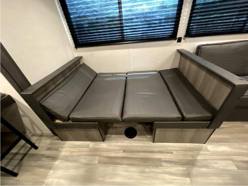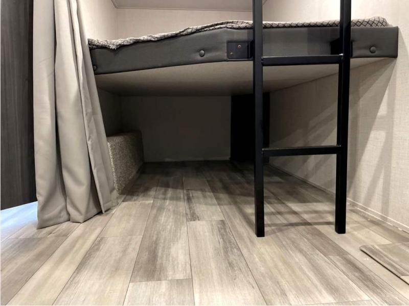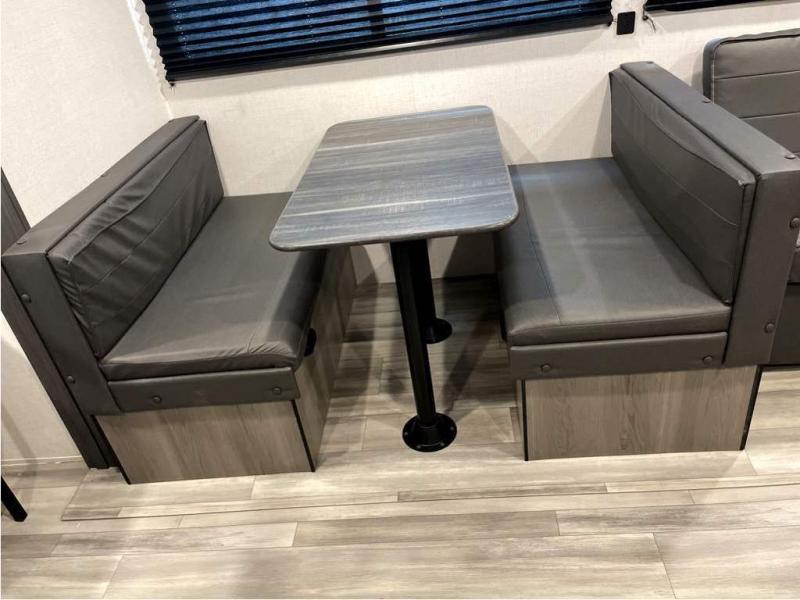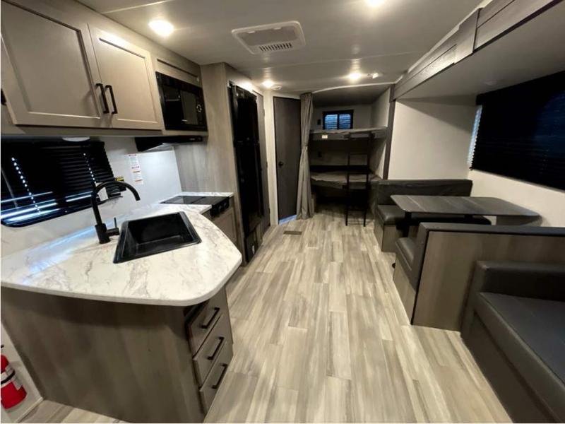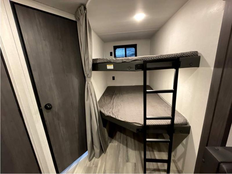 Pack your bags and head for the lake or woods in this spacious trailer! You can comfortably sleep nine to ten with the double-size bunks and the queen bed in the front private bedroom, plus the booth dinette and sofa in the main living area. There is even TV prep here if you want to add a television to the entertainment center for movie nights. The kitchen includes a 10 cu. ft. 12V refrigerator and an extra large pantry for food storage, plus a two burner cooktop to prepare meals each day. The full bath included will let you clean up after a day of exploring outdoors, and you'll find the second entry door here for convenience!