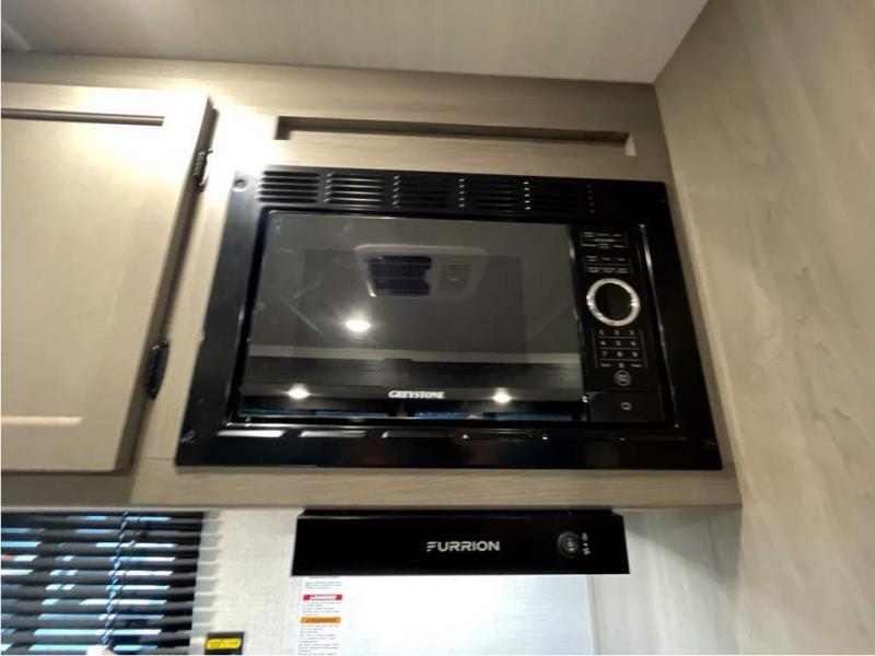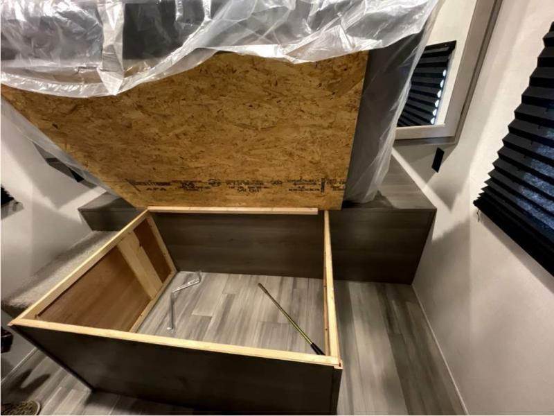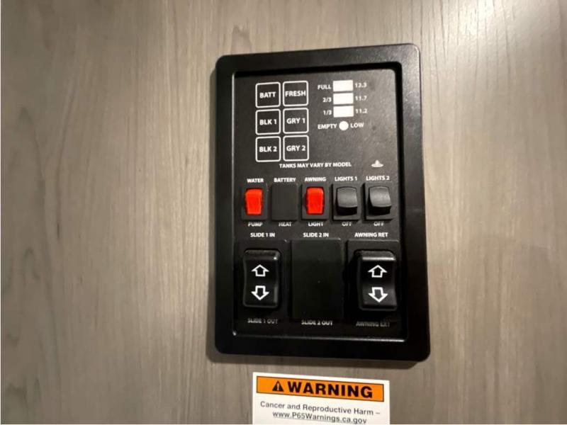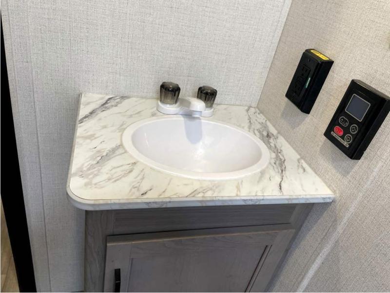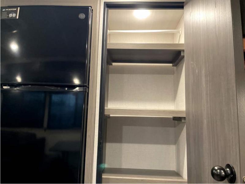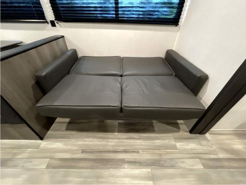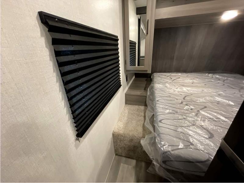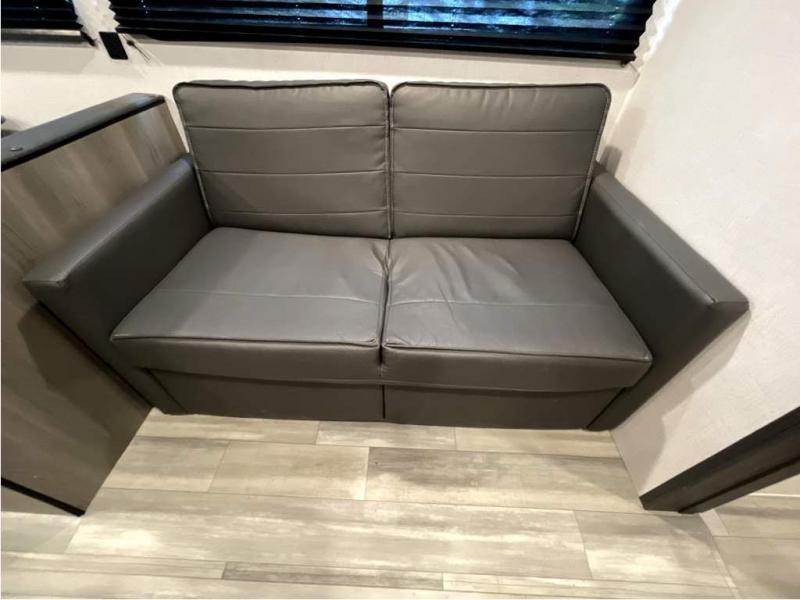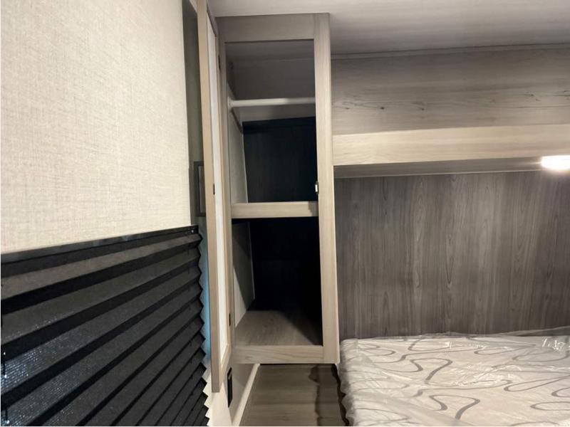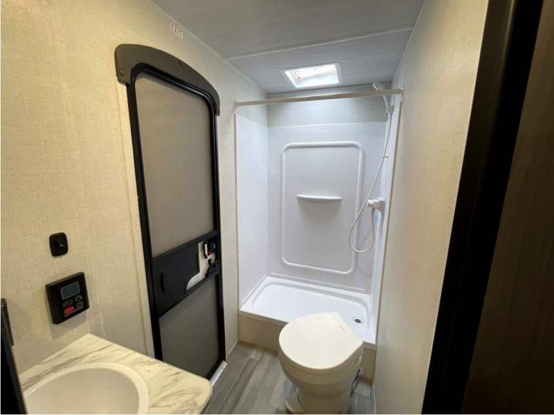 Pack your bags and head for the lake or woods in this spacious trailer! You can comfortably sleep nine to ten with the double-size bunks and the queen bed in the front private bedroom, plus the booth dinette and sofa in the main living area. There is even TV prep here if you want to add a television to the entertainment center for movie nights. The kitchen includes a 10 cu. ft. 12V refrigerator and an extra large pantry for food storage, plus a two burner cooktop to prepare meals each day. The full bath included will let you clean up after a day of exploring outdoors, and you'll find the second entry door here for convenience!
